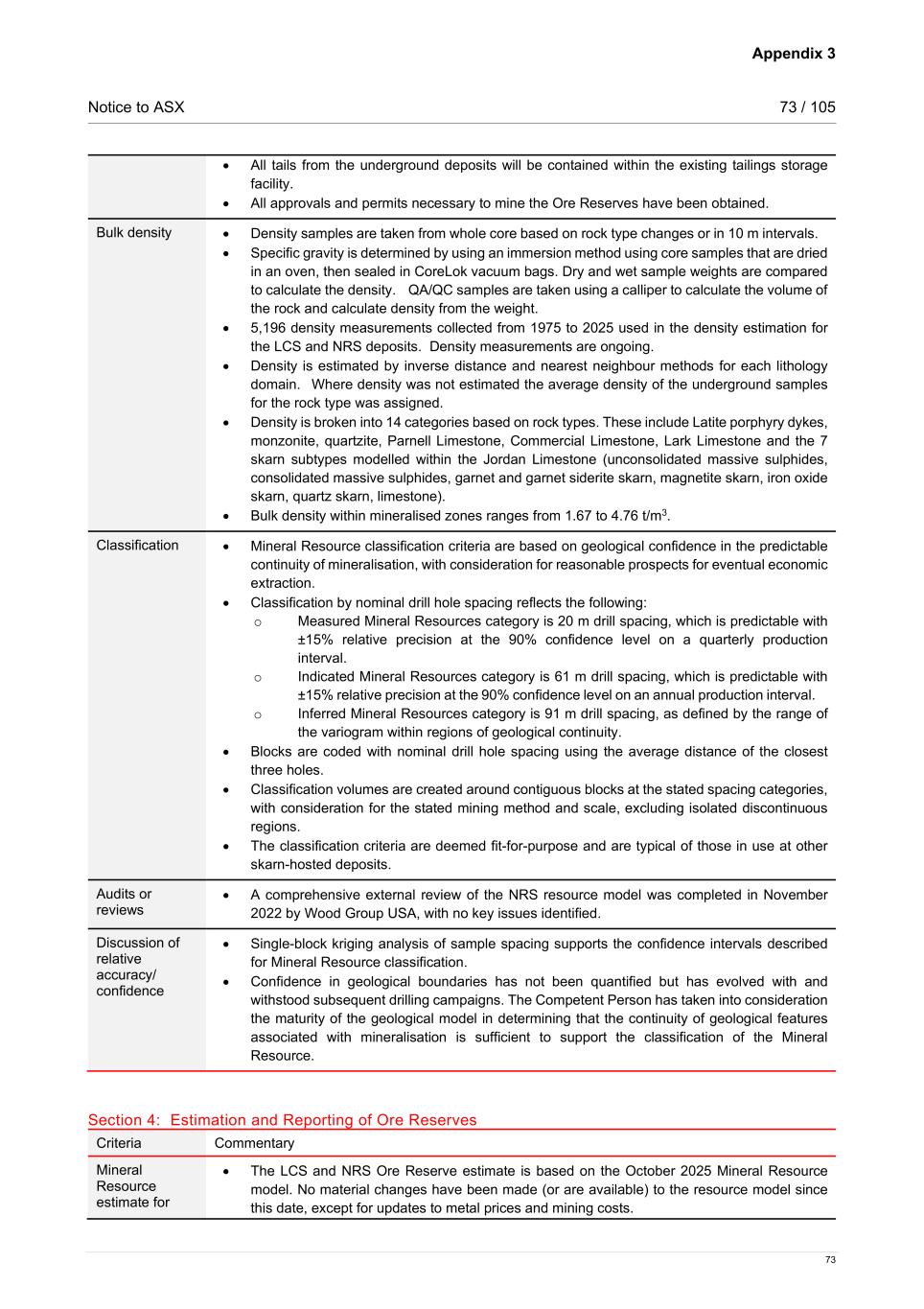 Appendix 3 Notice to ASX 73 / 105 73 • All tails from the underground deposits will be contained within the existing tailings storage facility.   • All approvals and permits necessary to mine the Ore Reserves have been obtained.  Bulk density • Density samples are taken from whole core based on rock type changes or in 10 m intervals.   • Specific gravity is determined by using an immersion method using core samples that are dried in an oven, then sealed in CoreLok vacuum bags. Dry and wet sample weights are compared to calculate the density.    QA/QC samples are taken using a calliper to calculate the volume of the rock and calculate density from the weight. • 5,196 density measurements collected from 1975 to 2025 used in the density estimation for the LCS and NRS deposits. Density measurements are ongoing. • Density is estimated by inverse distance and nearest neighbour methods for each lithology domain.  Where density was not estimated the average density of the underground samples for the rock type was assigned. • Density is broken into 14 categories based on rock types. These include Latite porphyry dykes, monzonite, quartzite, Parnell Limestone, Commercial Limestone, Lark Limestone and the 7 skarn subtypes modelled within the Jordan Limestone (unconsolidated massive sulphides, consolidated massive sulphides, garnet and garnet siderite skarn, magnetite skarn, iron oxide skarn, quartz skarn, limestone). • Bulk density within mineralised zones ranges from 1.67 to 4.76 t/m3. Classification • Mineral Resource classification criteria are based on geological confidence in the predictable continuity of mineralisation, with consideration for reasonable prospects for eventual economic extraction.   • Classification by nominal drill hole spacing reflects the following:  o Measured Mineral Resources category is 20 m drill spacing, which is predictable with ±15% relative precision at the 90% confidence level on a quarterly production interval.    o Indicated Mineral Resources category is 61 m drill spacing, which is predictable with ±15% relative precision at the 90% confidence level on an annual production interval.    o Inferred Mineral Resources category is 91 m drill spacing, as defined by the range of the variogram within regions of geological continuity.  • Blocks are coded with nominal drill hole spacing using the average distance of the closest three holes.   • Classification volumes are created around contiguous blocks at the stated spacing categories, with consideration for the stated mining method and scale, excluding isolated discontinuous regions.  • The classification criteria are deemed fit-for-purpose and are typical of those in use at other skarn-hosted deposits.   Audits or reviews • A comprehensive external review of the NRS resource model was completed in November 2022 by Wood Group USA, with no key issues identified.   Discussion of relative accuracy/ confidence • Single-block kriging analysis of sample spacing supports the confidence intervals described for Mineral Resource classification.  • Confidence in geological boundaries has not been quantified but has evolved with and withstood subsequent drilling campaigns. The Competent Person has taken into consideration the maturity of the geological model in determining that the continuity of geological features associated with mineralisation is sufficient to support the classification of the Mineral Resource.  Section 4: Estimation and Reporting of Ore Reserves Criteria Commentary Mineral Resource estimate for • The LCS and NRS Ore Reserve estimate is based on the October 2025 Mineral Resource model. No material changes have been made (or are available) to the resource model since this date, except for updates to metal prices and mining costs.