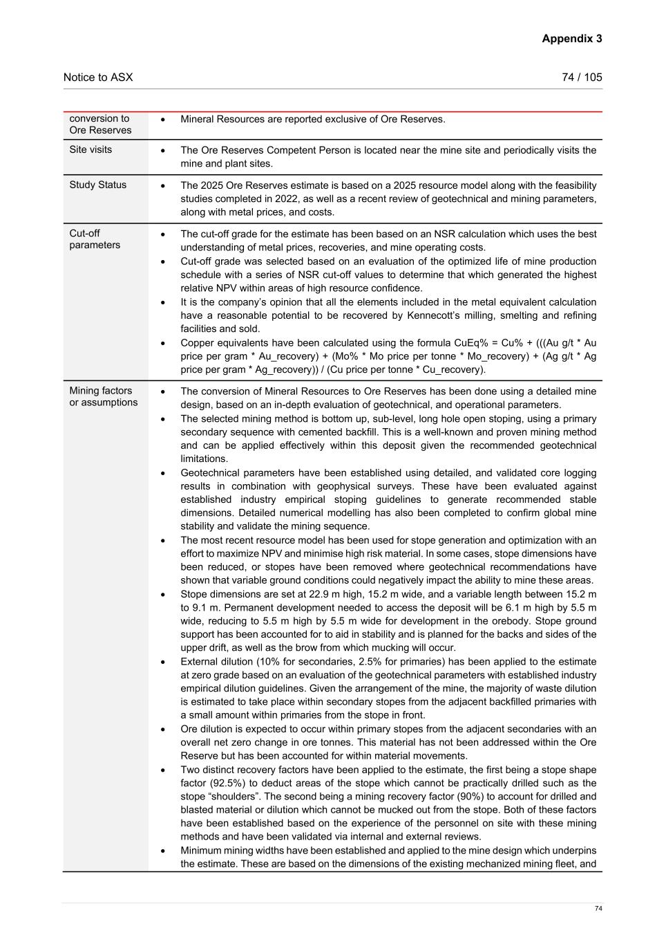 Appendix 3 Notice to ASX 74 / 105 74 conversion to Ore Reserves • Mineral Resources are reported exclusive of Ore Reserves. Site visits • The Ore Reserves Competent Person is located near the mine site and periodically visits the mine and plant sites. Study Status • The 2025 Ore Reserves estimate is based on a 2025 resource model along with the feasibility studies completed in 2022, as well as a recent review of geotechnical and mining parameters, along with metal prices, and costs. Cut-off parameters • The cut-off grade for the estimate has been based on an NSR calculation which uses the best understanding of metal prices, recoveries, and mine operating costs. • Cut-off grade was selected based on an evaluation of the optimized life of mine production schedule with a series of NSR cut-off values to determine that which generated the highest relative NPV within areas of high resource confidence. • It is the company’s opinion that all the elements included in the metal equivalent calculation have a reasonable potential to be recovered by Kennecott’s milling, smelting and refining facilities and sold. • Copper equivalents have been calculated using the formula CuEq% = Cu% + (((Au g/t * Au price per gram * Au_recovery) + (Mo% * Mo price per tonne * Mo_recovery) + (Ag g/t * Ag price per gram * Ag_recovery)) / (Cu price per tonne * Cu_recovery). Mining factors or assumptions • The conversion of Mineral Resources to Ore Reserves has been done using a detailed mine design, based on an in-depth evaluation of geotechnical, and operational parameters. • The selected mining method is bottom up, sub-level, long hole open stoping, using a primary secondary sequence with cemented backfill. This is a well-known and proven mining method and can be applied effectively within this deposit given the recommended geotechnical limitations. • Geotechnical parameters have been established using detailed, and validated core logging results in combination with geophysical surveys. These have been evaluated against established industry empirical stoping guidelines to generate recommended stable dimensions. Detailed numerical modelling has also been completed to confirm global mine stability and validate the mining sequence. • The most recent resource model has been used for stope generation and optimization with an effort to maximize NPV and minimise high risk material. In some cases, stope dimensions have been reduced, or stopes have been removed where geotechnical recommendations have shown that variable ground conditions could negatively impact the ability to mine these areas. • Stope dimensions are set at 22.9 m high, 15.2 m wide, and a variable length between 15.2 m to 9.1 m. Permanent development needed to access the deposit will be 6.1 m high by 5.5 m wide, reducing to 5.5 m high by 5.5 m wide for development in the orebody. Stope ground support has been accounted for to aid in stability and is planned for the backs and sides of the upper drift, as well as the brow from which mucking will occur. • External dilution (10% for secondaries, 2.5% for primaries) has been applied to the estimate at zero grade based on an evaluation of the geotechnical parameters with established industry empirical dilution guidelines. Given the arrangement of the mine, the majority of waste dilution is estimated to take place within secondary stopes from the adjacent backfilled primaries with a small amount within primaries from the stope in front. • Ore dilution is expected to occur within primary stopes from the adjacent secondaries with an overall net zero change in ore tonnes. This material has not been addressed within the Ore Reserve but has been accounted for within material movements. • Two distinct recovery factors have been applied to the estimate, the first being a stope shape factor (92.5%) to deduct areas of the stope which cannot be practically drilled such as the stope “shoulders”. The second being a mining recovery factor (90%) to account for drilled and blasted material or dilution which cannot be mucked out from the stope. Both of these factors have been established based on the experience of the personnel on site with these mining methods and have been validated via internal and external reviews. • Minimum mining widths have been established and applied to the mine design which underpins the estimate. These are based on the dimensions of the existing mechanized mining fleet, and