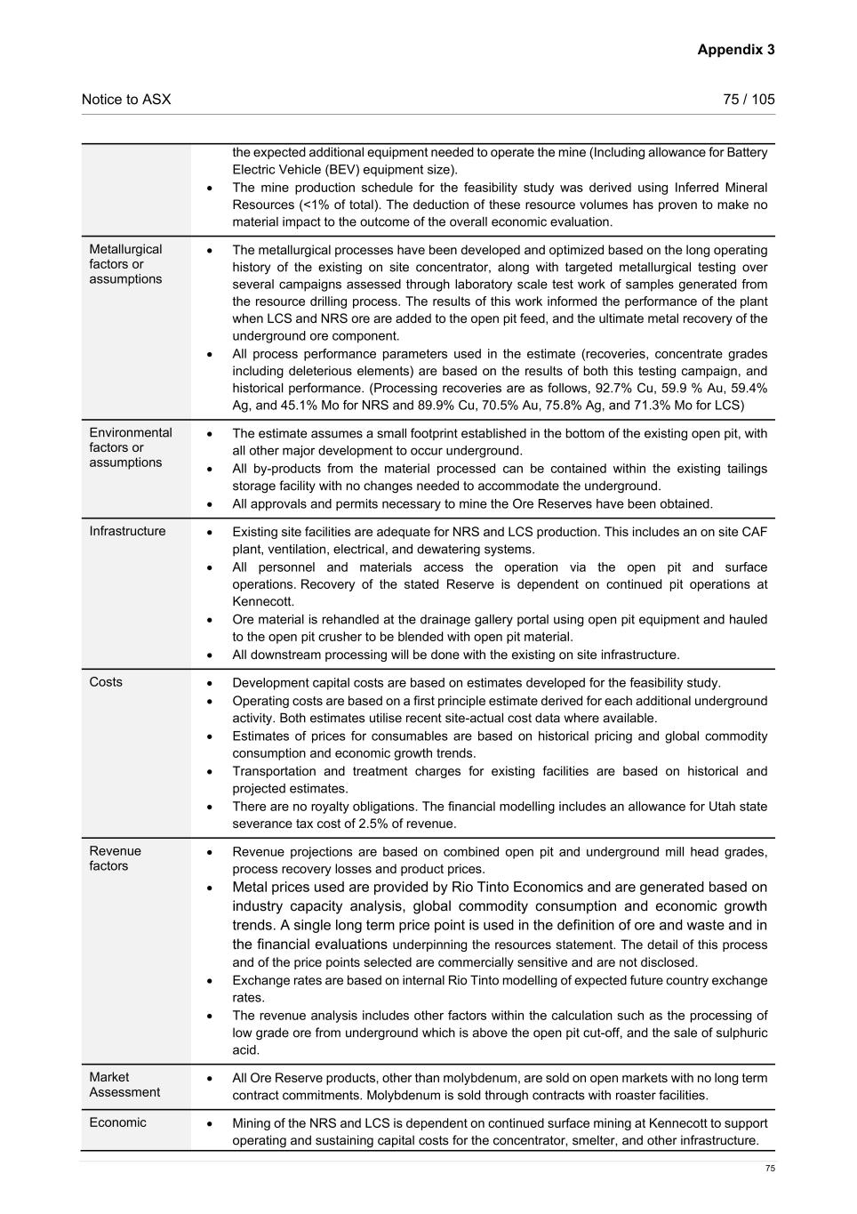 Appendix 3 Notice to ASX 75 / 105 75 the expected additional equipment needed to operate the mine (Including allowance for Battery Electric Vehicle (BEV) equipment size). • The mine production schedule for the feasibility study was derived using Inferred Mineral Resources (<1% of total). The deduction of these resource volumes has proven to make no material impact to the outcome of the overall economic evaluation. Metallurgical factors or assumptions • The metallurgical processes have been developed and optimized based on the long operating history of the existing on site concentrator, along with targeted metallurgical testing over several campaigns assessed through laboratory scale test work of samples generated from the resource drilling process. The results of this work informed the performance of the plant when LCS and NRS ore are added to the open pit feed, and the ultimate metal recovery of the underground ore component. • All process performance parameters used in the estimate (recoveries, concentrate grades including deleterious elements) are based on the results of both this testing campaign, and historical performance. (Processing recoveries are as follows, 92.7% Cu, 59.9 % Au, 59.4% Ag, and 45.1% Mo for NRS and 89.9% Cu, 70.5% Au, 75.8% Ag, and 71.3% Mo for LCS) Environmental factors or assumptions • The estimate assumes a small footprint established in the bottom of the existing open pit, with all other major development to occur underground. • All by-products from the material processed can be contained within the existing tailings storage facility with no changes needed to accommodate the underground. • All approvals and permits necessary to mine the Ore Reserves have been obtained. Infrastructure • Existing site facilities are adequate for NRS and LCS production. This includes an on site CAF plant, ventilation, electrical, and dewatering systems. • All personnel and materials access the operation via the open pit and surface operations. Recovery of the stated Reserve is dependent on continued pit operations at Kennecott. • Ore material is rehandled at the drainage gallery portal using open pit equipment and hauled to the open pit crusher to be blended with open pit material. • All downstream processing will be done with the existing on site infrastructure. Costs • Development capital costs are based on estimates developed for the feasibility study. • Operating costs are based on a first principle estimate derived for each additional underground activity. Both estimates utilise recent site-actual cost data where available. • Estimates of prices for consumables are based on historical pricing and global commodity consumption and economic growth trends. • Transportation and treatment charges for existing facilities are based on historical and projected estimates. • There are no royalty obligations. The financial modelling includes an allowance for Utah state severance tax cost of 2.5% of revenue. Revenue factors • Revenue projections are based on combined open pit and underground mill head grades, process recovery losses and product prices. • Metal prices used are provided by Rio Tinto Economics and are generated based on industry capacity analysis, global commodity consumption and economic growth trends. A single long term price point is used in the definition of ore and waste and in the financial evaluations underpinning the resources statement. The detail of this process and of the price points selected are commercially sensitive and are not disclosed. • Exchange rates are based on internal Rio Tinto modelling of expected future country exchange rates. • The revenue analysis includes other factors within the calculation such as the processing of low grade ore from underground which is above the open pit cut-off, and the sale of sulphuric acid. Market Assessment • All Ore Reserve products, other than molybdenum, are sold on open markets with no long term contract commitments. Molybdenum is sold through contracts with roaster facilities. Economic • Mining of the NRS and LCS is dependent on continued surface mining at Kennecott to support operating and sustaining capital costs for the concentrator, smelter, and other infrastructure.