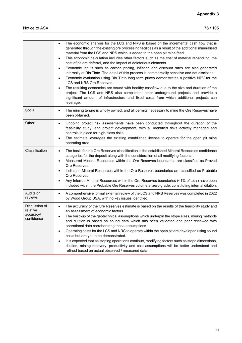 Appendix 3 Notice to ASX 76 / 105 76 • The economic analysis for the LCS and NRS is based on the incremental cash flow that is generated through the existing ore processing facilities as a result of the additional mineralised material from the LCS and NRS which is added to the open pit mine feed. • This economic calculation includes other factors such as the cost of material rehandling, the cost of pit ore deferral, and the impact of deleterious elements. • Economic inputs such as carbon pricing, inflation and discount rates are also generated internally at Rio Tinto. The detail of this process is commercially sensitive and not disclosed. • Economic evaluation using Rio Tinto long term prices demonstrates a positive NPV for the LCS and NRS Ore Reserves. • The resulting economics are sound with healthy cashflow due to the size and duration of the project. The LCS and NRS also compliment other underground projects and provide a significant amount of infrastructure and fixed costs from which additional projects can leverage. Social • The mining tenure is wholly owned, and all permits necessary to mine the Ore Reserves have been obtained. Other • Ongoing project risk assessments have been conducted throughout the duration of the feasibility study, and project development, with all identified risks actively managed and controls in place for high-class risks. • The estimate leverages the existing established license to operate for the open pit mine operating area. Classification • The basis for the Ore Reserves classification is the established Mineral Resources confidence categories for the deposit along with the consideration of all modifying factors. • Measured Mineral Resources within the Ore Reserves boundaries are classified as Proved Ore Reserves. • Indicated Mineral Resources within the Ore Reserves boundaries are classified as Probable Ore Reserves. • Any Inferred Mineral Resources within the Ore Reserves boundaries (<1% of total) have been included within the Probable Ore Reserves volume at zero grade; constituting internal dilution. Audits or reviews • A comprehensive formal external review of the LCS and NRS Reserves was completed in 2022 by Wood Group USA, with no key issues identified. Discussion of relative accuracy/ confidence • The accuracy of the Ore Reserves estimate is based on the results of the feasibility study and an assessment of economic factors. • The build-up of the geotechnical assumptions which underpin the stope sizes, mining methods and dilution is based on sound data which has been validated and peer reviewed with operational data corroborating these assumptions. • Operating costs for the LCS and NRS to operate within the open pit are developed using sound basis but are yet to be demonstrated. • It is expected that as stoping operations continue, modifying factors such as stope dimensions, dilution, mining recovery, productivity and cost assumptions will be better understood and refined based on actual observed / measured data.