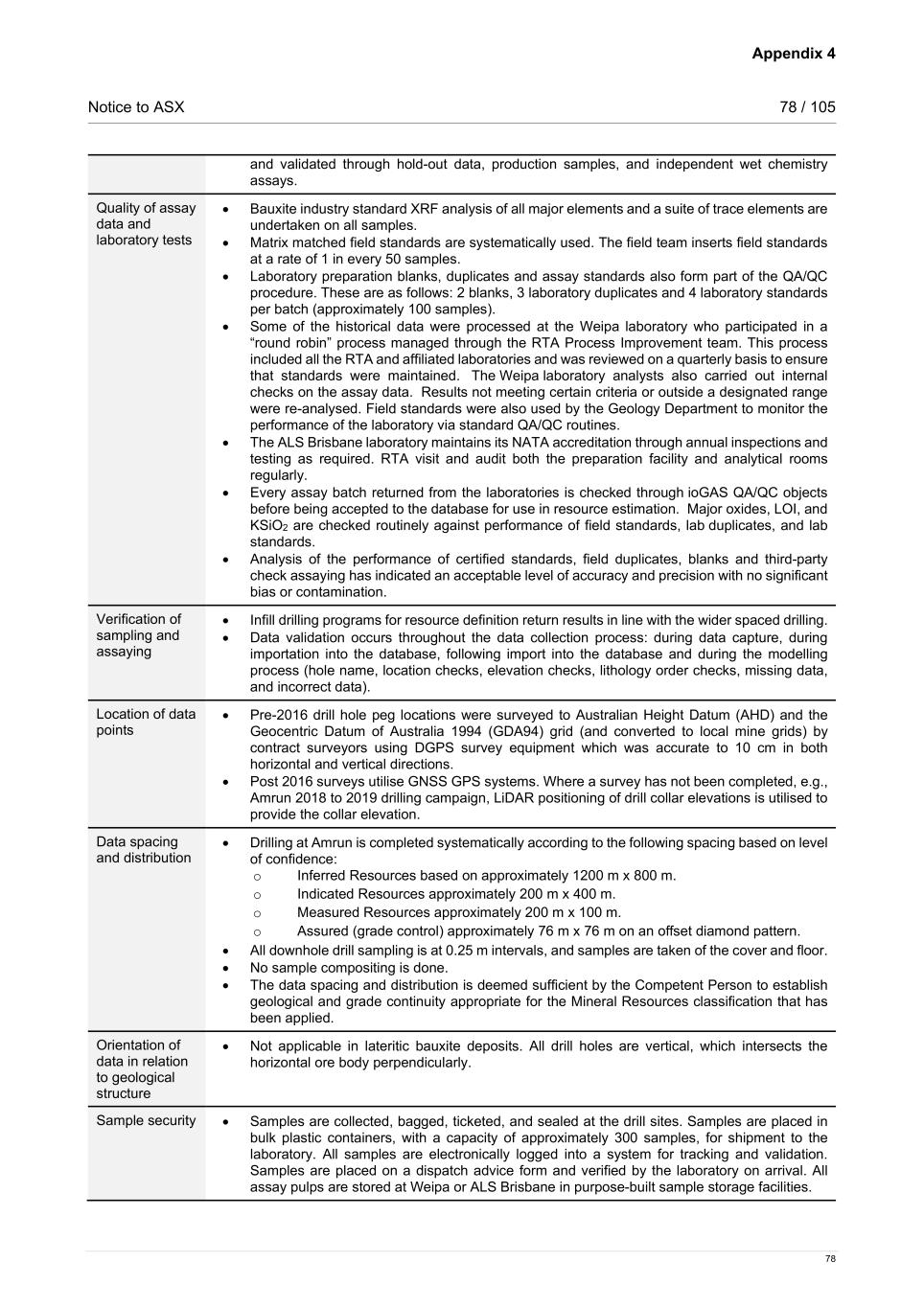 Appendix 4 Notice to ASX 78 / 105 78 and validated through hold-out data, production samples, and independent wet chemistry assays. Quality of assay data and laboratory tests • Bauxite industry standard XRF analysis of all major elements and a suite of trace elements are undertaken on all samples. • Matrix matched field standards are systematically used. The field team inserts field standards at a rate of 1 in every 50 samples. • Laboratory preparation blanks, duplicates and assay standards also form part of the QA/QC procedure. These are as follows: 2 blanks, 3 laboratory duplicates and 4 laboratory standards per batch (approximately 100 samples). • Some of the historical data were processed at the Weipa laboratory who participated in a “round robin” process managed through the RTA Process Improvement team. This process included all the RTA and affiliated laboratories and was reviewed on a quarterly basis to ensure that standards were maintained. The Weipa laboratory analysts also carried out internal checks on the assay data. Results not meeting certain criteria or outside a designated range were re-analysed. Field standards were also used by the Geology Department to monitor the performance of the laboratory via standard QA/QC routines. • The ALS Brisbane laboratory maintains its NATA accreditation through annual inspections and testing as required. RTA visit and audit both the preparation facility and analytical rooms regularly. • Every assay batch returned from the laboratories is checked through ioGAS QA/QC objects before being accepted to the database for use in resource estimation. Major oxides, LOI, and KSiO2 are checked routinely against performance of field standards, lab duplicates, and lab standards. • Analysis of the performance of certified standards, field duplicates, blanks and third-party check assaying has indicated an acceptable level of accuracy and precision with no significant bias or contamination. Verification of sampling and assaying • Infill drilling programs for resource definition return results in line with the wider spaced drilling. • Data validation occurs throughout the data collection process: during data capture, during importation into the database, following import into the database and during the modelling process (hole name, location checks, elevation checks, lithology order checks, missing data, and incorrect data). Location of data points • Pre-2016 drill hole peg locations were surveyed to Australian Height Datum (AHD) and the Geocentric Datum of Australia 1994 (GDA94) grid (and converted to local mine grids) by contract surveyors using DGPS survey equipment which was accurate to 10 cm in both horizontal and vertical directions. • Post 2016 surveys utilise GNSS GPS systems. Where a survey has not been completed, e.g., Amrun 2018 to 2019 drilling campaign, LiDAR positioning of drill collar elevations is utilised to provide the collar elevation. Data spacing and distribution • Drilling at Amrun is completed systematically according to the following spacing based on level of confidence: o Inferred Resources based on approximately 1200 m x 800 m. o Indicated Resources approximately 200 m x 400 m. o Measured Resources approximately 200 m x 100 m. o Assured (grade control) approximately 76 m x 76 m on an offset diamond pattern. • All downhole drill sampling is at 0.25 m intervals, and samples are taken of the cover and floor. • No sample compositing is done. • The data spacing and distribution is deemed sufficient by the Competent Person to establish geological and grade continuity appropriate for the Mineral Resources classification that has been applied. Orientation of data in relation to geological structure • Not applicable in lateritic bauxite deposits. All drill holes are vertical, which intersects the horizontal ore body perpendicularly. Sample security • Samples are collected, bagged, ticketed, and sealed at the drill sites. Samples are placed in bulk plastic containers, with a capacity of approximately 300 samples, for shipment to the laboratory. All samples are electronically logged into a system for tracking and validation. Samples are placed on a dispatch advice form and verified by the laboratory on arrival. All assay pulps are stored at Weipa or ALS Brisbane in purpose-built sample storage facilities.
