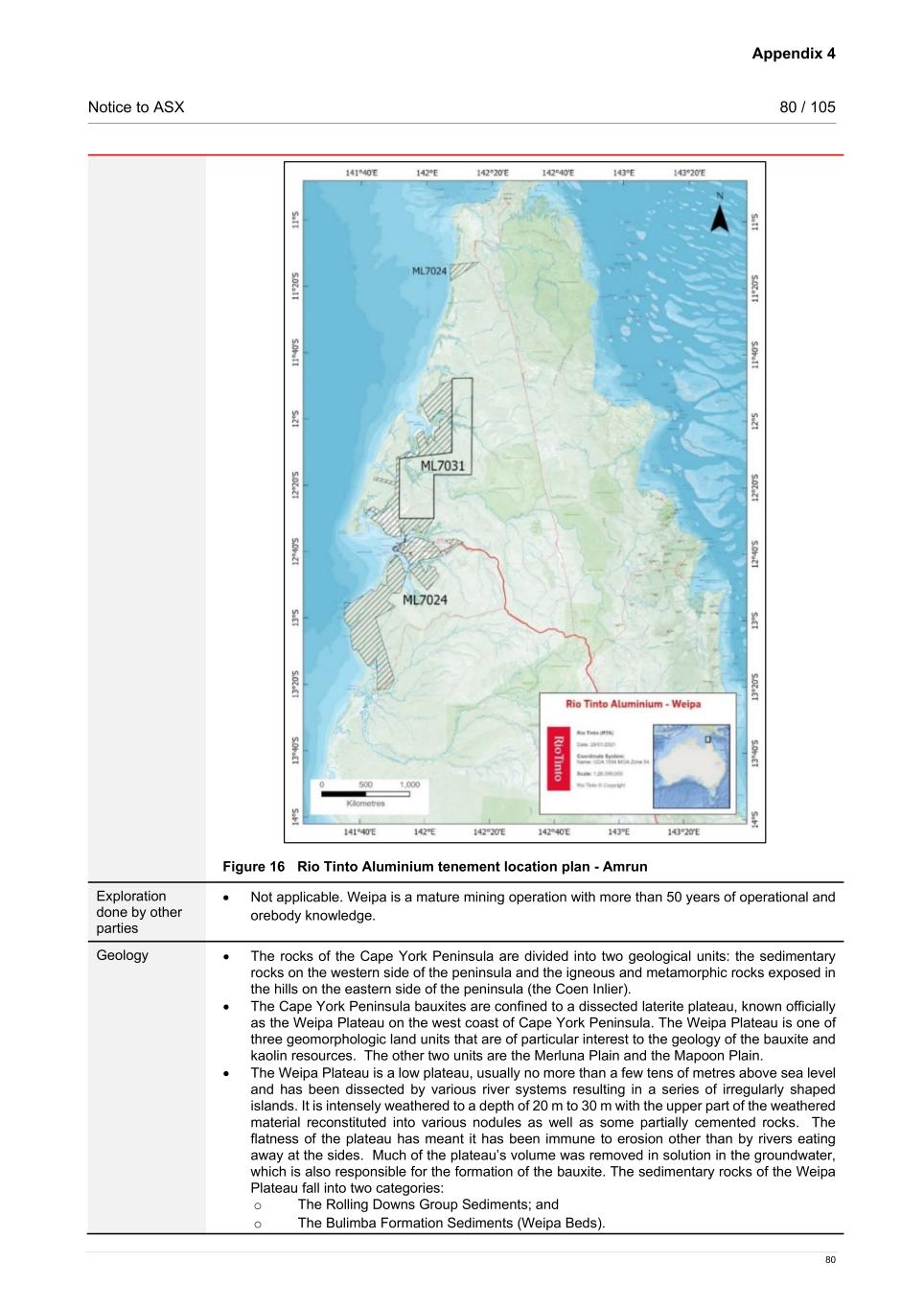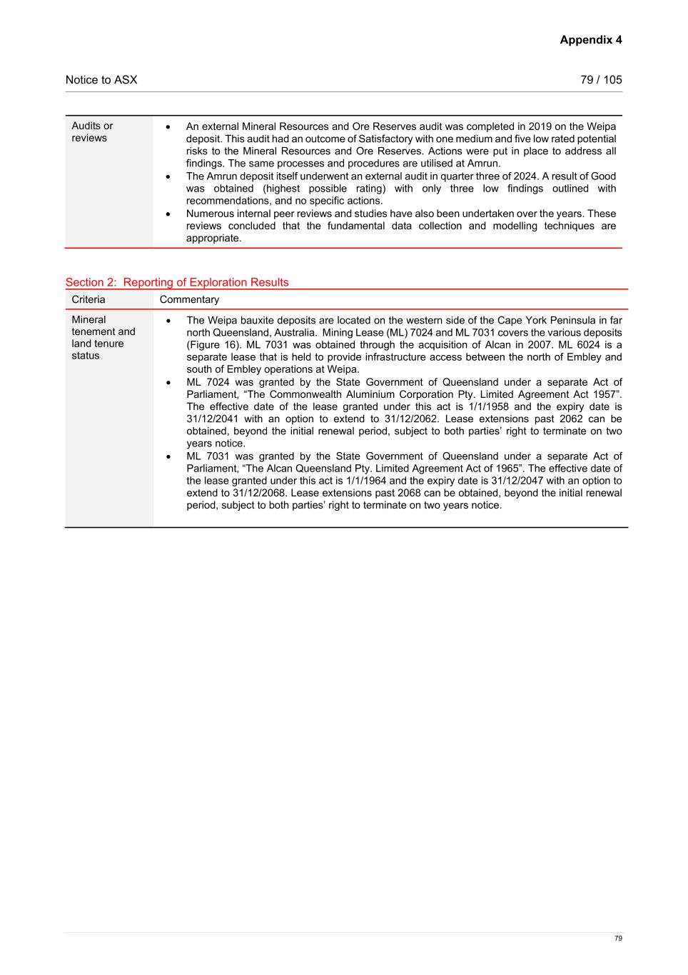 Appendix 4 Notice to ASX 79 / 105 79 Audits or reviews • An external Mineral Resources and Ore Reserves audit was completed in 2019 on the Weipa deposit. This audit had an outcome of Satisfactory with one medium and five low rated potential risks to the Mineral Resources and Ore Reserves. Actions were put in place to address all findings. The same processes and procedures are utilised at Amrun. • The Amrun deposit itself underwent an external audit in quarter three of 2024. A result of Good was obtained (highest possible rating) with only three low findings outlined with recommendations, and no specific actions. • Numerous internal peer reviews and studies have also been undertaken over the years. These reviews concluded that the fundamental data collection and modelling techniques are appropriate. Section 2: Reporting of Exploration Results Criteria Commentary Mineral tenement and land tenure status • The Weipa bauxite deposits are located on the western side of the Cape York Peninsula in far north Queensland, Australia. Mining Lease (ML) 7024 and ML 7031 covers the various deposits (Figure 16). ML 7031 was obtained through the acquisition of Alcan in 2007. ML 6024 is a separate lease that is held to provide infrastructure access between the north of Embley and south of Embley operations at Weipa. • ML 7024 was granted by the State Government of Queensland under a separate Act of Parliament, “The Commonwealth Aluminium Corporation Pty. Limited Agreement Act 1957”. The effective date of the lease granted under this act is 1/1/1958 and the expiry date is 31/12/2041 with an option to extend to 31/12/2062. Lease extensions past 2062 can be obtained, beyond the initial renewal period, subject to both parties’ right to terminate on two years notice. • ML 7031 was granted by the State Government of Queensland under a separate Act of Parliament, “The Alcan Queensland Pty. Limited Agreement Act of 1965”. The effective date of the lease granted under this act is 1/1/1964 and the expiry date is 31/12/2047 with an option to extend to 31/12/2068. Lease extensions past 2068 can be obtained, beyond the initial renewal period, subject to both parties’ right to terminate on two years notice.