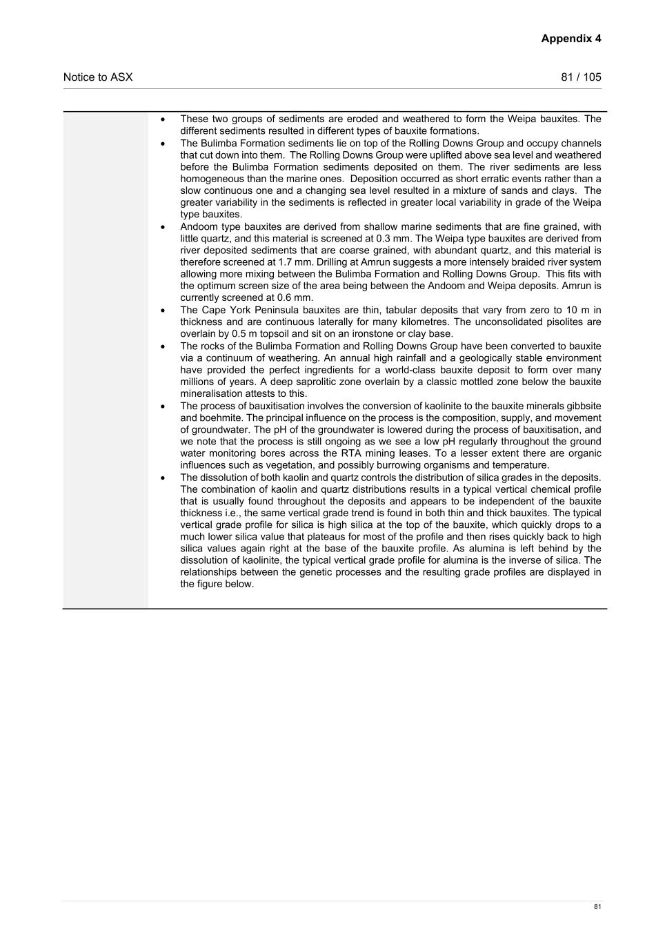 Appendix 4 Notice to ASX 81 / 105 81 • These two groups of sediments are eroded and weathered to form the Weipa bauxites. The different sediments resulted in different types of bauxite formations. • The Bulimba Formation sediments lie on top of the Rolling Downs Group and occupy channels that cut down into them. The Rolling Downs Group were uplifted above sea level and weathered before the Bulimba Formation sediments deposited on them. The river sediments are less homogeneous than the marine ones. Deposition occurred as short erratic events rather than a slow continuous one and a changing sea level resulted in a mixture of sands and clays. The greater variability in the sediments is reflected in greater local variability in grade of the Weipa type bauxites. • Andoom type bauxites are derived from shallow marine sediments that are fine grained, with little quartz, and this material is screened at 0.3 mm. The Weipa type bauxites are derived from river deposited sediments that are coarse grained, with abundant quartz, and this material is therefore screened at 1.7 mm. Drilling at Amrun suggests a more intensely braided river system allowing more mixing between the Bulimba Formation and Rolling Downs Group. This fits with the optimum screen size of the area being between the Andoom and Weipa deposits. Amrun is currently screened at 0.6 mm. • The Cape York Peninsula bauxites are thin, tabular deposits that vary from zero to 10 m in thickness and are continuous laterally for many kilometres. The unconsolidated pisolites are overlain by 0.5 m topsoil and sit on an ironstone or clay base. • The rocks of the Bulimba Formation and Rolling Downs Group have been converted to bauxite via a continuum of weathering. An annual high rainfall and a geologically stable environment have provided the perfect ingredients for a world-class bauxite deposit to form over many millions of years. A deep saprolitic zone overlain by a classic mottled zone below the bauxite mineralisation attests to this. • The process of bauxitisation involves the conversion of kaolinite to the bauxite minerals gibbsite and boehmite. The principal influence on the process is the composition, supply, and movement of groundwater. The pH of the groundwater is lowered during the process of bauxitisation, and we note that the process is still ongoing as we see a low pH regularly throughout the ground water monitoring bores across the RTA mining leases. To a lesser extent there are organic influences such as vegetation, and possibly burrowing organisms and temperature. • The dissolution of both kaolin and quartz controls the distribution of silica grades in the deposits. The combination of kaolin and quartz distributions results in a typical vertical chemical profile that is usually found throughout the deposits and appears to be independent of the bauxite thickness i.e., the same vertical grade trend is found in both thin and thick bauxites. The typical vertical grade profile for silica is high silica at the top of the bauxite, which quickly drops to a much lower silica value that plateaus for most of the profile and then rises quickly back to high silica values again right at the base of the bauxite profile. As alumina is left behind by the dissolution of kaolinite, the typical vertical grade profile for alumina is the inverse of silica. The relationships between the genetic processes and the resulting grade profiles are displayed in the figure below.
