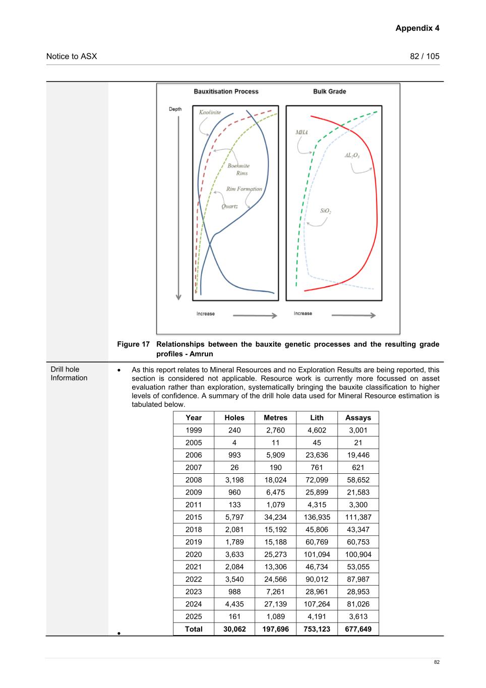 Appendix 4 Notice to ASX 82 / 105 82 Figure 17 Relationships between the bauxite genetic processes and the resulting grade profiles - Amrun Drill hole Information • As this report relates to Mineral Resources and no Exploration Results are being reported, this section is considered not applicable. Resource work is currently more focussed on asset evaluation rather than exploration, systematically bringing the bauxite classification to higher levels of confidence. A summary of the drill hole data used for Mineral Resource estimation is tabulated below. Year Holes Metres Lith Assays 1999 240 2,760 4,602 3,001 2005 4 11 45 21 2006 993 5,909 23,636 19,446 2007 26 190 761 621 2008 3,198 18,024 72,099 58,652 2009 960 6,475 25,899 21,583 2011 133 1,079 4,315 3,300 2015 5,797 34,234 136,935 111,387 2018 2,081 15,192 45,806 43,347 2019 1,789 15,188 60,769 60,753 2020 3,633 25,273 101,094 100,904 2021 2,084 13,306 46,734 53,055 2022 3,540 24,566 90,012 87,987 2023 988 7,261 28,961 28,953 2024 4,435 27,139 107,264 81,026 2025 161 1,089 4,191 3,613 Total 30,062 197,696 753,123 677,649 •