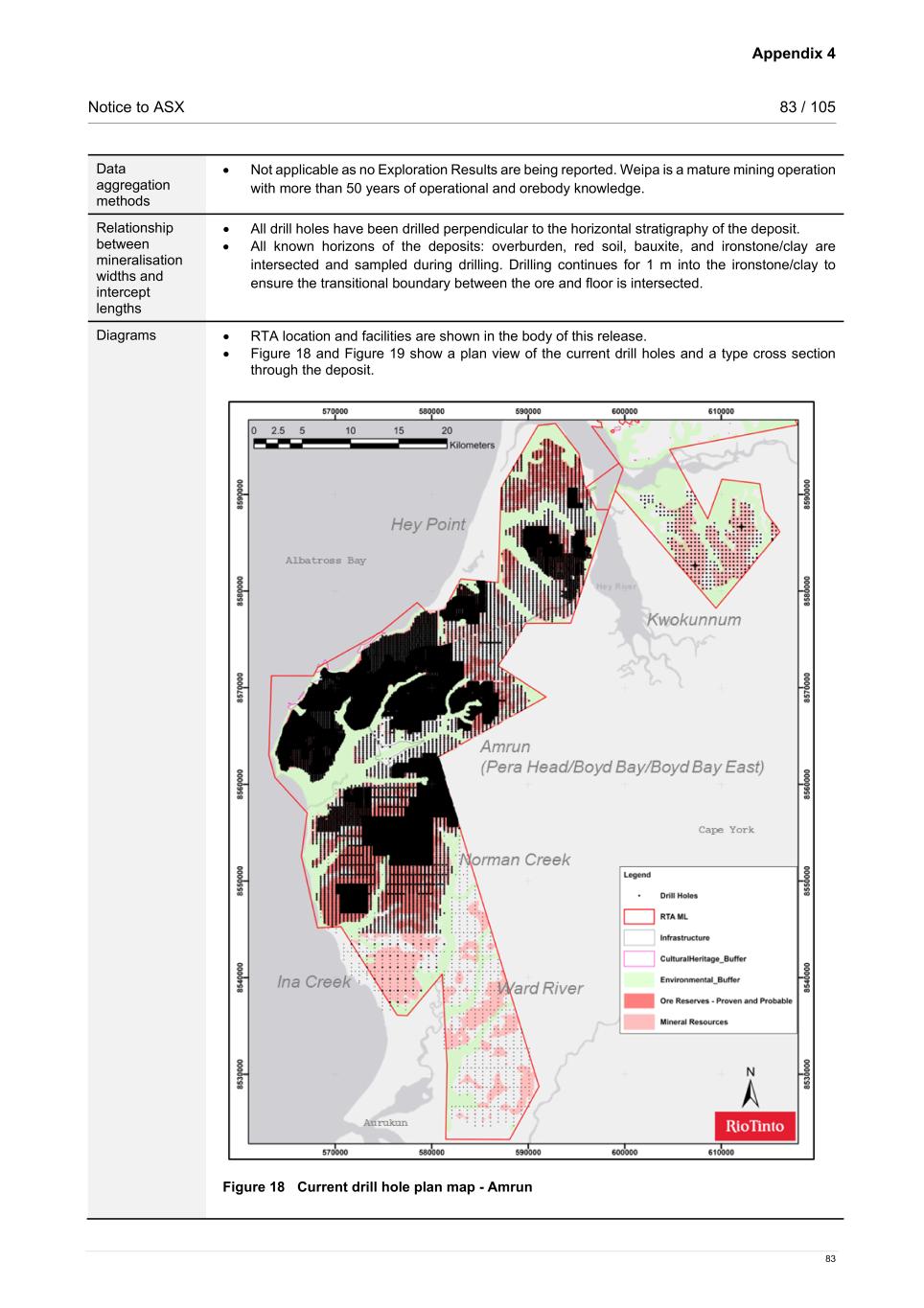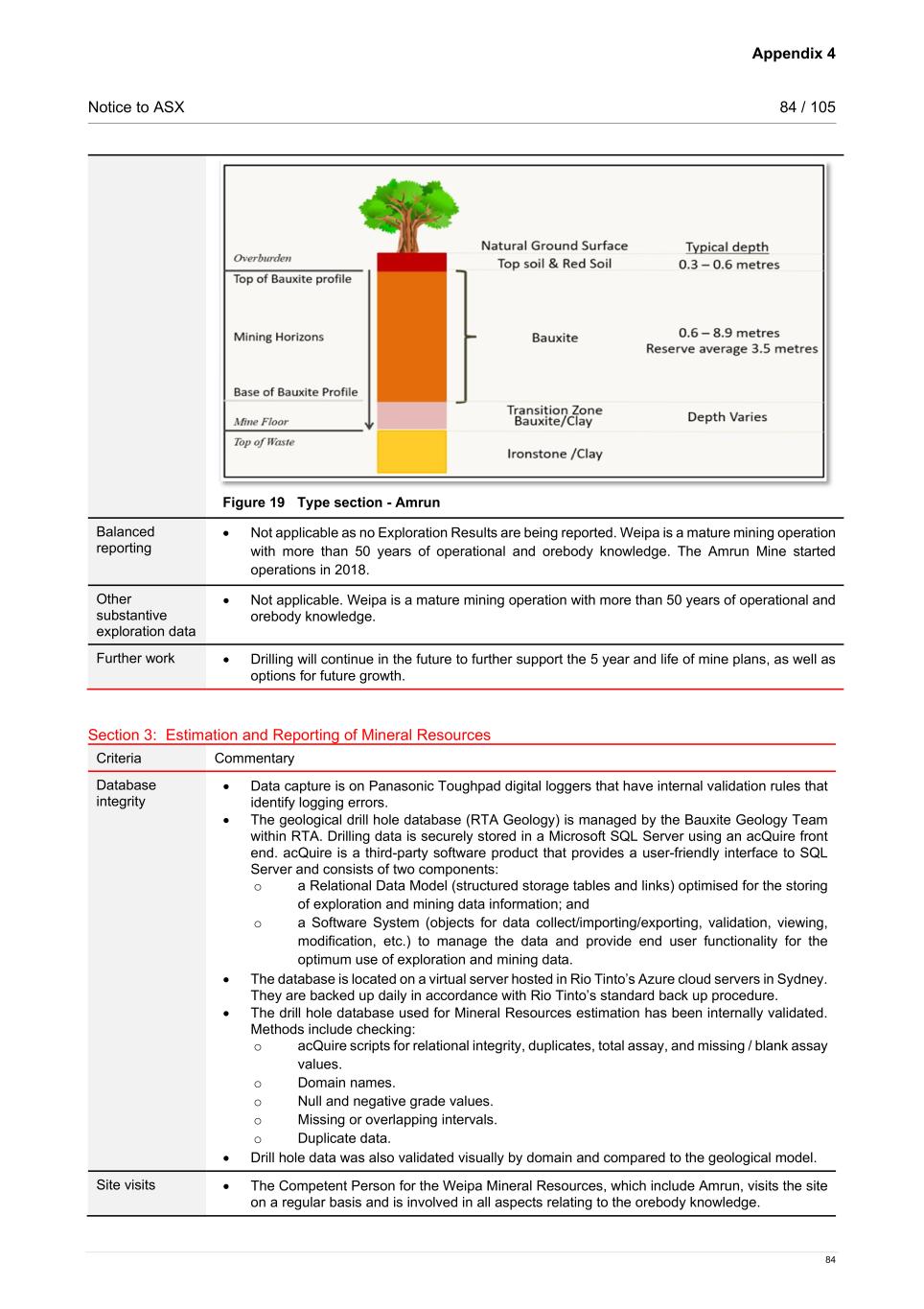 Appendix 4 Notice to ASX 84 / 105 84 Figure 19 Type section - Amrun Balanced reporting • Not applicable as no Exploration Results are being reported. Weipa is a mature mining operation with more than 50 years of operational and orebody knowledge. The Amrun Mine started operations in 2018. Other substantive exploration data • Not applicable. Weipa is a mature mining operation with more than 50 years of operational and orebody knowledge. Further work • Drilling will continue in the future to further support the 5 year and life of mine plans, as well as options for future growth. Section 3: Estimation and Reporting of Mineral Resources Criteria Commentary Database integrity • Data capture is on Panasonic Toughpad digital loggers that have internal validation rules that identify logging errors. • The geological drill hole database (RTA Geology) is managed by the Bauxite Geology Team within RTA. Drilling data is securely stored in a Microsoft SQL Server using an acQuire front end. acQuire is a third-party software product that provides a user-friendly interface to SQL Server and consists of two components: o a Relational Data Model (structured storage tables and links) optimised for the storing of exploration and mining data information; and o a Software System (objects for data collect/importing/exporting, validation, viewing, modification, etc.) to manage the data and provide end user functionality for the optimum use of exploration and mining data. • The database is located on a virtual server hosted in Rio Tinto’s Azure cloud servers in Sydney. They are backed up daily in accordance with Rio Tinto’s standard back up procedure. • The drill hole database used for Mineral Resources estimation has been internally validated. Methods include checking: o acQuire scripts for relational integrity, duplicates, total assay, and missing / blank assay values. o Domain names. o Null and negative grade values. o Missing or overlapping intervals. o Duplicate data. • Drill hole data was also validated visually by domain and compared to the geological model. Site visits • The Competent Person for the Weipa Mineral Resources, which include Amrun, visits the site on a regular basis and is involved in all aspects relating to the orebody knowledge.