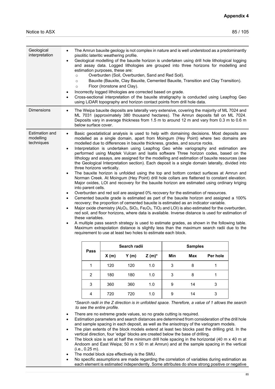 Appendix 4 Notice to ASX 85 / 105 85 Geological interpretation • The Amrun bauxite geology is not complex in nature and is well understood as a predominantly pisolitic lateritic weathering profile. • Geological modelling of the bauxite horizon is undertaken using drill hole lithological logging and assay data. Logged lithologies are grouped into three horizons for modelling and estimation purposes, these are: o Overburden (Soil, Overburden, Sand and Red Soil). o Bauxite (Bauxite, Clay Bauxite, Cemented Bauxite, Transition and Clay Transition). o Floor (Ironstone and Clay). • Incorrectly logged lithologies are corrected based on grade. • Cross-sectional interpretation of the bauxite stratigraphy is conducted using Leapfrog Geo using LiDAR topography and horizon contact points from drill hole data. Dimensions • The Weipa bauxite deposits are laterally very extensive, covering the majority of ML 7024 and ML 7031 (approximately 380 thousand hectares). The Amrun deposits fall on ML 7024. Deposits vary in average thickness from 1.5 m to around 12 m and vary from 0.3 m to 0.6 m below surface cover. Estimation and modelling techniques • Basic geostatistical analysis is used to help with domaining decisions. Most deposits are modelled as a single domain, apart from Moingum (Hey Point) where two domains are modelled due to differences in bauxite thickness, grades, and source rocks. • Interpretation is undertaken using Leapfrog Geo while variography and estimation are performed using Maptek Vulcan and Isatis software Three horizon codes, based on the lithology and assays, are assigned for the modelling and estimation of bauxite resources (see the Geological Interpretation section). Each deposit is a single domain laterally, divided into three horizons vertically. • The bauxite horizon is unfolded using the top and bottom contact surfaces at Amrun and Norman Creek. At Moingum (Hey Point) drill hole collars are flattened to constant elevation. Major oxides, LOI and recovery for the bauxite horizon are estimated using ordinary kriging into parent cells. • Overburden and red soil are assigned 0% recovery for the estimation of resources. • Cemented bauxite grade is estimated as part of the bauxite horizon and assigned a 100% recovery; the proportion of cemented bauxite is estimated as an indicator variable. • Major oxide chemistry (Al2O3, SiO2, Fe2O3, TiO2 and LOI) is also estimated for the overburden, red soil, and floor horizons, where data is available. Inverse distance is used for estimation of these variables. • A multiple pass search strategy is used to estimate grades, as shown in the following table. Maximum extrapolation distance is slightly less than the maximum search radii due to the requirement to use at least two holes to estimate each block. Pass Search radii Samples X (m) Y (m) Z (m)* Min Max Per hole 1 120 120 1.0 3 8 1 2 180 180 1.0 3 8 1 3 360 360 1.0 9 14 3 4 720 720 1.0 9 14 3 *Search radii in the Z direction is in unfolded space. Therefore, a value of 1 allows the search to see the entire profile. • There are no extreme grade values, so no grade cutting is required. • Estimation parameters and search distances are determined from consideration of the drill hole and sample spacing in each deposit, as well as the anisotropy of the variogram models. • The plan extents of the block models extend at least two blocks past the drilling grid. In the vertical direction, four ‘edge’ blocks are created below the base of drilling. • The block size is set at half the minimum drill hole spacing in the horizontal (40 m x 40 m at Andoom and East Weipa; 50 m x 50 m at Amrun) and at the sample spacing in the vertical (i.e., 0.25 m). • The model block size effectively is the SMU. • No specific assumptions are made regarding the correlation of variables during estimation as each element is estimated independently. Some attributes do show strong positive or negative