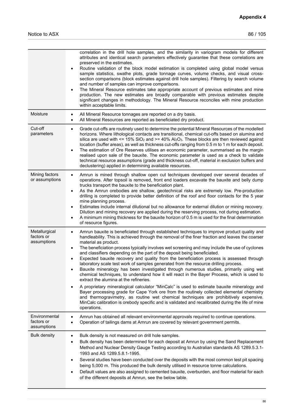 Appendix 4 Notice to ASX 86 / 105 86 correlation in the drill hole samples, and the similarity in variogram models for different attributes and identical search parameters effectively guarantee that these correlations are preserved in the estimates. • Routine validation of the block model estimation is completed using global model versus sample statistics, swathe plots, grade tonnage curves, volume checks, and visual cross- section comparisons (block estimates against drill hole samples). Filtering by search volume and number of samples can improve comparisons. • The Mineral Resource estimates take appropriate account of previous estimates and mine production. The new estimates are broadly comparable with previous estimates despite significant changes in methodology. The Mineral Resource reconciles with mine production within acceptable limits. Moisture • All Mineral Resource tonnages are reported on a dry basis. • All Mineral Resources are reported as beneficiated dry product. Cut-off parameters • Grade cut-offs are routinely used to determine the potential Mineral Resources of the modelled horizons. Where lithological contacts are transitional, chemical cut-offs based on alumina and silica are used with <= 15% SiO2 and >= 40% Al2O3. These blocks are then reviewed against location (buffer areas), as well as thickness cut-offs ranging from 0.5 m to 1 m for each deposit. • The estimation of Ore Reserves utilises an economic parameter, summarised as the margin realised upon sale of the bauxite. The economic parameter is used as a check to validate technical resource assumptions (grade and thickness cut-off, material in exclusion buffers and declustering) applied in determining available resources. Mining factors or assumptions • Amrun is mined through shallow open cut techniques developed over several decades of operations. After topsoil is removed, front end loaders excavate the bauxite and belly dump trucks transport the bauxite to the beneficiation plant. • As the Amrun orebodies are shallow, geotechnical risks are extremely low. Pre-production drilling is completed to provide better definition of the roof and floor contacts for the 5 year mine planning process. • Estimates include internal dilutional but no allowance for external dilution or mining recovery. Dilution and mining recovery are applied during the reserving process, not during estimation. • A minimum mining thickness for the bauxite horizon of 0.5 m is used for the final determination of resource figures. Metallurgical factors or assumptions • Amrun bauxite is beneficiated through established techniques to improve product quality and handleability. This is achieved through the removal of the finer fraction and leaves the coarser material as product. • The beneficiation process typically involves wet screening and may include the use of cyclones and classifiers depending on the part of the deposit being beneficiated. • Expected bauxite recovery and quality from the beneficiation process is assessed through laboratory scale test work of samples generated from the resource drilling process. • Bauxite mineralogy has been investigated through numerous studies, primarily using wet chemical techniques, to understand how it will react in the Bayer Process, which is used to extract the alumina at the refineries. • A proprietary mineralogical calculator “MinCalc” is used to estimate bauxite mineralogy and Bayer processing grade for Cape York ore from the routinely collected elemental chemistry and thermogravimetry, as routine wet chemical techniques are prohibitively expensive. MinCalc calibration is orebody specific and is validated and recalibrated during the life of mine operations. Environmental factors or assumptions • Amrun has obtained all relevant environmental approvals required to continue operations. • Operation of tailings dams at Amrun are covered by relevant government permits. Bulk density • Bulk density is not measured on drill hole samples. • Bulk density has been determined for each deposit at Amrun by using the Sand Replacement Method and Nuclear Density Gauge Testing according to Australian standards AS 1289.5.3.1- 1993 and AS 1289.5.8.1-1995. • Several studies have been conducted over the deposits with the most common test pit spacing being 5,000 m. This produced the bulk density utilised in resource tonne calculations. • Default values are also assigned to cemented bauxite, overburden, and floor material for each of the different deposits at Amrun, see the below table.