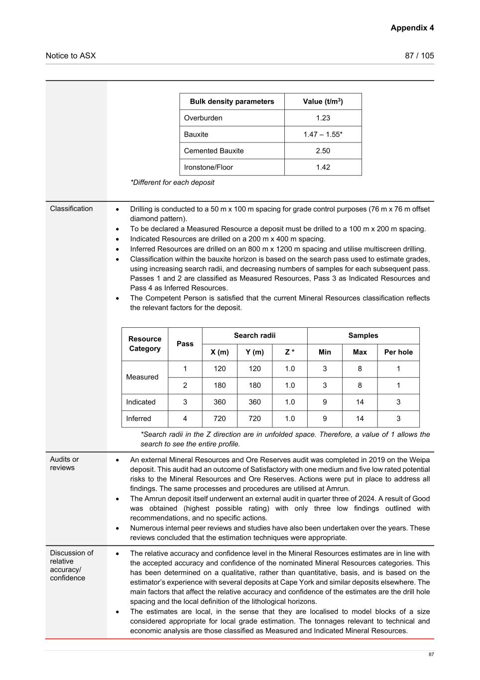 Appendix 4 Notice to ASX 87 / 105 87 Bulk density parameters Value (t/m3) Overburden 1.23 Bauxite 1.47 – 1.55* Cemented Bauxite 2.50 Ironstone/Floor 1.42 *Different for each deposit Classification • Drilling is conducted to a 50 m x 100 m spacing for grade control purposes (76 m x 76 m offset diamond pattern). • To be declared a Measured Resource a deposit must be drilled to a 100 m x 200 m spacing. • Indicated Resources are drilled on a 200 m x 400 m spacing. • Inferred Resources are drilled on an 800 m x 1200 m spacing and utilise multiscreen drilling. • Classification within the bauxite horizon is based on the search pass used to estimate grades, using increasing search radii, and decreasing numbers of samples for each subsequent pass. Passes 1 and 2 are classified as Measured Resources, Pass 3 as Indicated Resources and Pass 4 as Inferred Resources. • The Competent Person is satisfied that the current Mineral Resources classification reflects the relevant factors for the deposit. Resource Category Pass Search radii Samples X (m) Y (m) Z * Min Max Per hole Measured 1 120 120 1.0 3 8 1 2 180 180 1.0 3 8 1 Indicated 3 360 360 1.0 9 14 3 Inferred 4 720 720 1.0 9 14 3 *Search radii in the Z direction are in unfolded space. Therefore, a value of 1 allows the search to see the entire profile. Audits or reviews • An external Mineral Resources and Ore Reserves audit was completed in 2019 on the Weipa deposit. This audit had an outcome of Satisfactory with one medium and five low rated potential risks to the Mineral Resources and Ore Reserves. Actions were put in place to address all findings. The same processes and procedures are utilised at Amrun. • The Amrun deposit itself underwent an external audit in quarter three of 2024. A result of Good was obtained (highest possible rating) with only three low findings outlined with recommendations, and no specific actions. • Numerous internal peer reviews and studies have also been undertaken over the years. These reviews concluded that the estimation techniques were appropriate. Discussion of relative accuracy/ confidence • The relative accuracy and confidence level in the Mineral Resources estimates are in line with the accepted accuracy and confidence of the nominated Mineral Resources categories. This has been determined on a qualitative, rather than quantitative, basis, and is based on the estimator’s experience with several deposits at Cape York and similar deposits elsewhere. The main factors that affect the relative accuracy and confidence of the estimates are the drill hole spacing and the local definition of the lithological horizons. • The estimates are local, in the sense that they are localised to model blocks of a size considered appropriate for local grade estimation. The tonnages relevant to technical and economic analysis are those classified as Measured and Indicated Mineral Resources.