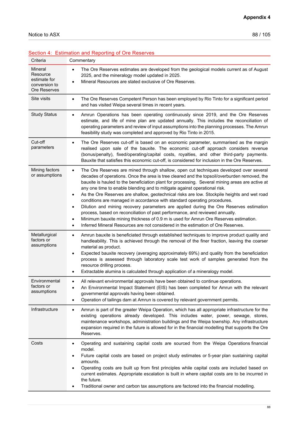 Appendix 4 Notice to ASX 88 / 105 88 Section 4: Estimation and Reporting of Ore Reserves Criteria Commentary Mineral Resource estimate for conversion to Ore Reserves • The Ore Reserves estimates are developed from the geological models current as of August 2025, and the mineralogy model updated in 2025. • Mineral Resources are stated exclusive of Ore Reserves. Site visits • The Ore Reserves Competent Person has been employed by Rio Tinto for a significant period and has visited Weipa several times in recent years. Study Status • Amrun Operations has been operating continuously since 2019, and the Ore Reserves estimate, and life of mine plan are updated annually. This includes the reconciliation of operating parameters and review of input assumptions into the planning processes. The Amrun feasibility study was completed and approved by Rio Tinto in 2015. Cut-off parameters • The Ore Reserves cut-off is based on an economic parameter, summarised as the margin realised upon sale of the bauxite. The economic cut-off approach considers revenue (bonus/penalty), fixed/operating/capital costs, royalties, and other third-party payments. Bauxite that satisfies this economic cut-off, is considered for inclusion in the Ore Reserves. Mining factors or assumptions • The Ore Reserves are mined through shallow, open cut techniques developed over several decades of operations. Once the area is tree cleared and the topsoil/overburden removed, the bauxite is hauled to the beneficiation plant for processing. Several mining areas are active at any one time to enable blending and to mitigate against operational risk. • As the Ore Reserves are shallow, geotechnical risks are low. Stockpile heights and wet road conditions are managed in accordance with standard operating procedures. • Dilution and mining recovery parameters are applied during the Ore Reserves estimation process, based on reconciliation of past performance, and reviewed annually. • Minimum bauxite mining thickness of 0.9 m is used for Amrun Ore Reserves estimation. • Inferred Mineral Resources are not considered in the estimation of Ore Reserves. Metallurgical factors or assumptions • Amrun bauxite is beneficiated through established techniques to improve product quality and handleability. This is achieved through the removal of the finer fraction, leaving the coarser material as product. • Expected bauxite recovery (averaging approximately 69%) and quality from the beneficiation process is assessed through laboratory scale test work of samples generated from the resource drilling process. • Extractable alumina is calculated through application of a mineralogy model. Environmental factors or assumptions • All relevant environmental approvals have been obtained to continue operations. • An Environmental Impact Statement (EIS) has been completed for Amrun with the relevant governmental approvals having been obtained. • Operation of tailings dam at Amrun is covered by relevant government permits. Infrastructure • Amrun is part of the greater Weipa Operation, which has all appropriate infrastructure for the existing operations already developed. This includes water, power, sewage, stores, maintenance workshops, administration buildings and the Weipa township. Any infrastructure expansion required in the future is allowed for in the financial modelling that supports the Ore Reserves. Costs • Operating and sustaining capital costs are sourced from the Weipa Operations financial model. • Future capital costs are based on project study estimates or 5-year plan sustaining capital amounts. • Operating costs are built up from first principles while capital costs are included based on current estimates. Appropriate escalation is built in where capital costs are to be incurred in the future. • Traditional owner and carbon tax assumptions are factored into the financial modelling.