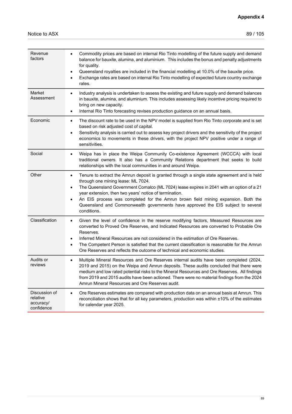 Appendix 4 Notice to ASX 89 / 105 89 Revenue factors • Commodity prices are based on internal Rio Tinto modelling of the future supply and demand balance for bauxite, alumina, and aluminium. This includes the bonus and penalty adjustments for quality. • Queensland royalties are included in the financial modelling at 10.0% of the bauxite price. • Exchange rates are based on internal Rio Tinto modelling of expected future country exchange rates. Market Assessment • Industry analysis is undertaken to assess the existing and future supply and demand balances in bauxite, alumina, and aluminium. This includes assessing likely incentive pricing required to bring on new capacity. • Internal Rio Tinto forecasting revises production guidance on an annual basis. Economic • The discount rate to be used in the NPV model is supplied from Rio Tinto corporate and is set based on risk adjusted cost of capital. • Sensitivity analysis is carried out to assess key project drivers and the sensitivity of the project economics to movements in these drivers, with the project NPV positive under a range of sensitivities. Social • Weipa has in place the Weipa Community Co-existence Agreement (WCCCA) with local traditional owners. It also has a Community Relations department that seeks to build relationships with the local communities in and around Weipa. Other • Tenure to extract the Amrun deposit is granted through a single state agreement and is held through one mining lease: ML 7024. • The Queensland Government Comalco (ML 7024) lease expires in 2041 with an option of a 21 year extension, then two years’ notice of termination. • An EIS process was completed for the Amrun brown field mining expansion. Both the Queensland and Commonwealth governments have approved the EIS subject to several conditions. Classification • Given the level of confidence in the reserve modifying factors, Measured Resources are converted to Proved Ore Reserves, and Indicated Resources are converted to Probable Ore Reserves. • Inferred Mineral Resources are not considered in the estimation of Ore Reserves. • The Competent Person is satisfied that the current classification is reasonable for the Amrun Ore Reserves and reflects the outcome of technical and economic studies. Audits or reviews • Multiple Mineral Resources and Ore Reserves internal audits have been completed (2024, 2019 and 2015) on the Weipa and Amrun deposits. These audits concluded that there were medium and low rated potential risks to the Mineral Resources and Ore Reserves. All findings from 2019 and 2015 audits have been actioned. There were no material findings from the 2024 Amrun Mineral Resources and Ore Reserves audit. Discussion of relative accuracy/ confidence • Ore Reserves estimates are compared with production data on an annual basis at Amrun. This reconciliation shows that for all key parameters, production was within ±10% of the estimates for calendar year 2025.