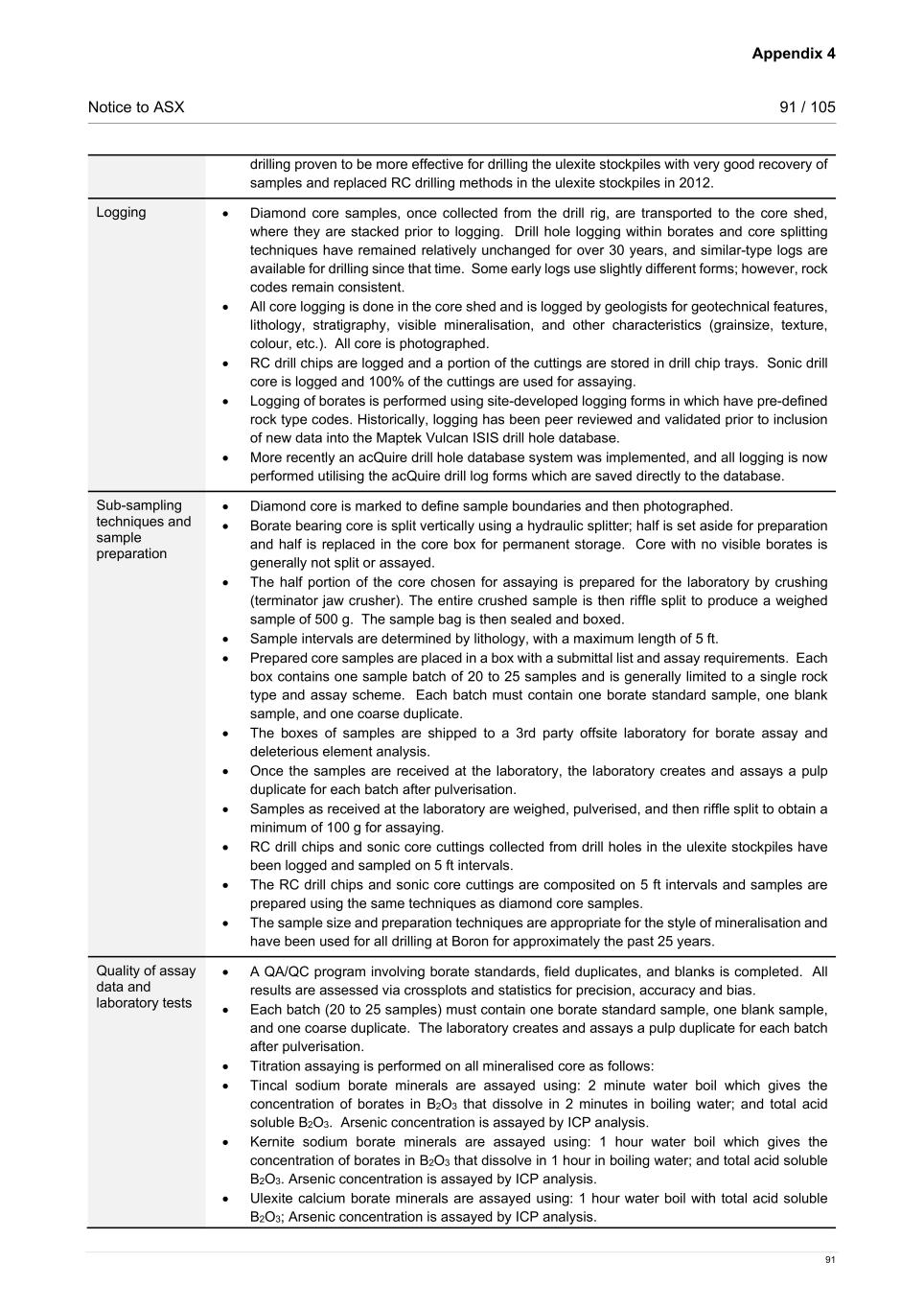 Appendix 4 Notice to ASX 91 / 105 91 drilling proven to be more effective for drilling the ulexite stockpiles with very good recovery of samples and replaced RC drilling methods in the ulexite stockpiles in 2012. Logging • Diamond core samples, once collected from the drill rig, are transported to the core shed, where they are stacked prior to logging. Drill hole logging within borates and core splitting techniques have remained relatively unchanged for over 30 years, and similar-type logs are available for drilling since that time. Some early logs use slightly different forms; however, rock codes remain consistent. • All core logging is done in the core shed and is logged by geologists for geotechnical features, lithology, stratigraphy, visible mineralisation, and other characteristics (grainsize, texture, colour, etc.). All core is photographed. • RC drill chips are logged and a portion of the cuttings are stored in drill chip trays. Sonic drill core is logged and 100% of the cuttings are used for assaying. • Logging of borates is performed using site-developed logging forms in which have pre-defined rock type codes. Historically, logging has been peer reviewed and validated prior to inclusion of new data into the Maptek Vulcan ISIS drill hole database. • More recently an acQuire drill hole database system was implemented, and all logging is now performed utilising the acQuire drill log forms which are saved directly to the database. Sub-sampling techniques and sample preparation • Diamond core is marked to define sample boundaries and then photographed. • Borate bearing core is split vertically using a hydraulic splitter; half is set aside for preparation and half is replaced in the core box for permanent storage. Core with no visible borates is generally not split or assayed. • The half portion of the core chosen for assaying is prepared for the laboratory by crushing (terminator jaw crusher). The entire crushed sample is then riffle split to produce a weighed sample of 500 g. The sample bag is then sealed and boxed. • Sample intervals are determined by lithology, with a maximum length of 5 ft. • Prepared core samples are placed in a box with a submittal list and assay requirements. Each box contains one sample batch of 20 to 25 samples and is generally limited to a single rock type and assay scheme. Each batch must contain one borate standard sample, one blank sample, and one coarse duplicate. • The boxes of samples are shipped to a 3rd party offsite laboratory for borate assay and deleterious element analysis. • Once the samples are received at the laboratory, the laboratory creates and assays a pulp duplicate for each batch after pulverisation. • Samples as received at the laboratory are weighed, pulverised, and then riffle split to obtain a minimum of 100 g for assaying. • RC drill chips and sonic core cuttings collected from drill holes in the ulexite stockpiles have been logged and sampled on 5 ft intervals. • The RC drill chips and sonic core cuttings are composited on 5 ft intervals and samples are prepared using the same techniques as diamond core samples. • The sample size and preparation techniques are appropriate for the style of mineralisation and have been used for all drilling at Boron for approximately the past 25 years. Quality of assay data and laboratory tests • A QA/QC program involving borate standards, field duplicates, and blanks is completed. All results are assessed via crossplots and statistics for precision, accuracy and bias. • Each batch (20 to 25 samples) must contain one borate standard sample, one blank sample, and one coarse duplicate. The laboratory creates and assays a pulp duplicate for each batch after pulverisation. • Titration assaying is performed on all mineralised core as follows: • Tincal sodium borate minerals are assayed using: 2 minute water boil which gives the concentration of borates in B2O3 that dissolve in 2 minutes in boiling water; and total acid soluble B2O3. Arsenic concentration is assayed by ICP analysis. • Kernite sodium borate minerals are assayed using: 1 hour water boil which gives the concentration of borates in B2O3 that dissolve in 1 hour in boiling water; and total acid soluble B2O3. Arsenic concentration is assayed by ICP analysis. • Ulexite calcium borate minerals are assayed using: 1 hour water boil with total acid soluble B2O3; Arsenic concentration is assayed by ICP analysis.