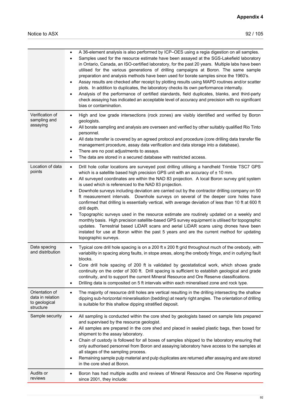 Appendix 4 Notice to ASX 92 / 105 92 • A 36-element analysis is also performed by ICP–OES using a regia digestion on all samples. • Samples used for the resource estimate have been assayed at the SGS-Lakefield laboratory in Ontario, Canada, an ISO-certified laboratory, for the past 20 years. Multiple labs have been utilised for the various generations of drilling campaigns at Boron. The same sample preparation and analysis methods have been used for borate samples since the 1960’s. • Assay results are checked after receipt by plotting results using MAPD routines and/or scatter plots. In addition to duplicates, the laboratory checks its own performance internally. • Analysis of the performance of certified standards, field duplicates, blanks, and third-party check assaying has indicated an acceptable level of accuracy and precision with no significant bias or contamination. Verification of sampling and assaying • High and low grade intersections (rock zones) are visibly identified and verified by Boron geologists. • All borate sampling and analysis are overseen and verified by other suitably qualified Rio Tinto personnel. • All data transfer is covered by an agreed protocol and procedure (core drilling data transfer file management procedure, assay data verification and data storage into a database). • There are no post adjustments to assays. • The data are stored in a secured database with restricted access. Location of data points • Drill hole collar locations are surveyed post drilling utilising a handheld Trimble TSC7 GPS which is a satellite based high precision GPS unit with an accuracy of ± 10 mm. • All surveyed coordinates are within the NAD 83 projection. A local Boron survey grid system is used which is referenced to the NAD 83 projection. • Downhole surveys including deviation are carried out by the contractor drilling company on 50 ft measurement intervals. Downhole surveys on several of the deeper core holes have confirmed that drilling is essentially vertical, with average deviation of less than 10 ft at 600 ft drill depth. • Topographic surveys used in the resource estimate are routinely updated on a weekly and monthly basis. High precision satellite-based GPS survey equipment is utilised for topographic updates. Terrestrial based LiDAR scans and aerial LiDAR scans using drones have been instated for use at Boron within the past 5 years and are the current method for updating topographic surveys. Data spacing and distribution • Typical core drill hole spacing is on a 200 ft x 200 ft grid throughout much of the orebody, with variability in spacing along faults, in stope areas, along the orebody fringe, and in outlying fault blocks. • Core drill hole spacing of 200 ft is validated by geostatistical work, which shows grade continuity on the order of 300 ft. Drill spacing is sufficient to establish geological and grade continuity, and to support the current Mineral Resource and Ore Reserve classifications. • Drilling data is composited on 5 ft intervals within each mineralised zone and rock type. Orientation of data in relation to geological structure • The majority of resource drill holes are vertical resulting in the drilling intersecting the shallow dipping sub-horizontal mineralisation (bedding) at nearly right angles. The orientation of drilling is suitable for this shallow dipping stratified deposit. Sample security • All sampling is conducted within the core shed by geologists based on sample lists prepared and supervised by the resource geologist. • All samples are prepared in the core shed and placed in sealed plastic bags, then boxed for shipment to the assay laboratory. • Chain of custody is followed for all boxes of samples shipped to the laboratory ensuring that only authorised personnel from Boron and assaying laboratory have access to the samples at all stages of the sampling process. • Remaining sample pulp material and pulp duplicates are returned after assaying and are stored in the core shed at Boron. Audits or reviews • Boron has had multiple audits and reviews of Mineral Resource and Ore Reserve reporting since 2001, they include: