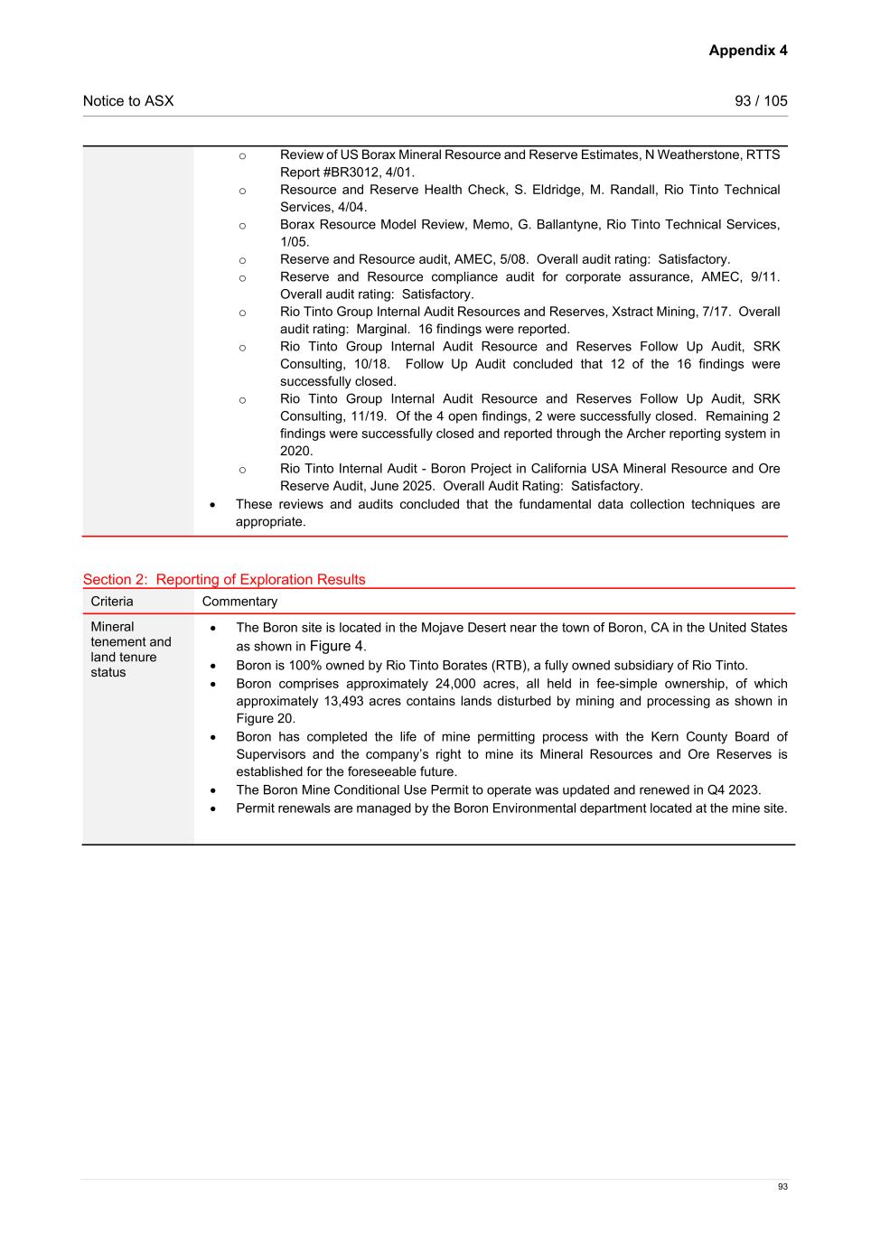 Appendix 4 Notice to ASX 93 / 105 93 o Review of US Borax Mineral Resource and Reserve Estimates, N Weatherstone, RTTS Report #BR3012, 4/01. o Resource and Reserve Health Check, S. Eldridge, M. Randall, Rio Tinto Technical Services, 4/04. o Borax Resource Model Review, Memo, G. Ballantyne, Rio Tinto Technical Services, 1/05. o Reserve and Resource audit, AMEC, 5/08. Overall audit rating: Satisfactory. o Reserve and Resource compliance audit for corporate assurance, AMEC, 9/11. Overall audit rating: Satisfactory. o Rio Tinto Group Internal Audit Resources and Reserves, Xstract Mining, 7/17. Overall audit rating: Marginal. 16 findings were reported. o Rio Tinto Group Internal Audit Resource and Reserves Follow Up Audit, SRK Consulting, 10/18. Follow Up Audit concluded that 12 of the 16 findings were successfully closed. o Rio Tinto Group Internal Audit Resource and Reserves Follow Up Audit, SRK Consulting, 11/19. Of the 4 open findings, 2 were successfully closed. Remaining 2 findings were successfully closed and reported through the Archer reporting system in 2020. o Rio Tinto Internal Audit - Boron Project in California USA Mineral Resource and Ore Reserve Audit, June 2025. Overall Audit Rating: Satisfactory. • These reviews and audits concluded that the fundamental data collection techniques are appropriate. Section 2: Reporting of Exploration Results Criteria Commentary Mineral tenement and land tenure status • The Boron site is located in the Mojave Desert near the town of Boron, CA in the United States as shown in Figure 4. • Boron is 100% owned by Rio Tinto Borates (RTB), a fully owned subsidiary of Rio Tinto. • Boron comprises approximately 24,000 acres, all held in fee-simple ownership, of which approximately 13,493 acres contains lands disturbed by mining and processing as shown in Figure 20. • Boron has completed the life of mine permitting process with the Kern County Board of Supervisors and the company’s right to mine its Mineral Resources and Ore Reserves is established for the foreseeable future. • The Boron Mine Conditional Use Permit to operate was updated and renewed in Q4 2023. • Permit renewals are managed by the Boron Environmental department located at the mine site.