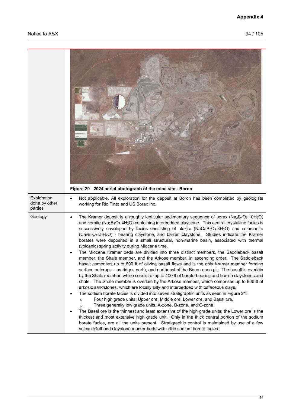 Appendix 4 Notice to ASX 94 / 105 94 Figure 20 2024 aerial photograph of the mine site - Boron Exploration done by other parties • Not applicable. All exploration for the deposit at Boron has been completed by geologists working for Rio Tinto and US Borax Inc. Geology • The Kramer deposit is a roughly lenticular sedimentary sequence of borax (Na2B4O7.10H2O) and kernite (Na2B4O7.4H2O) containing interbedded claystone. This central crystalline facies is successively enveloped by facies consisting of ulexite (NaCaB5O9.8H2O) and colemanite (Ca2B6O11.5H2O) - bearing claystone, and barren claystone. Studies indicate the Kramer borates were deposited in a small structural, non-marine basin, associated with thermal (volcanic) spring activity during Miocene time. • The Miocene Kramer beds are divided into three distinct members, the Saddleback basalt member, the Shale member, and the Arkose member, in ascending order. The Saddleback basalt comprises up to 600 ft of olivine basalt flows and is the only Kramer member forming surface outcrops – as ridges north, and northeast of the Boron open pit. The basalt is overlain by the Shale member, which consist of up to 400 ft of borate-bearing and barren claystones and shale. The Shale member is overlain by the Arkose member, which comprises up to 800 ft of arkosic sandstones, which are locally silty and interbedded with tuffaceous clays. • The sodium borate facies is divided into seven stratigraphic units as seen in Figure 21: o Four high grade units: Upper ore, Middle ore, Lower ore, and Basal ore. o Three generally low grade units, A-zone, B-zone, and C-zone. • The Basal ore is the thinnest and least extensive of the high grade units; the Lower ore is the thickest and most extensive high grade unit. Only in the thick central portion of the sodium borate facies, are all the units present. Stratigraphic control is maintained by use of a few volcanic tuff and claystone marker beds within the sodium borate facies.