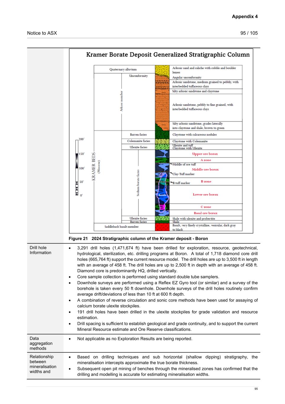 Appendix 4 Notice to ASX 95 / 105 95 Figure 21 2024 Stratigraphic column of the Kramer deposit - Boron Drill hole Information • 3,291 drill holes (1,471,674 ft) have been drilled for exploration, resource, geotechnical, hydrological, sterilization, etc. drilling programs at Boron. A total of 1,718 diamond core drill holes (665,764 ft) support the current resource model. The drill holes are up to 3,500 ft in length with an average of 458 ft. The drill holes are up to 2,500 ft in depth with an average of 458 ft. Diamond core is predominantly HQ, drilled vertically. • Core sample collection is performed using standard double tube samplers. • Downhole surveys are performed using a Reflex EZ Gyro tool (or similar) and a survey of the borehole is taken every 50 ft downhole. Downhole surveys of the drill holes routinely confirm average drift/deviations of less than 10 ft at 600 ft depth. • A combination of reverse circulation and sonic core methods have been used for assaying of calcium borate ulexite stockpiles. • 191 drill holes have been drilled in the ulexite stockpiles for grade validation and resource estimation. • Drill spacing is sufficient to establish geological and grade continuity, and to support the current Mineral Resource estimate and Ore Reserve classifications. Data aggregation methods • Not applicable as no Exploration Results are being reported. Relationship between mineralisation widths and • Based on drilling techniques and sub horizontal (shallow dipping) stratigraphy, the mineralisation intercepts approximate the true borate thickness. • Subsequent open pit mining of benches through the mineralised zones has confirmed that the drilling and modelling is accurate for estimating mineralisation widths.