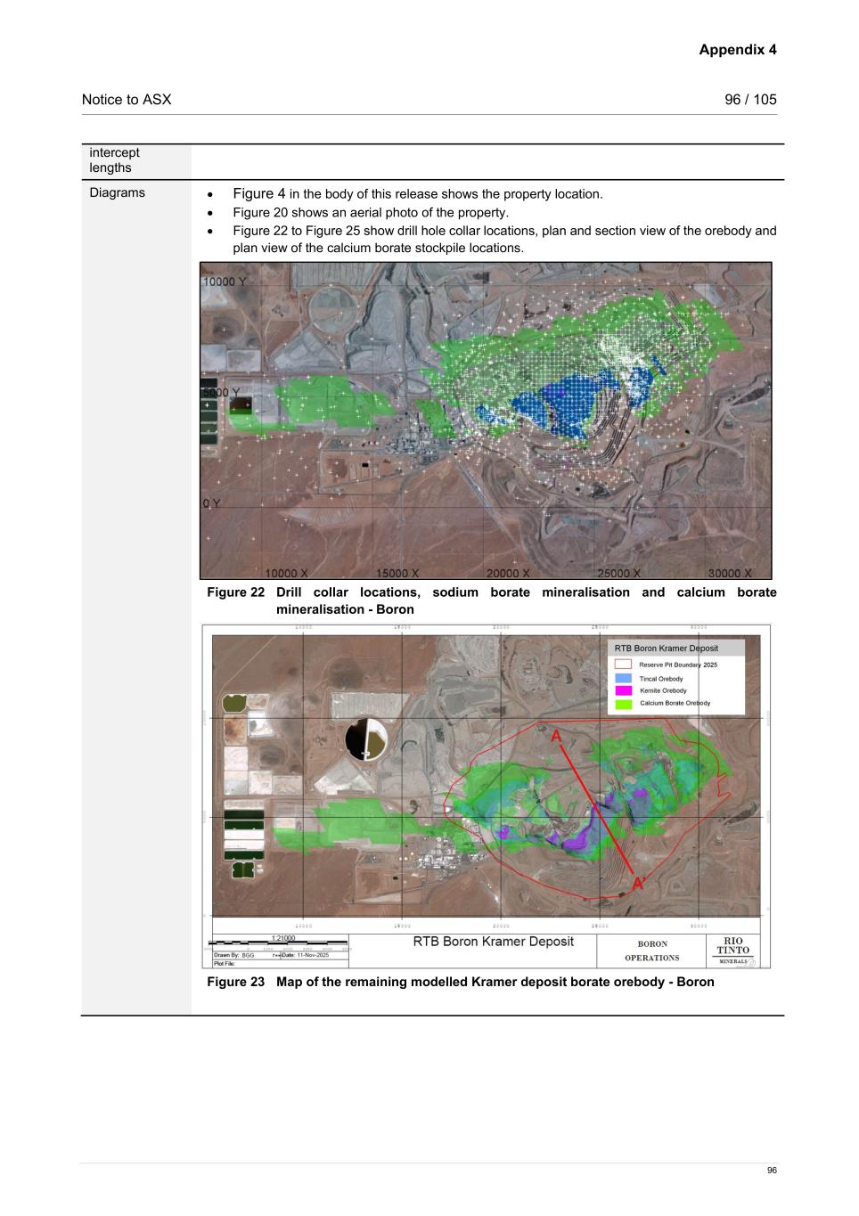 Appendix 4 Notice to ASX 96 / 105 96 intercept lengths Diagrams • Figure 4 in the body of this release shows the property location. • Figure 20 shows an aerial photo of the property. • Figure 22 to Figure 25 show drill hole collar locations, plan and section view of the orebody and plan view of the calcium borate stockpile locations. Figure 22 Drill collar locations, sodium borate mineralisation and calcium borate mineralisation - Boron Figure 23 Map of the remaining modelled Kramer deposit borate orebody - Boron