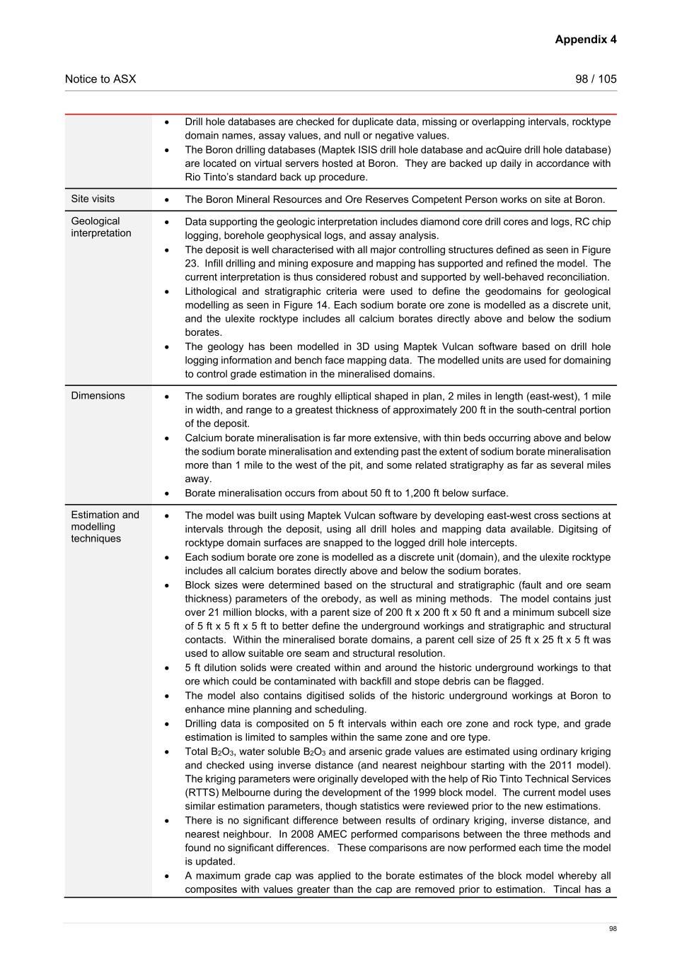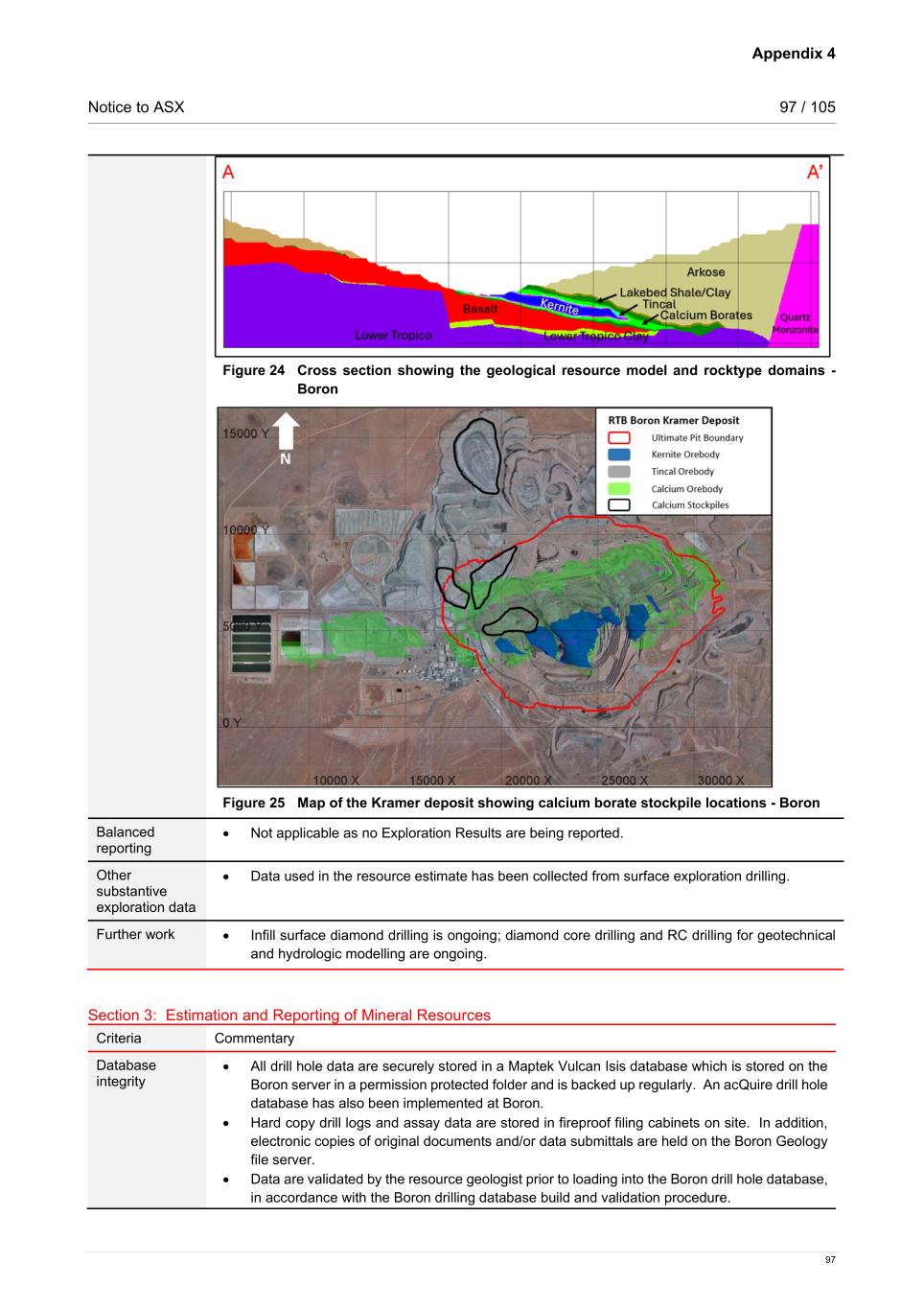 Appendix 4 Notice to ASX 97 / 105 97 Figure 24 Cross section showing the geological resource model and rocktype domains - Boron Figure 25 Map of the Kramer deposit showing calcium borate stockpile locations - Boron Balanced reporting • Not applicable as no Exploration Results are being reported. Other substantive exploration data • Data used in the resource estimate has been collected from surface exploration drilling. Further work • Infill surface diamond drilling is ongoing; diamond core drilling and RC drilling for geotechnical and hydrologic modelling are ongoing. Section 3: Estimation and Reporting of Mineral Resources Criteria Commentary Database integrity • All drill hole data are securely stored in a Maptek Vulcan Isis database which is stored on the Boron server in a permission protected folder and is backed up regularly. An acQuire drill hole database has also been implemented at Boron. • Hard copy drill logs and assay data are stored in fireproof filing cabinets on site. In addition, electronic copies of original documents and/or data submittals are held on the Boron Geology file server. • Data are validated by the resource geologist prior to loading into the Boron drill hole database, in accordance with the Boron drilling database build and validation procedure.