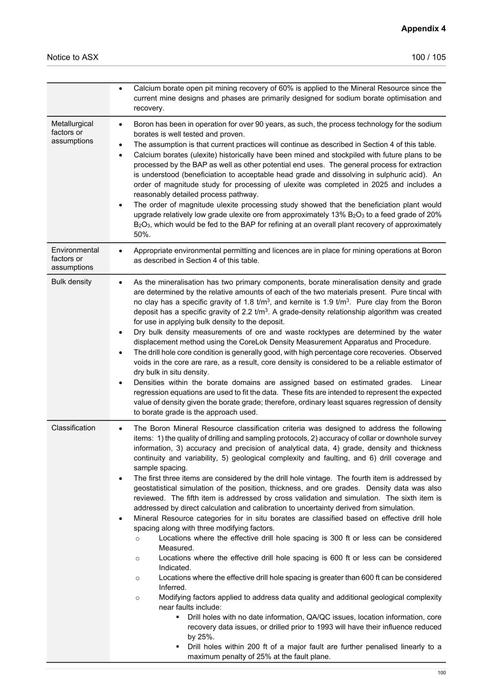 Appendix 4 Notice to ASX 100 / 105 100 • Calcium borate open pit mining recovery of 60% is applied to the Mineral Resource since the current mine designs and phases are primarily designed for sodium borate optimisation and recovery. Metallurgical factors or assumptions • Boron has been in operation for over 90 years, as such, the process technology for the sodium borates is well tested and proven. • The assumption is that current practices will continue as described in Section 4 of this table. • Calcium borates (ulexite) historically have been mined and stockpiled with future plans to be processed by the BAP as well as other potential end uses. The general process for extraction is understood (beneficiation to acceptable head grade and dissolving in sulphuric acid). An order of magnitude study for processing of ulexite was completed in 2025 and includes a reasonably detailed process pathway. • The order of magnitude ulexite processing study showed that the beneficiation plant would upgrade relatively low grade ulexite ore from approximately 13% B2O3 to a feed grade of 20% B2O3, which would be fed to the BAP for refining at an overall plant recovery of approximately 50%. Environmental factors or assumptions • Appropriate environmental permitting and licences are in place for mining operations at Boron as described in Section 4 of this table. Bulk density • As the mineralisation has two primary components, borate mineralisation density and grade are determined by the relative amounts of each of the two materials present. Pure tincal with no clay has a specific gravity of 1.8 t/m3, and kernite is 1.9 t/m3. Pure clay from the Boron deposit has a specific gravity of 2.2 t/m3. A grade-density relationship algorithm was created for use in applying bulk density to the deposit. • Dry bulk density measurements of ore and waste rocktypes are determined by the water displacement method using the CoreLok Density Measurement Apparatus and Procedure. • The drill hole core condition is generally good, with high percentage core recoveries. Observed voids in the core are rare, as a result, core density is considered to be a reliable estimator of dry bulk in situ density. • Densities within the borate domains are assigned based on estimated grades. Linear regression equations are used to fit the data. These fits are intended to represent the expected value of density given the borate grade; therefore, ordinary least squares regression of density to borate grade is the approach used. Classification • The Boron Mineral Resource classification criteria was designed to address the following items: 1) the quality of drilling and sampling protocols, 2) accuracy of collar or downhole survey information, 3) accuracy and precision of analytical data, 4) grade, density and thickness continuity and variability, 5) geological complexity and faulting, and 6) drill coverage and sample spacing. • The first three items are considered by the drill hole vintage. The fourth item is addressed by geostatistical simulation of the position, thickness, and ore grades. Density data was also reviewed. The fifth item is addressed by cross validation and simulation. The sixth item is addressed by direct calculation and calibration to uncertainty derived from simulation. • Mineral Resource categories for in situ borates are classified based on effective drill hole spacing along with three modifying factors. o Locations where the effective drill hole spacing is 300 ft or less can be considered Measured. o Locations where the effective drill hole spacing is 600 ft or less can be considered Indicated. o Locations where the effective drill hole spacing is greater than 600 ft can be considered Inferred. o Modifying factors applied to address data quality and additional geological complexity near faults include:  Drill holes with no date information, QA/QC issues, location information, core recovery data issues, or drilled prior to 1993 will have their influence reduced by 25%.  Drill holes within 200 ft of a major fault are further penalised linearly to a maximum penalty of 25% at the fault plane.