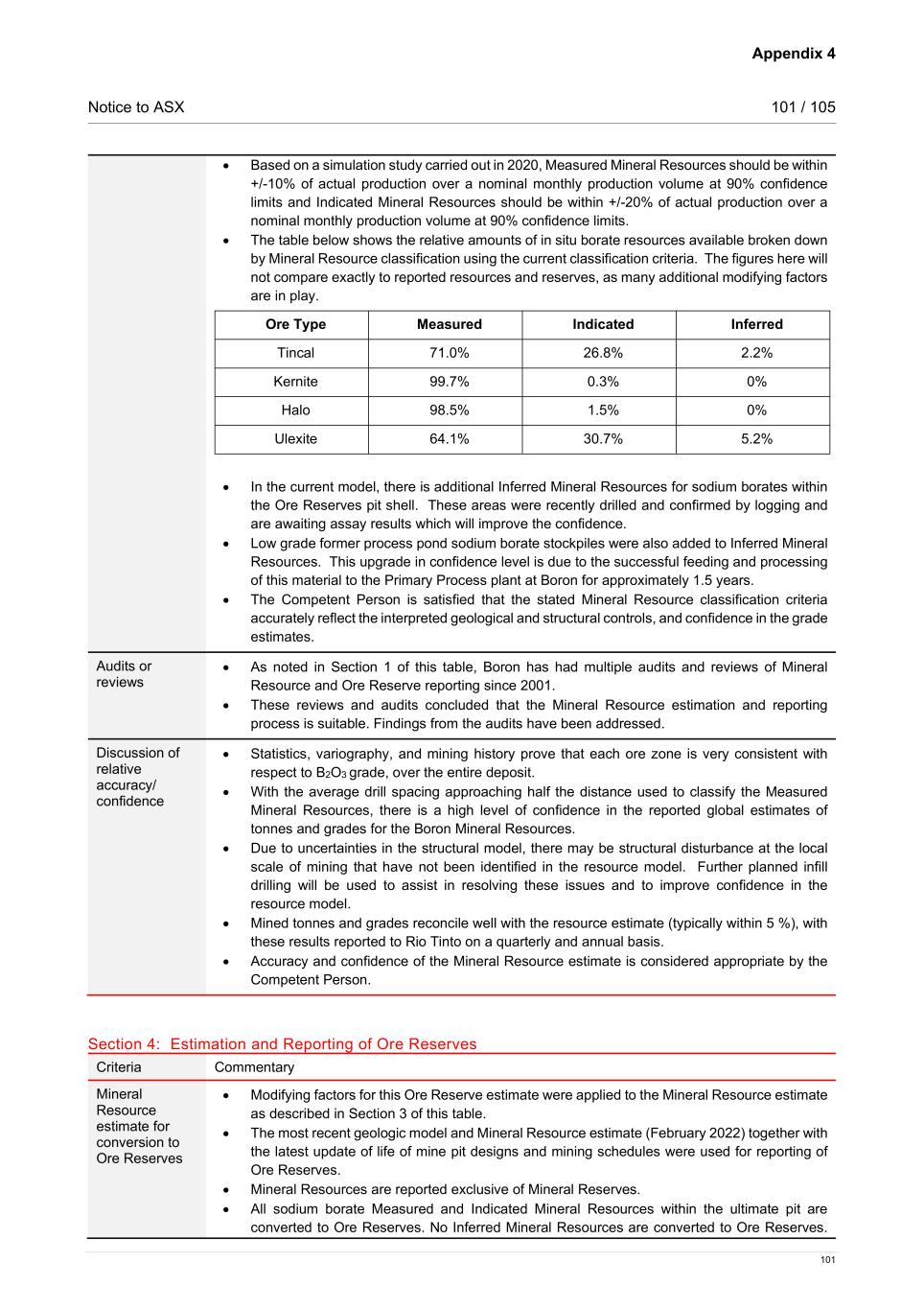 Appendix 4 Notice to ASX 101 / 105 101 • Based on a simulation study carried out in 2020, Measured Mineral Resources should be within +/-10% of actual production over a nominal monthly production volume at 90% confidence limits and Indicated Mineral Resources should be within +/-20% of actual production over a nominal monthly production volume at 90% confidence limits. • The table below shows the relative amounts of in situ borate resources available broken down by Mineral Resource classification using the current classification criteria. The figures here will not compare exactly to reported resources and reserves, as many additional modifying factors are in play. Ore Type Measured Indicated Inferred Tincal 71.0% 26.8% 2.2% Kernite 99.7% 0.3% 0% Halo 98.5% 1.5% 0% Ulexite 64.1% 30.7% 5.2% • In the current model, there is additional Inferred Mineral Resources for sodium borates within the Ore Reserves pit shell. These areas were recently drilled and confirmed by logging and are awaiting assay results which will improve the confidence. • Low grade former process pond sodium borate stockpiles were also added to Inferred Mineral Resources. This upgrade in confidence level is due to the successful feeding and processing of this material to the Primary Process plant at Boron for approximately 1.5 years. • The Competent Person is satisfied that the stated Mineral Resource classification criteria accurately reflect the interpreted geological and structural controls, and confidence in the grade estimates. Audits or reviews • As noted in Section 1 of this table, Boron has had multiple audits and reviews of Mineral Resource and Ore Reserve reporting since 2001. • These reviews and audits concluded that the Mineral Resource estimation and reporting process is suitable. Findings from the audits have been addressed. Discussion of relative accuracy/ confidence • Statistics, variography, and mining history prove that each ore zone is very consistent with respect to B2O3 grade, over the entire deposit. • With the average drill spacing approaching half the distance used to classify the Measured Mineral Resources, there is a high level of confidence in the reported global estimates of tonnes and grades for the Boron Mineral Resources. • Due to uncertainties in the structural model, there may be structural disturbance at the local scale of mining that have not been identified in the resource model. Further planned infill drilling will be used to assist in resolving these issues and to improve confidence in the resource model. • Mined tonnes and grades reconcile well with the resource estimate (typically within 5 %), with these results reported to Rio Tinto on a quarterly and annual basis. • Accuracy and confidence of the Mineral Resource estimate is considered appropriate by the Competent Person. Section 4: Estimation and Reporting of Ore Reserves Criteria Commentary Mineral Resource estimate for conversion to Ore Reserves • Modifying factors for this Ore Reserve estimate were applied to the Mineral Resource estimate as described in Section 3 of this table. • The most recent geologic model and Mineral Resource estimate (February 2022) together with the latest update of life of mine pit designs and mining schedules were used for reporting of Ore Reserves. • Mineral Resources are reported exclusive of Mineral Reserves. • All sodium borate Measured and Indicated Mineral Resources within the ultimate pit are converted to Ore Reserves. No Inferred Mineral Resources are converted to Ore Reserves.