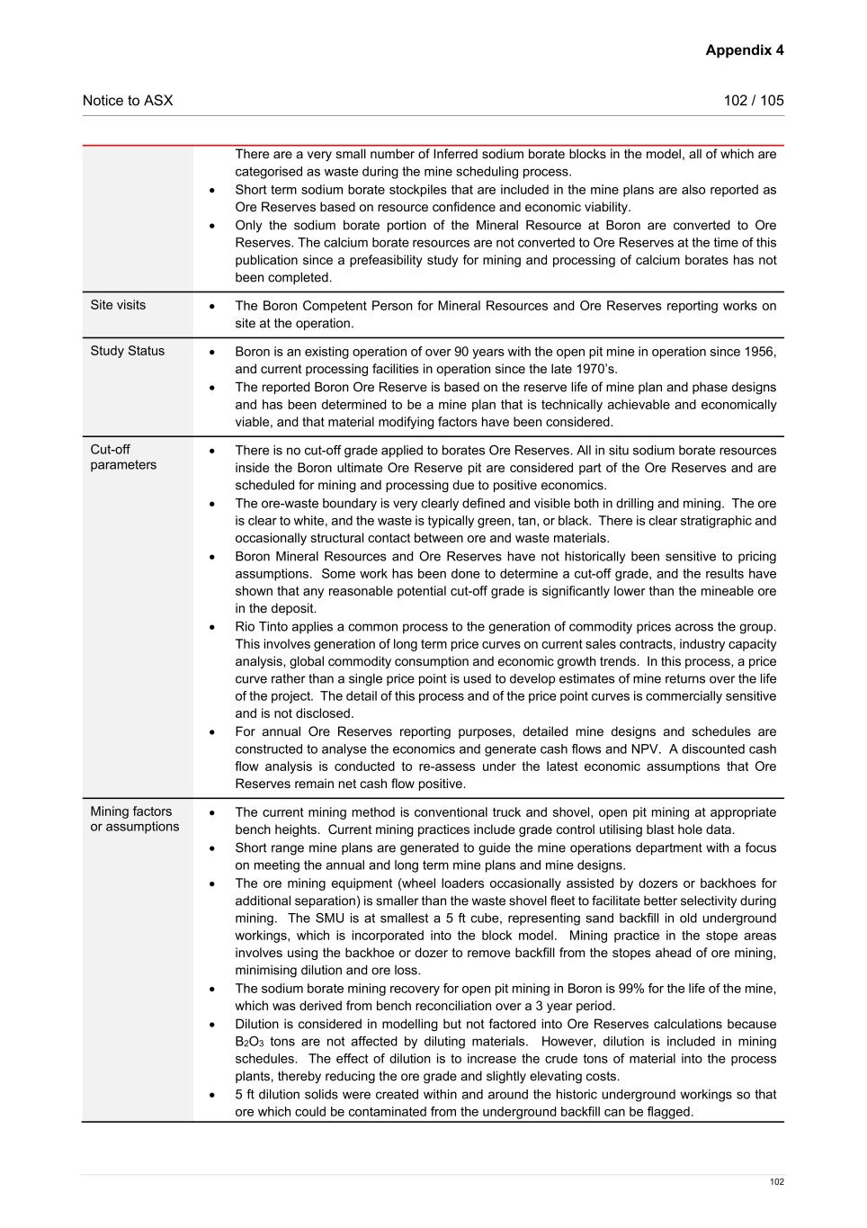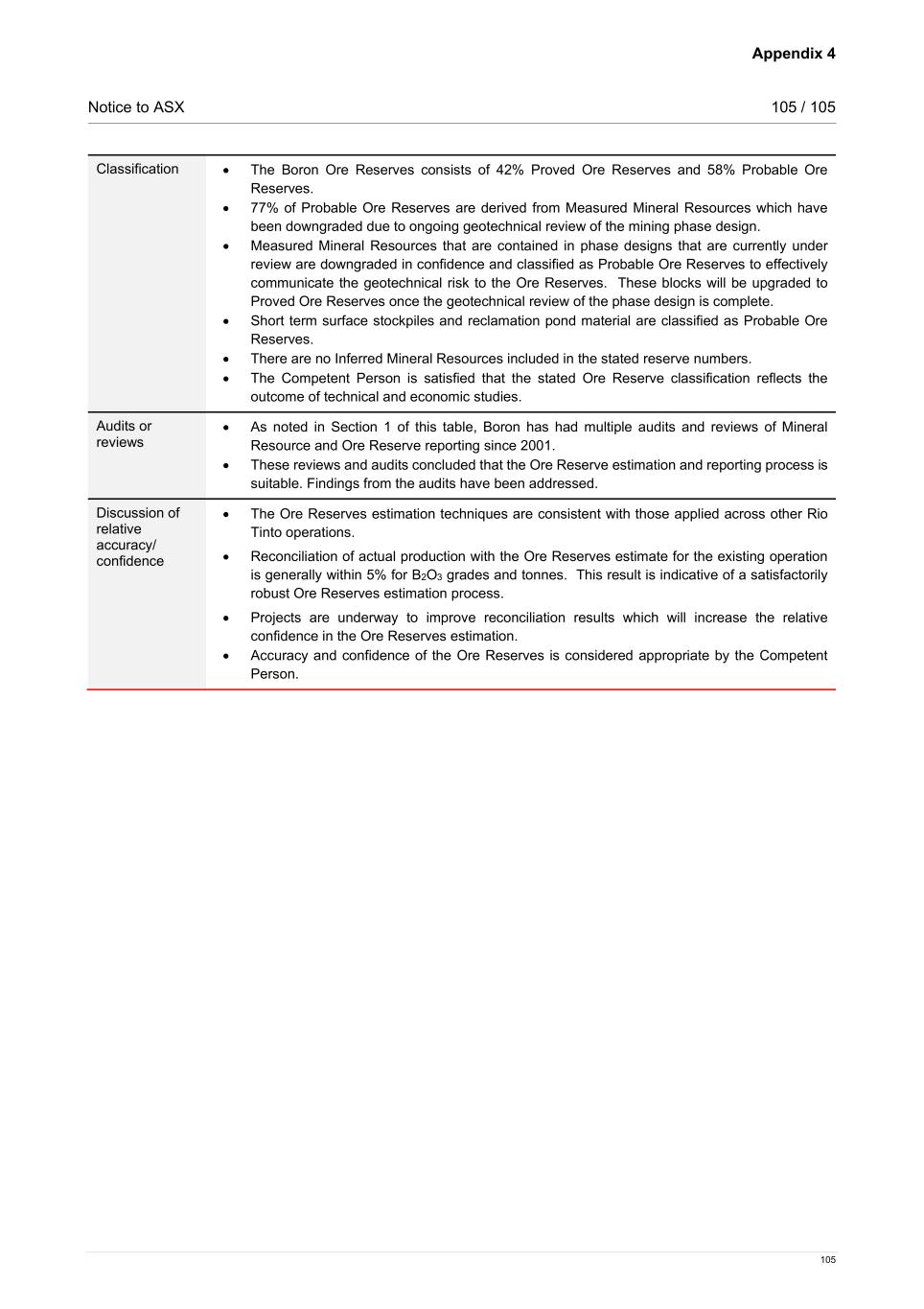 Appendix 4 Notice to ASX 105 / 105 105 Classification • The Boron Ore Reserves consists of 42% Proved Ore Reserves and 58% Probable Ore Reserves. • 77% of Probable Ore Reserves are derived from Measured Mineral Resources which have been downgraded due to ongoing geotechnical review of the mining phase design. • Measured Mineral Resources that are contained in phase designs that are currently under review are downgraded in confidence and classified as Probable Ore Reserves to effectively communicate the geotechnical risk to the Ore Reserves. These blocks will be upgraded to Proved Ore Reserves once the geotechnical review of the phase design is complete. • Short term surface stockpiles and reclamation pond material are classified as Probable Ore Reserves. • There are no Inferred Mineral Resources included in the stated reserve numbers. • The Competent Person is satisfied that the stated Ore Reserve classification reflects the outcome of technical and economic studies. Audits or reviews • As noted in Section 1 of this table, Boron has had multiple audits and reviews of Mineral Resource and Ore Reserve reporting since 2001. • These reviews and audits concluded that the Ore Reserve estimation and reporting process is suitable. Findings from the audits have been addressed. Discussion of relative accuracy/ confidence • The Ore Reserves estimation techniques are consistent with those applied across other Rio Tinto operations. • Reconciliation of actual production with the Ore Reserves estimate for the existing operation is generally within 5% for B2O3 grades and tonnes. This result is indicative of a satisfactorily robust Ore Reserves estimation process. • Projects are underway to improve reconciliation results which will increase the relative confidence in the Ore Reserves estimation. • Accuracy and confidence of the Ore Reserves is considered appropriate by the Competent Person.