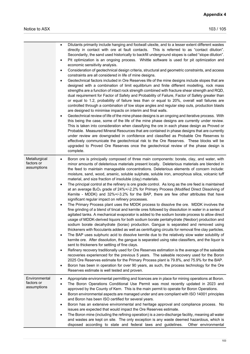 Appendix 4 Notice to ASX 103 / 105 103 • Dilutants primarily include hanging and footwall ulexite, and to a lesser extent different wastes directly in contact with ore at fault contacts. This is referred to as “contact dilution”. Secondarily, the sand used historically to backfill underground stopes is called “stope dilution”. • Pit optimization is an ongoing process. Whittle software is used for pit optimization and economic sensitivity analysis. • Consideration of geotechnical design criteria, structural and geometric constraints, and access constraints are all considered in life of mine designs. • Geotechnical factors included in Ore Reserves life of the mine designs include slopes that are designed with a combination of limit equilibrium and finite different modelling, rock mass strengths are a function of intact rock strength combined with fracture shear strength and RQD, dual requirement for Factor of Safety and Probability of Failure, Factor of Safety greater than or equal to 1.2, probability of failure less than or equal to 20%, overall wall failures are controlled through a combination of low slope angles and regular step outs, production blasts are designed to minimise impacts on interim and final walls. • Geotechnical review of life of the mine phase designs is an ongoing and iterative process. With this being the case, some of the life of the mine phase designs are currently under review. This is taken into consideration when classifying the ore in each phase design as Proved or Probable. Measured Mineral Resources that are contained in phase designs that are currently under review are downgraded in confidence and classified as Probable Ore Reserves to effectively communicate the geotechnical risk to the Ore Reserves. These blocks will be upgraded to Proved Ore Reserves once the geotechnical review of the phase design is complete. Metallurgical factors or assumptions • Boron ore is principally composed of three main components: borate, clay, and water, with minor amounts of deleterious materials present locally. Deleterious materials are blended in the feed to maintain manageable concentrations. Deleterious elements of concern include: moisture, sand, wood, arsenic, soluble sulphate, soluble iron, amorphous silica, volcanic tuff material, and size fraction of insoluble (clay) materials. • The principal control at the refinery is ore grade control. As long as the ore feed is maintained at an average B2O3 grade of 24%+/-2.2% for Primary Process (Modified Direct Dissolving of Kernite - MDDK) and 32%+/-3.2% for the BAP, there are few other attributes that have significant regular impact on refinery processes. • The Primary Process plant uses the MDDK process to dissolve the ore. MDDK involves the fine grinding of a blend of tincal and kernite ores followed by dissolution in water in a series of agitated tanks. A mechanical evaporator is added to the sodium borate process to allow direct usage of MDDK-derived liquors for both sodium borate pentahydrate (Neobor) production and sodium borate decahydrate (borax) production. Gangue is separated and removed using thickeners with flocculants added as well as centrifuging circuits for removal fine clay particles. • The BAP uses sulphuric acid to dissolve kernite due to the relatively slow water solubility of kernite ore. After dissolution, the gangue is separated using rake classifiers, and the liquor is sent to thickeners for settling of fine clays. • Refinery recovery traditionally used for Ore Reserves estimation is the average of the saleable recoveries experienced for the previous 5 years. The saleable recovery used for the Boron 2025 Ore Reserves estimate for the Primary Process plant is 79.8%, and 75.9% for the BAP. • Boron has been in operation for over 90 years, as such, the process technology for the Ore Reserves estimate is well tested and proven. Environmental factors or assumptions • Appropriate environmental permitting and licences are in place for mining operations at Boron. • The Boron Operations Conditional Use Permit was most recently updated in 2023 and approved by the County of Kern. This is the main permit to operate for Boron Operations. • Boron environmental aspects are managed under and are compliant with ISO 14001 principles and Boron has been ISO certified for several years. • Boron has an extensive environmental and heritage approval and compliance process. No issues are expected that would impact the Ore Reserves estimate. • The Boron mine (including the refining operation) is a zero-discharge facility, meaning all water and wastes are kept on site. The only exception is any waste deemed hazardous, which is disposed according to state and federal laws and guidelines. Other environmental