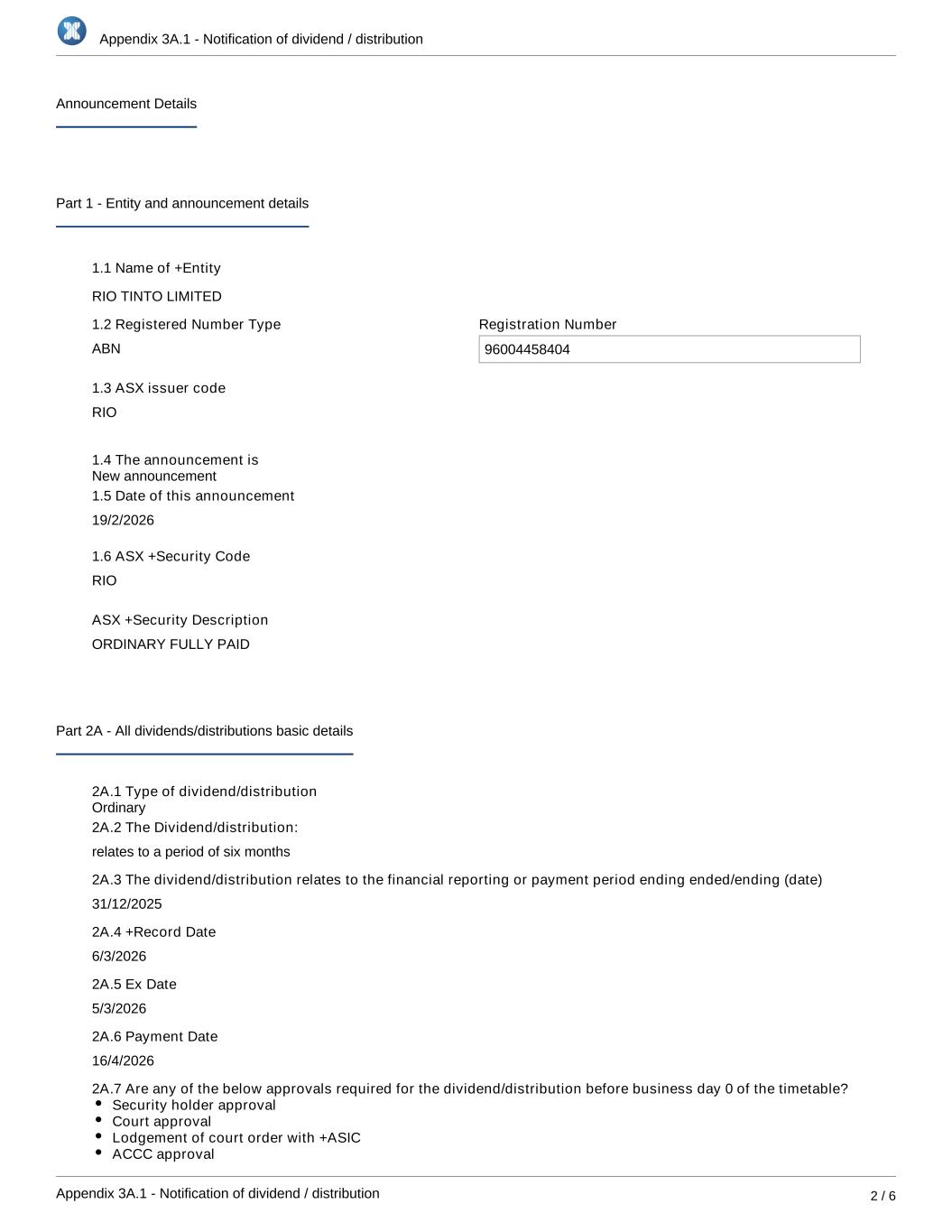 Appendix 3A.1 - Notification of dividend / distribution Appendix 3A.1 - Notification of dividend / distribution 2 / 6 Announcement Details Part 1 - Entity and announcement details 1.1 Name of +Entity RIO TINTO LIMITED 1.2 Registered Number Type ABN Registration Number 96004458404 1.3 ASX issuer code RIO 1.4 The announcement is 1.5 Date of this announcement 19/2/2026 1.6 ASX +Security Code RIO ASX +Security Description ORDINARY FULLY PAID Part 2A - All dividends/distributions basic details 2A.1 Type of dividend/distribution 2A.2 The Dividend/distribution: relates to a period of six months 2A.3 The dividend/distribution relates to the financial reporting or payment period ending ended/ending (date) 31/12/2025 2A.4 +Record Date 6/3/2026 2A.5 Ex Date 5/3/2026 2A.6 Payment Date 16/4/2026 2A.7 Are any of the below approvals required for the dividend/distribution before business day 0 of the timetable? Security holder approval Court approval Lodgement of court order with +ASIC ACCC approval FIRB approval Ordinary New announcement