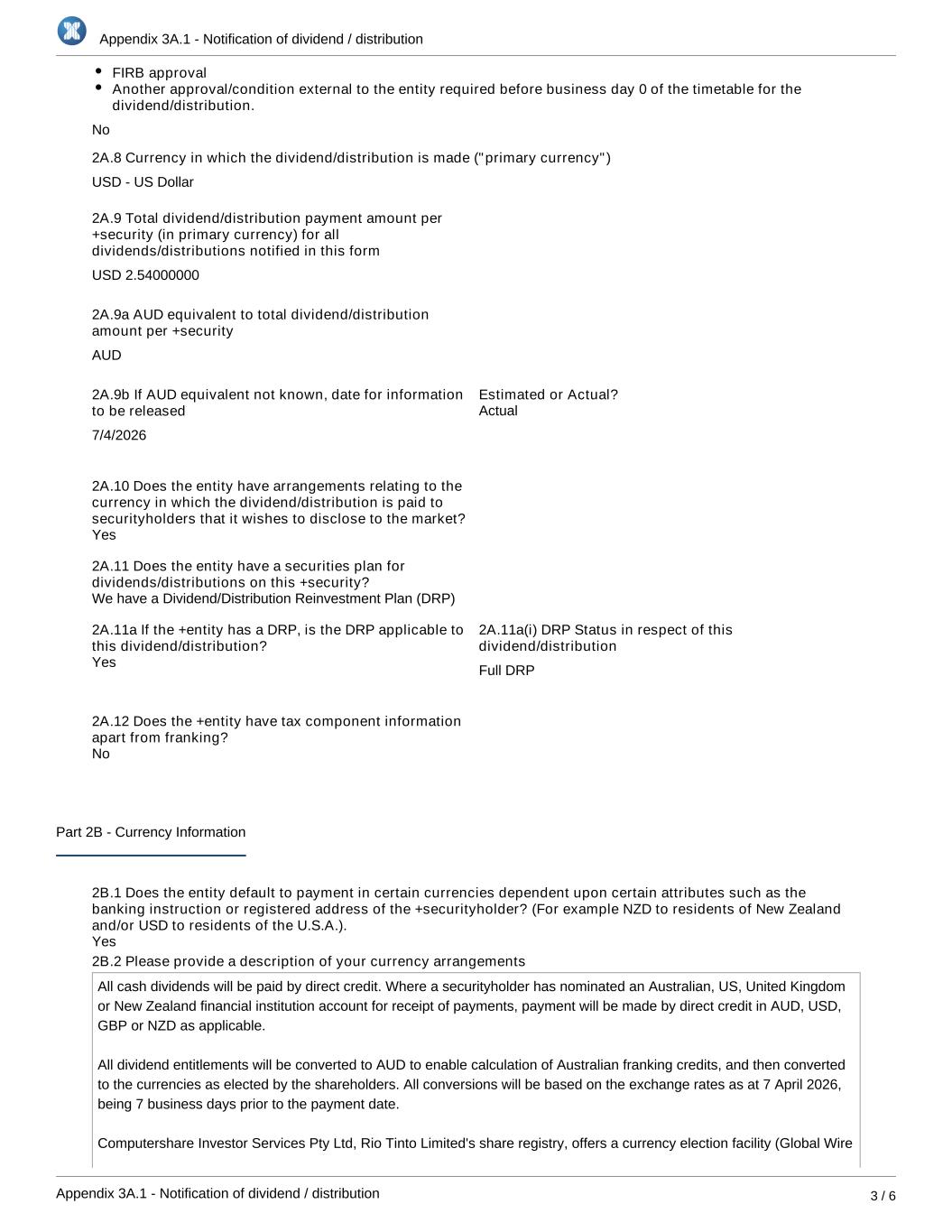 Appendix 3A.1 - Notification of dividend / distribution Appendix 3A.1 - Notification of dividend / distribution 3 / 6 FIRB approval Another approval/condition external to the entity required before business day 0 of the timetable for the dividend/distribution. 2A.8 Currency in which the dividend/distribution is made ("primary currency") USD - US Dollar 2A.9 Total dividend/distribution payment amount per +security (in primary currency) for all dividends/distributions notified in this form USD 2.54000000 2A.9a AUD equivalent to total dividend/distribution amount per +security AUD 2A.9b If AUD equivalent not known, date for information to be released 7/4/2026 Estimated or Actual? 2A.10 Does the entity have arrangements relating to the currency in which the dividend/distribution is paid to securityholders that it wishes to disclose to the market? 2A.11 Does the entity have a securities plan for dividends/distributions on this +security? 2A.11a If the +entity has a DRP, is the DRP applicable to this dividend/distribution? 2A.11a(i) DRP Status in respect of this dividend/distribution Full DRP 2A.12 Does the +entity have tax component information apart from franking? Part 2B - Currency Information 2B.1 Does the entity default to payment in certain currencies dependent upon certain attributes such as the banking instruction or registered address of the +securityholder? (For example NZD to residents of New Zealand and/or USD to residents of the U.S.A.). 2B.2 Please provide a description of your currency arrangements All cash dividends will be paid by direct credit. Where a securityholder has nominated an Australian, US, United Kingdom or New Zealand financial institution account for receipt of payments, payment will be made by direct credit in AUD, USD, GBP or NZD as applicable. All dividend entitlements will be converted to AUD to enable calculation of Australian franking credits, and then converted to the currencies as elected by the shareholders. All conversions will be based on the exchange rates as at 7 April 2026, being 7 business days prior to the payment date. Computershare Investor Services Pty Ltd, Rio Tinto Limited's share registry, offers a currency election facility (Global Wire Yes No Yes We have a Dividend/Distribution Reinvestment Plan (DRP) Yes Actual No