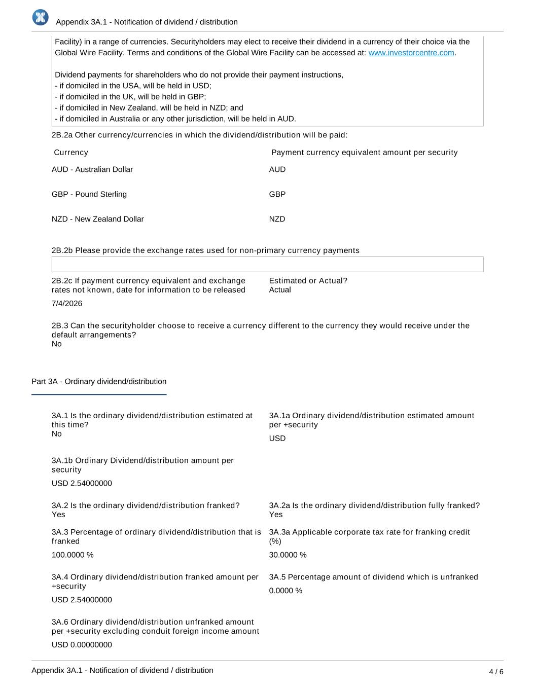 Appendix 3A.1 - Notification of dividend / distribution Appendix 3A.1 - Notification of dividend / distribution 4 / 6 Facility) in a range of currencies. Securityholders may elect to receive their dividend in a currency of their choice via the Global Wire Facility. Terms and conditions of the Global Wire Facility can be accessed at: .www.investorcentre.com Dividend payments for shareholders who do not provide their payment instructions, - if domiciled in the USA, will be held in USD; - if domiciled in the UK, will be held in GBP; - if domiciled in New Zealand, will be held in NZD; and - if domiciled in Australia or any other jurisdiction, will be held in AUD. 2B.2a Other currency/currencies in which the dividend/distribution will be paid: Currency Payment currency equivalent amount per security AUD - Australian Dollar AUD GBP - Pound Sterling GBP NZD - New Zealand Dollar NZD 2B.2b Please provide the exchange rates used for non-primary currency payments 2B.2c If payment currency equivalent and exchange rates not known, date for information to be released 7/4/2026 Estimated or Actual? 2B.3 Can the securityholder choose to receive a currency different to the currency they would receive under the default arrangements? Part 3A - Ordinary dividend/distribution 3A.1 Is the ordinary dividend/distribution estimated at this time? 3A.1a Ordinary dividend/distribution estimated amount per +security USD 3A.1b Ordinary Dividend/distribution amount per security USD 2.54000000 3A.2 Is the ordinary dividend/distribution franked? 3A.2a Is the ordinary dividend/distribution fully franked? 3A.3 Percentage of ordinary dividend/distribution that is franked 100.0000 % 3A.3a Applicable corporate tax rate for franking credit (%) 30.0000 % 3A.4 Ordinary dividend/distribution franked amount per +security USD 2.54000000 3A.5 Percentage amount of dividend which is unfranked 0.0000 % 3A.6 Ordinary dividend/distribution unfranked amount per +security excluding conduit foreign income amount USD 0.00000000 YesYes No No Actual
