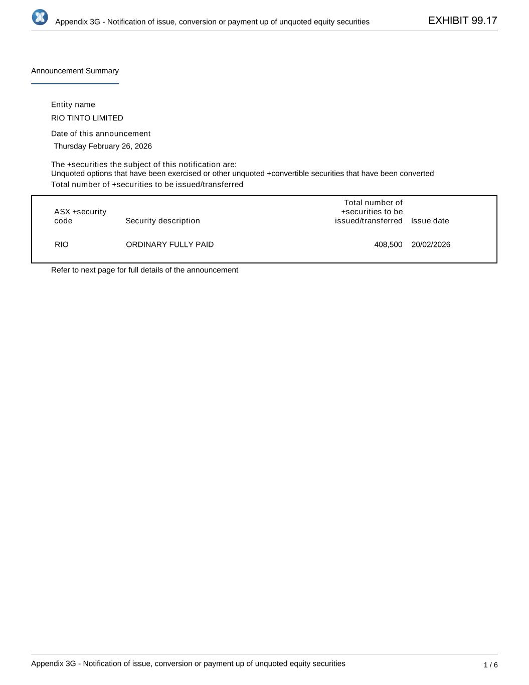 Appendix 3G - Notification of issue, conversion or payment up of unquoted equity securities Appendix 3G - Notification of issue, conversion or payment up of unquoted equity securities 1 / 6 Announcement Summary Entity name RIO TINTO LIMITED Date of this announcement Thursday February 26, 2026 The +securities the subject of this notification are: Total number of +securities to be issued/transferred ASX +security code Security description Total number of +securities to be issued/transferred Issue date RIO ORDINARY FULLY PAID 408,500 20/02/2026 Refer to next page for full details of the announcement Unquoted options that have been exercised or other unquoted +convertible securities that have been converted EXHIBIT 99.17