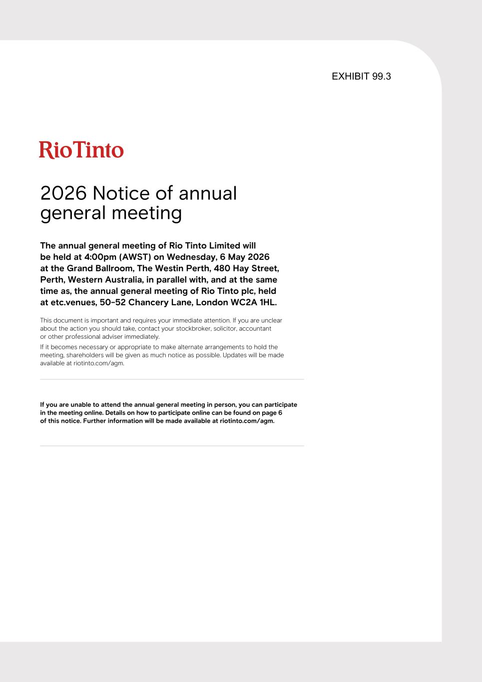 2026 Notice of annual general meeting The annual general meeting of Rio Tinto Limited will be held at 4:00pm (AWST) on Wednesday, 6 May 2026 at the Grand Ballroom, The Westin Perth, 480 Hay Street, Perth, Western Australia, in parallel with, and at the same time as, the annual general meeting of Rio Tinto plc, held at etc.venues, 50-52 Chancery Lane, London WC2A 1HL. This document is important and requires your immediate attention. If you are unclear about the action you should take, contact your stockbroker, solicitor, accountant or other professional adviser immediately. If it becomes necessary or appropriate to make alternate arrangements to hold the meeting, shareholders will be given as much notice as possible. Updates will be made available at riotinto.com/agm. If you are unable to attend the annual general meeting in person, you can participate in the meeting online. Details on how to participate online can be found on page 6 of this notice. Further information will be made available at riotinto.com/agm. EXHIBIT 99.3