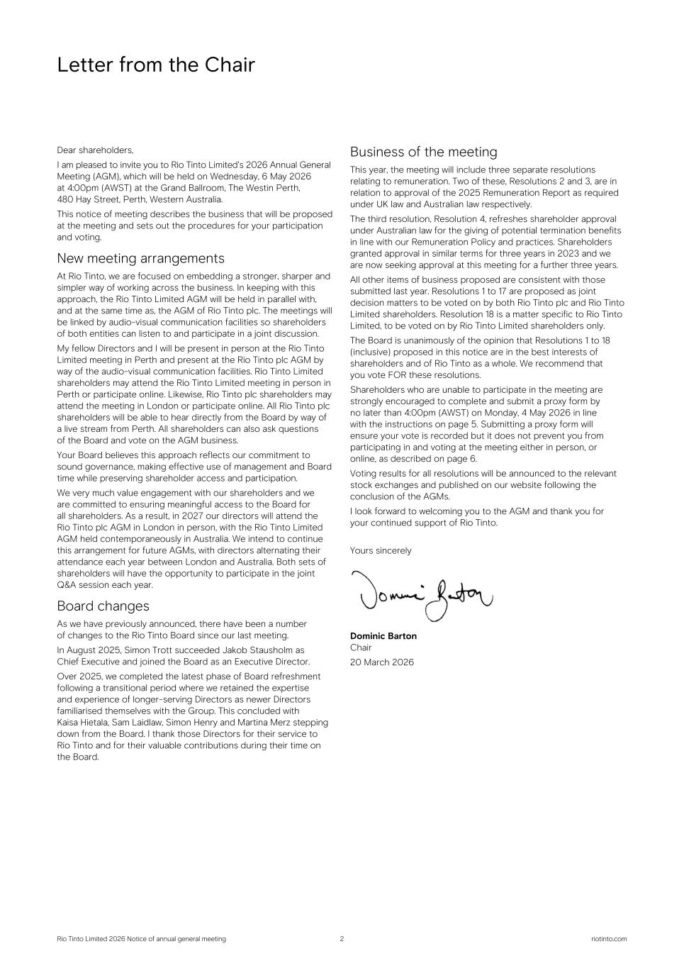 Letter from the Chair Dear shareholders, I am pleased to invite you to Rio Tinto Limited’s 2026 Annual General Meeting (AGM), which will be held on Wednesday, 6 May 2026 at 4:00pm (AWST) at the Grand Ballroom, The Westin Perth, 480 Hay Street, Perth, Western Australia. This notice of meeting describes the business that will be proposed at the meeting and sets out the procedures for your participation and voting. New meeting arrangements At Rio Tinto, we are focused on embedding a stronger, sharper and simpler way of working across the business. In keeping with this approach, the Rio Tinto Limited AGM will be held in parallel with, and at the same time as, the AGM of Rio Tinto plc. The meetings will be linked by audio-visual communication facilities so shareholders of both entities can listen to and participate in a joint discussion. My fellow Directors and I will be present in person at the Rio Tinto Limited meeting in Perth and present at the Rio Tinto plc AGM by way of the audio-visual communication facilities. Rio Tinto Limited shareholders may attend the Rio Tinto Limited meeting in person in Perth or participate online. Likewise, Rio Tinto plc shareholders may attend the meeting in London or participate online. All Rio Tinto plc shareholders will be able to hear directly from the Board by way of a live stream from Perth. All shareholders can also ask questions of the Board and vote on the AGM business. Your Board believes this approach reflects our commitment to sound governance, making effective use of management and Board time while preserving shareholder access and participation. We very much value engagement with our shareholders and we are committed to ensuring meaningful access to the Board for all shareholders. As a result, in 2027 our directors will attend the Rio Tinto plc AGM in London in person, with the Rio Tinto Limited AGM held contemporaneously in Australia. We intend to continue this arrangement for future AGMs, with directors alternating their attendance each year between London and Australia. Both sets of shareholders will have the opportunity to participate in the joint Q&A session each year. Board changes As we have previously announced, there have been a number of changes to the Rio Tinto Board since our last meeting. In August 2025, Simon Trott succeeded Jakob Stausholm as Chief Executive and joined the Board as an Executive Director. Over 2025, we completed the latest phase of Board refreshment following a transitional period where we retained the expertise and experience of longer‑serving Directors as newer Directors familiarised themselves with the Group. This concluded with Kaisa Hietala, Sam Laidlaw, Simon Henry and Martina Merz stepping down from the Board. I thank those Directors for their service to Rio Tinto and for their valuable contributions during their time on the Board. Business of the meeting This year, the meeting will include three separate resolutions relating to remuneration. Two of these, Resolutions 2 and 3, are in relation to approval of the 2025 Remuneration Report as required under UK law and Australian law respectively. The third resolution, Resolution 4, refreshes shareholder approval under Australian law for the giving of potential termination benefits in line with our Remuneration Policy and practices. Shareholders granted approval in similar terms for three years in 2023 and we are now seeking approval at this meeting for a further three years. All other items of business proposed are consistent with those submitted last year. Resolutions 1 to 17 are proposed as joint decision matters to be voted on by both Rio Tinto plc and Rio Tinto Limited shareholders. Resolution 18 is a matter specific to Rio Tinto Limited, to be voted on by Rio Tinto Limited shareholders only. The Board is unanimously of the opinion that Resolutions 1 to 18 (inclusive) proposed in this notice are in the best interests of shareholders and of Rio Tinto as a whole. We recommend that you vote FOR these resolutions. Shareholders who are unable to participate in the meeting are strongly encouraged to complete and submit a proxy form by no later than 4:00pm (AWST) on Monday, 4 May 2026 in line with the instructions on page 5. Submitting a proxy form will ensure your vote is recorded but it does not prevent you from participating in and voting at the meeting either in person, or online, as described on page 6. Voting results for all resolutions will be announced to the relevant stock exchanges and published on our website following the conclusion of the AGMs. I look forward to welcoming you to the AGM and thank you for your continued support of Rio Tinto. Yours sincerely Dominic Barton Chair 20 March 2026 2Rio Tinto Limited 2026 Notice of annual general meeting riotinto.com