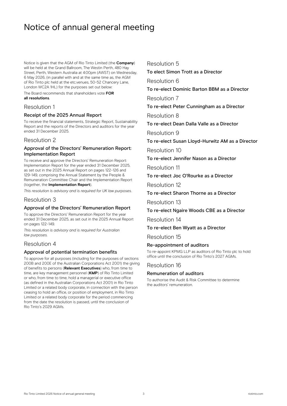 Notice of annual general meeting Notice is given that the AGM of Rio Tinto Limited (the Company) will be held at the Grand Ballroom, The Westin Perth, 480 Hay Street, Perth, Western Australia at 4:00pm (AWST) on Wednesday, 6 May 2026, (in parallel with and at the same time as, the AGM of Rio Tinto plc held at the etc.venues, 50-52 Chancery Lane, London WC2A 1HL) for the purposes set out below: The Board recommends that shareholders vote FOR all resolutions. Resolution 1 Receipt of the 2025 Annual Report To receive the financial statements, Strategic Report, Sustainability Report and the reports of the Directors and auditors for the year ended 31 December 2025. Resolution 2 Approval of the Directors’ Remuneration Report: Implementation Report To receive and approve the Directors’ Remuneration Report: Implementation Report for the year ended 31 December 2025, as set out in the 2025 Annual Report on pages 122-126 and 129-149, comprising the Annual Statement by the People & Remuneration Committee Chair and the Implementation Report (together, the Implementation Report). This resolution is advisory and is required for UK law purposes. Resolution 3 Approval of the Directors’ Remuneration Report To approve the Directors’ Remuneration Report for the year ended 31 December 2025, as set out in the 2025 Annual Report on pages 122-149. This resolution is advisory and is required for Australian law purposes. Resolution 4 Approval of potential termination benefits To approve for all purposes (including for the purposes of sections 200B and 200E of the Australian Corporations Act 2001) the giving of benefits to persons (Relevant Executives) who, from time to time, are key management personnel (KMP) of Rio Tinto Limited or who, from time to time, hold a managerial or executive office (as defined in the Australian Corporations Act 2001) in Rio Tinto Limited or a related body corporate, in connection with the person ceasing to hold an office, or position of employment, in Rio Tinto Limited or a related body corporate for the period commencing from the date the resolution is passed, until the conclusion of Rio Tinto’s 2029 AGMs. Resolution 5 To elect Simon Trott as a Director Resolution 6 To re-elect Dominic Barton BBM as a Director Resolution 7 To re-elect Peter Cunningham as a Director Resolution 8 To re-elect Dean Dalla Valle as a Director Resolution 9 To re-elect Susan Lloyd-Hurwitz AM as a Director Resolution 10 To re-elect Jennifer Nason as a Director Resolution 11 To re-elect Joc O’Rourke as a Director Resolution 12 To re-elect Sharon Thorne as a Director Resolution 13 To re-elect Ngaire Woods CBE as a Director Resolution 14 To re-elect Ben Wyatt as a Director Resolution 15 Re-appointment of auditors To re-appoint KPMG LLP as auditors of Rio Tinto plc to hold office until the conclusion of Rio Tinto’s 2027 AGMs. Resolution 16 Remuneration of auditors To authorise the Audit & Risk Committee to determine the auditors’ remuneration. 3Rio Tinto Limited 2026 Notice of annual general meeting riotinto.com