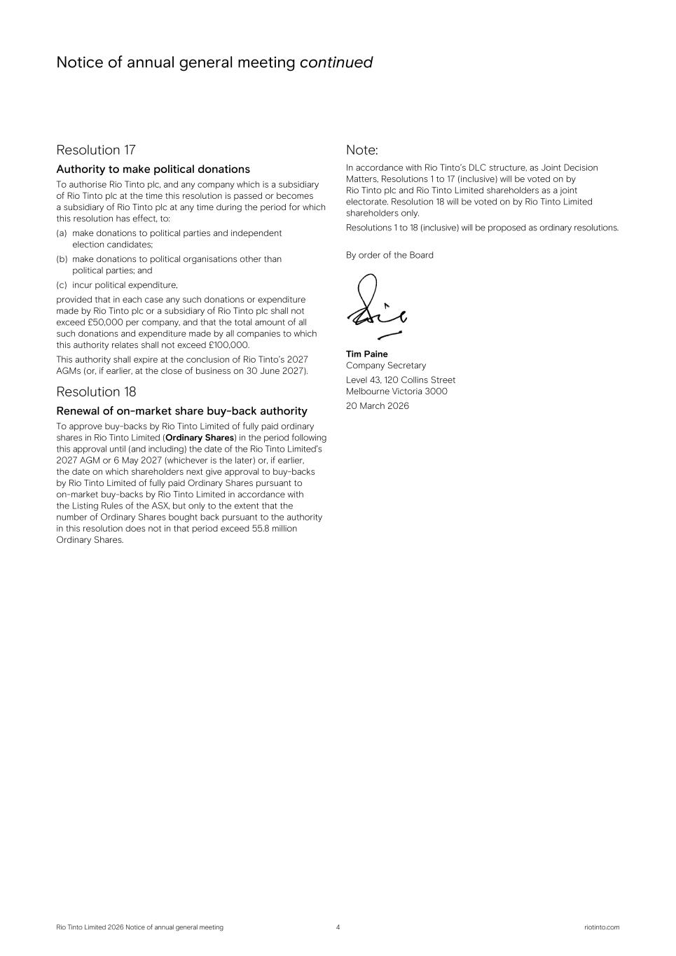 Notice of annual general meeting continued Resolution 17 Authority to make political donations To authorise Rio Tinto plc, and any company which is a subsidiary of Rio Tinto plc at the time this resolution is passed or becomes a subsidiary of Rio Tinto plc at any time during the period for which this resolution has effect, to: (a) make donations to political parties and independent election candidates; (b) make donations to political organisations other than political parties; and (c) incur political expenditure, provided that in each case any such donations or expenditure made by Rio Tinto plc or a subsidiary of Rio Tinto plc shall not exceed £50,000 per company, and that the total amount of all such donations and expenditure made by all companies to which this authority relates shall not exceed £100,000. This authority shall expire at the conclusion of Rio Tinto’s 2027 AGMs (or, if earlier, at the close of business on 30 June 2027). Resolution 18 Renewal of on-market share buy-back authority To approve buy-backs by Rio Tinto Limited of fully paid ordinary shares in Rio Tinto Limited (Ordinary Shares) in the period following this approval until (and including) the date of the Rio Tinto Limited’s 2027 AGM or 6 May 2027 (whichever is the later) or, if earlier, the date on which shareholders next give approval to buy-backs by Rio Tinto Limited of fully paid Ordinary Shares pursuant to on-market buy-backs by Rio Tinto Limited in accordance with the Listing Rules of the ASX, but only to the extent that the number of Ordinary Shares bought back pursuant to the authority in this resolution does not in that period exceed 55.8 million Ordinary Shares. Note: In accordance with Rio Tinto’s DLC structure, as Joint Decision Matters, Resolutions 1 to 17 (inclusive) will be voted on by Rio Tinto plc and Rio Tinto Limited shareholders as a joint electorate. Resolution 18 will be voted on by Rio Tinto Limited shareholders only. Resolutions 1 to 18 (inclusive) will be proposed as ordinary resolutions. By order of the Board Tim Paine Company Secretary Level 43, 120 Collins Street Melbourne Victoria 3000 20 March 2026 4Rio Tinto Limited 2026 Notice of annual general meeting riotinto.com