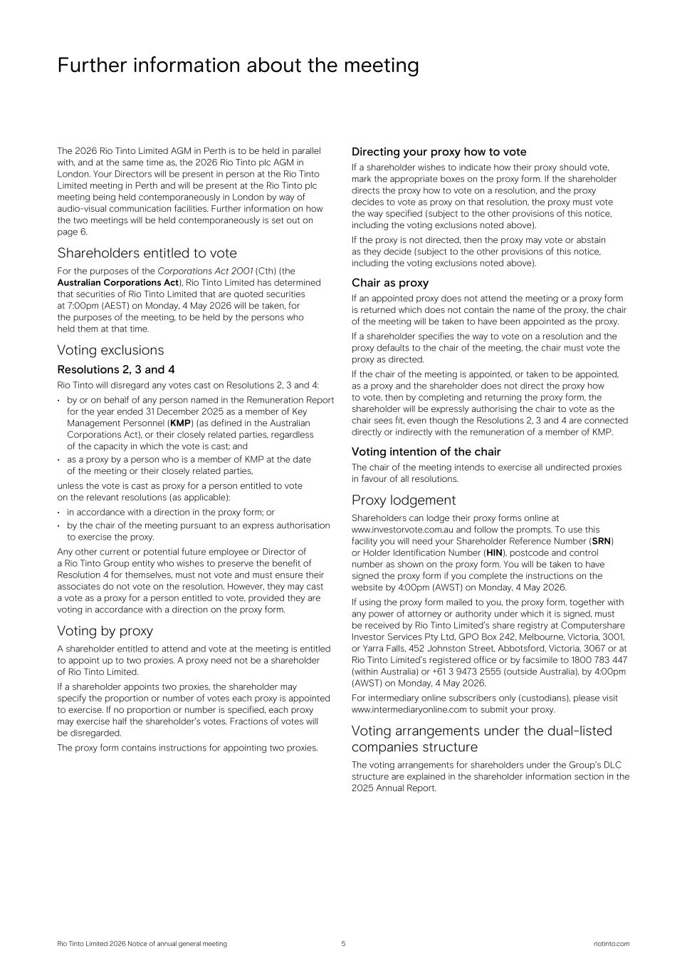 Further information about the meeting The 2026 Rio Tinto Limited AGM in Perth is to be held in parallel with, and at the same time as, the 2026 Rio Tinto plc AGM in London. Your Directors will be present in person at the Rio Tinto Limited meeting in Perth and will be present at the Rio Tinto plc meeting being held contemporaneously in London by way of audio-visual communication facilities. Further information on how the two meetings will be held contemporaneously is set out on page 6. Shareholders entitled to vote For the purposes of the Corporations Act 2001 (Cth) (the Australian Corporations Act), Rio Tinto Limited has determined that securities of Rio Tinto Limited that are quoted securities at 7:00pm (AEST) on Monday, 4 May 2026 will be taken, for the purposes of the meeting, to be held by the persons who held them at that time. Voting exclusions Resolutions 2, 3 and 4 Rio Tinto will disregard any votes cast on Resolutions 2, 3 and 4: • by or on behalf of any person named in the Remuneration Report for the year ended 31 December 2025 as a member of Key Management Personnel (KMP) (as defined in the Australian Corporations Act), or their closely related parties, regardless of the capacity in which the vote is cast; and • as a proxy by a person who is a member of KMP at the date of the meeting or their closely related parties, unless the vote is cast as proxy for a person entitled to vote on the relevant resolutions (as applicable): • in accordance with a direction in the proxy form; or • by the chair of the meeting pursuant to an express authorisation to exercise the proxy. Any other current or potential future employee or Director of a Rio Tinto Group entity who wishes to preserve the benefit of Resolution 4 for themselves, must not vote and must ensure their associates do not vote on the resolution. However, they may cast a vote as a proxy for a person entitled to vote, provided they are voting in accordance with a direction on the proxy form. Voting by proxy A shareholder entitled to attend and vote at the meeting is entitled to appoint up to two proxies. A proxy need not be a shareholder of Rio Tinto Limited. If a shareholder appoints two proxies, the shareholder may specify the proportion or number of votes each proxy is appointed to exercise. If no proportion or number is specified, each proxy may exercise half the shareholder’s votes. Fractions of votes will be disregarded. The proxy form contains instructions for appointing two proxies. Directing your proxy how to vote If a shareholder wishes to indicate how their proxy should vote, mark the appropriate boxes on the proxy form. If the shareholder directs the proxy how to vote on a resolution, and the proxy decides to vote as proxy on that resolution, the proxy must vote the way specified (subject to the other provisions of this notice, including the voting exclusions noted above). If the proxy is not directed, then the proxy may vote or abstain as they decide (subject to the other provisions of this notice, including the voting exclusions noted above). Chair as proxy If an appointed proxy does not attend the meeting or a proxy form is returned which does not contain the name of the proxy, the chair of the meeting will be taken to have been appointed as the proxy. If a shareholder specifies the way to vote on a resolution and the proxy defaults to the chair of the meeting, the chair must vote the proxy as directed. If the chair of the meeting is appointed, or taken to be appointed, as a proxy and the shareholder does not direct the proxy how to vote, then by completing and returning the proxy form, the shareholder will be expressly authorising the chair to vote as the chair sees fit, even though the Resolutions 2, 3 and 4 are connected directly or indirectly with the remuneration of a member of KMP. Voting intention of the chair The chair of the meeting intends to exercise all undirected proxies in favour of all resolutions. Proxy lodgement Shareholders can lodge their proxy forms online at www.investorvote.com.au and follow the prompts. To use this facility you will need your Shareholder Reference Number (SRN) or Holder Identification Number (HIN), postcode and control number as shown on the proxy form. You will be taken to have signed the proxy form if you complete the instructions on the website by 4:00pm (AWST) on Monday, 4 May 2026. If using the proxy form mailed to you, the proxy form, together with any power of attorney or authority under which it is signed, must be received by Rio Tinto Limited’s share registry at Computershare Investor Services Pty Ltd, GPO Box 242, Melbourne, Victoria, 3001, or Yarra Falls, 452 Johnston Street, Abbotsford, Victoria, 3067 or at Rio Tinto Limited’s registered office or by facsimile to 1800 783 447 (within Australia) or +61 3 9473 2555 (outside Australia), by 4:00pm (AWST) on Monday, 4 May 2026. For intermediary online subscribers only (custodians), please visit www.intermediaryonline.com to submit your proxy. Voting arrangements under the dual-listed companies structure The voting arrangements for shareholders under the Group’s DLC structure are explained in the shareholder information section in the 2025 Annual Report. 5Rio Tinto Limited 2026 Notice of annual general meeting riotinto.com