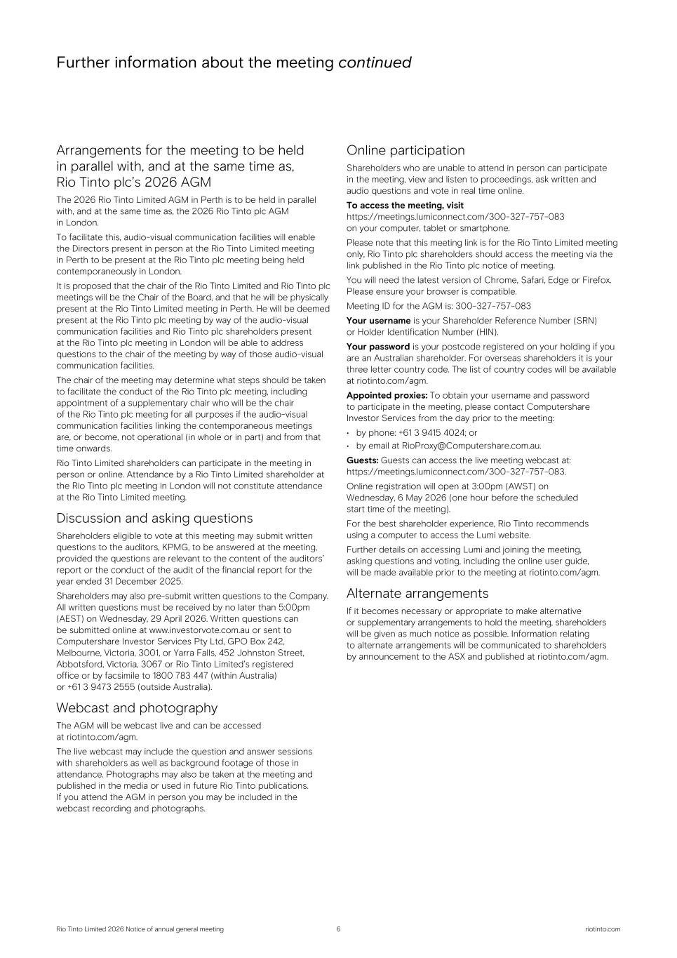 Further information about the meeting continued Arrangements for the meeting to be held in parallel with, and at the same time as, Rio Tinto plc’s 2026 AGM The 2026 Rio Tinto Limited AGM in Perth is to be held in parallel with, and at the same time as, the 2026 Rio Tinto plc AGM in London. To facilitate this, audio-visual communication facilities will enable the Directors present in person at the Rio Tinto Limited meeting in Perth to be present at the Rio Tinto plc meeting being held contemporaneously in London. It is proposed that the chair of the Rio Tinto Limited and Rio Tinto plc meetings will be the Chair of the Board, and that he will be physically present at the Rio Tinto Limited meeting in Perth. He will be deemed present at the Rio Tinto plc meeting by way of the audio-visual communication facilities and Rio Tinto plc shareholders present at the Rio Tinto plc meeting in London will be able to address questions to the chair of the meeting by way of those audio-visual communication facilities. The chair of the meeting may determine what steps should be taken to facilitate the conduct of the Rio Tinto plc meeting, including appointment of a supplementary chair who will be the chair of the Rio Tinto plc meeting for all purposes if the audio-visual communication facilities linking the contemporaneous meetings are, or become, not operational (in whole or in part) and from that time onwards. Rio Tinto Limited shareholders can participate in the meeting in person or online. Attendance by a Rio Tinto Limited shareholder at the Rio Tinto plc meeting in London will not constitute attendance at the Rio Tinto Limited meeting. Discussion and asking questions Shareholders eligible to vote at this meeting may submit written questions to the auditors, KPMG, to be answered at the meeting, provided the questions are relevant to the content of the auditors’ report or the conduct of the audit of the financial report for the year ended 31 December 2025. Shareholders may also pre-submit written questions to the Company. All written questions must be received by no later than 5:00pm (AEST) on Wednesday, 29 April 2026. Written questions can be submitted online at www.investorvote.com.au or sent to Computershare Investor Services Pty Ltd, GPO Box 242, Melbourne, Victoria, 3001, or Yarra Falls, 452 Johnston Street, Abbotsford, Victoria, 3067 or Rio Tinto Limited’s registered office or by facsimile to 1800 783 447 (within Australia) or +61 3 9473 2555 (outside Australia). Webcast and photography The AGM will be webcast live and can be accessed at riotinto.com/agm. The live webcast may include the question and answer sessions with shareholders as well as background footage of those in attendance. Photographs may also be taken at the meeting and published in the media or used in future Rio Tinto publications. If you attend the AGM in person you may be included in the webcast recording and photographs. Online participation Shareholders who are unable to attend in person can participate in the meeting, view and listen to proceedings, ask written and audio questions and vote in real time online. To access the meeting, visit https://meetings.lumiconnect.com/300-327-757-083 on your computer, tablet or smartphone. Please note that this meeting link is for the Rio Tinto Limited meeting only, Rio Tinto plc shareholders should access the meeting via the link published in the Rio Tinto plc notice of meeting. You will need the latest version of Chrome, Safari, Edge or Firefox. Please ensure your browser is compatible. Meeting ID for the AGM is: 300-327-757-083 Your username is your Shareholder Reference Number (SRN) or Holder Identification Number (HIN). Your password is your postcode registered on your holding if you are an Australian shareholder. For overseas shareholders it is your three letter country code. The list of country codes will be available at riotinto.com/agm. Appointed proxies: To obtain your username and password to participate in the meeting, please contact Computershare Investor Services from the day prior to the meeting: • by phone: +61 3 9415 4024; or • by email at RioProxy@Computershare.com.au. Guests: Guests can access the live meeting webcast at: https://meetings.lumiconnect.com/300-327-757-083. Online registration will open at 3:00pm (AWST) on Wednesday, 6 May 2026 (one hour before the scheduled start time of the meeting). For the best shareholder experience, Rio Tinto recommends using a computer to access the Lumi website. Further details on accessing Lumi and joining the meeting, asking questions and voting, including the online user guide, will be made available prior to the meeting at riotinto.com/agm. Alternate arrangements If it becomes necessary or appropriate to make alternative or supplementary arrangements to hold the meeting, shareholders will be given as much notice as possible. Information relating to alternate arrangements will be communicated to shareholders by announcement to the ASX and published at riotinto.com/agm. 6Rio Tinto Limited 2026 Notice of annual general meeting riotinto.com