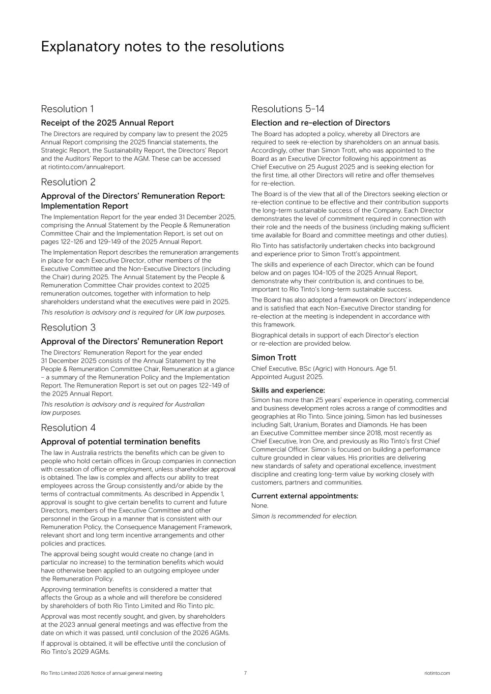 Explanatory notes to the resolutions Resolution 1 Receipt of the 2025 Annual Report The Directors are required by company law to present the 2025 Annual Report comprising the 2025 financial statements, the Strategic Report, the Sustainability Report, the Directors’ Report and the Auditors’ Report to the AGM. These can be accessed at riotinto.com/annualreport. Resolution 2 Approval of the Directors’ Remuneration Report: Implementation Report The Implementation Report for the year ended 31 December 2025, comprising the Annual Statement by the People & Remuneration Committee Chair and the Implementation Report, is set out on pages 122-126 and 129-149 of the 2025 Annual Report. The Implementation Report describes the remuneration arrangements in place for each Executive Director, other members of the Executive Committee and the Non-Executive Directors (including the Chair) during 2025. The Annual Statement by the People & Remuneration Committee Chair provides context to 2025 remuneration outcomes, together with information to help shareholders understand what the executives were paid in 2025. This resolution is advisory and is required for UK law purposes. Resolution 3 Approval of the Directors’ Remuneration Report The Directors’ Remuneration Report for the year ended 31 December 2025 consists of the Annual Statement by the People & Remuneration Committee Chair, Remuneration at a glance – a summary of the Remuneration Policy and the Implementation Report. The Remuneration Report is set out on pages 122-149 of the 2025 Annual Report. This resolution is advisory and is required for Australian law purposes. Resolution 4 Approval of potential termination benefits The law in Australia restricts the benefits which can be given to people who hold certain offices in Group companies in connection with cessation of office or employment, unless shareholder approval is obtained. The law is complex and affects our ability to treat employees across the Group consistently and/or abide by the terms of contractual commitments. As described in Appendix 1, approval is sought to give certain benefits to current and future Directors, members of the Executive Committee and other personnel in the Group in a manner that is consistent with our Remuneration Policy, the Consequence Management Framework, relevant short and long term incentive arrangements and other policies and practices. The approval being sought would create no change (and in particular no increase) to the termination benefits which would have otherwise been applied to an outgoing employee under the Remuneration Policy. Approving termination benefits is considered a matter that affects the Group as a whole and will therefore be considered by shareholders of both Rio Tinto Limited and Rio Tinto plc. Approval was most recently sought, and given, by shareholders at the 2023 annual general meetings and was effective from the date on which it was passed, until conclusion of the 2026 AGMs. If approval is obtained, it will be effective until the conclusion of Rio Tinto’s 2029 AGMs. Resolutions 5-14 Election and re-election of Directors The Board has adopted a policy, whereby all Directors are required to seek re-election by shareholders on an annual basis. Accordingly, other than Simon Trott, who was appointed to the Board as an Executive Director following his appointment as Chief Executive on 25 August 2025 and is seeking election for the first time, all other Directors will retire and offer themselves for re-election. The Board is of the view that all of the Directors seeking election or re-election continue to be effective and their contribution supports the long-term sustainable success of the Company. Each Director demonstrates the level of commitment required in connection with their role and the needs of the business (including making sufficient time available for Board and committee meetings and other duties). Rio Tinto has satisfactorily undertaken checks into background and experience prior to Simon Trott’s appointment. The skills and experience of each Director, which can be found below and on pages 104-105 of the 2025 Annual Report, demonstrate why their contribution is, and continues to be, important to Rio Tinto’s long-term sustainable success. The Board has also adopted a framework on Directors’ independence and is satisfied that each Non-Executive Director standing for re-election at the meeting is independent in accordance with this framework. Biographical details in support of each Director’s election or re-election are provided below. Simon Trott Chief Executive, BSc (Agric) with Honours. Age 51. Appointed August 2025. Skills and experience: Simon has more than 25 years’ experience in operating, commercial and business development roles across a range of commodities and geographies at Rio Tinto. Since joining, Simon has led businesses including Salt, Uranium, Borates and Diamonds. He has been an Executive Committee member since 2018, most recently as Chief Executive, Iron Ore, and previously as Rio Tinto’s first Chief Commercial Officer. Simon is focused on building a performance culture grounded in clear values. His priorities are delivering new standards of safety and operational excellence, investment discipline and creating long-term value by working closely with customers, partners and communities. Current external appointments: None. Simon is recommended for election. 7Rio Tinto Limited 2026 Notice of annual general meeting riotinto.com