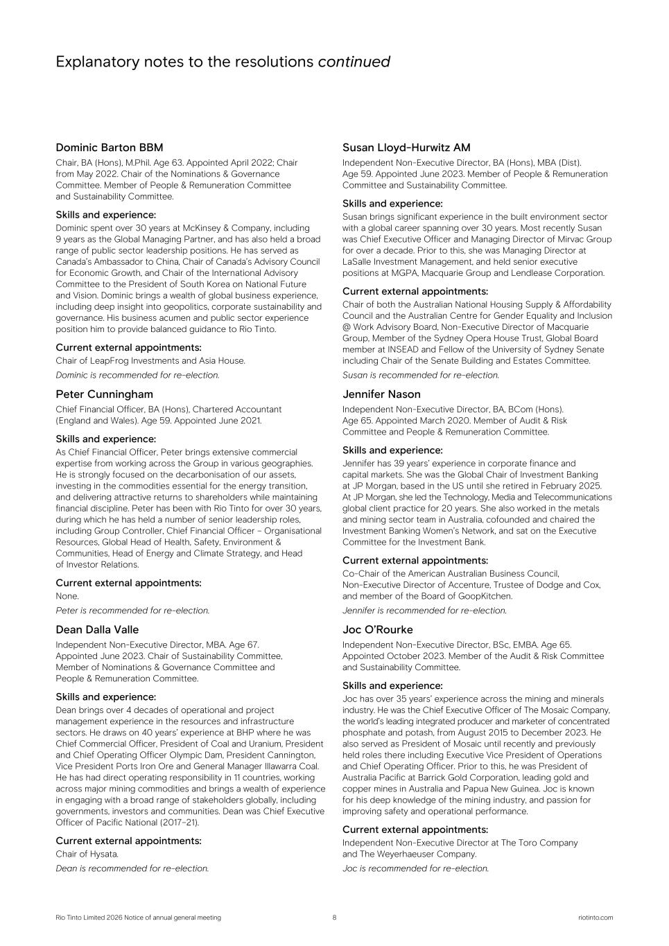 Explanatory notes to the resolutions continued Dominic Barton BBM Chair, BA (Hons), M.Phil. Age 63. Appointed April 2022; Chair from May 2022. Chair of the Nominations & Governance Committee. Member of People & Remuneration Committee and Sustainability Committee. Skills and experience: Dominic spent over 30 years at McKinsey & Company, including 9 years as the Global Managing Partner, and has also held a broad range of public sector leadership positions. He has served as Canada’s Ambassador to China, Chair of Canada’s Advisory Council for Economic Growth, and Chair of the International Advisory Committee to the President of South Korea on National Future and Vision. Dominic brings a wealth of global business experience, including deep insight into geopolitics, corporate sustainability and governance. His business acumen and public sector experience position him to provide balanced guidance to Rio Tinto. Current external appointments: Chair of LeapFrog Investments and Asia House. Dominic is recommended for re-election. Peter Cunningham Chief Financial Officer, BA (Hons), Chartered Accountant (England and Wales). Age 59. Appointed June 2021. Skills and experience: As Chief Financial Officer, Peter brings extensive commercial expertise from working across the Group in various geographies. He is strongly focused on the decarbonisation of our assets, investing in the commodities essential for the energy transition, and delivering attractive returns to shareholders while maintaining financial discipline. Peter has been with Rio Tinto for over 30 years, during which he has held a number of senior leadership roles, including Group Controller, Chief Financial Officer – Organisational Resources, Global Head of Health, Safety, Environment & Communities, Head of Energy and Climate Strategy, and Head of Investor Relations. Current external appointments: None. Peter is recommended for re-election. Dean Dalla Valle Independent Non-Executive Director, MBA. Age 67. Appointed June 2023. Chair of Sustainability Committee, Member of Nominations & Governance Committee and People & Remuneration Committee. Skills and experience: Dean brings over 4 decades of operational and project management experience in the resources and infrastructure sectors. He draws on 40 years’ experience at BHP where he was Chief Commercial Officer, President of Coal and Uranium, President and Chief Operating Officer Olympic Dam, President Cannington, Vice President Ports Iron Ore and General Manager Illawarra Coal. He has had direct operating responsibility in 11 countries, working across major mining commodities and brings a wealth of experience in engaging with a broad range of stakeholders globally, including governments, investors and communities. Dean was Chief Executive Officer of Pacific National (2017–21). Current external appointments: Chair of Hysata. Dean is recommended for re-election. Susan Lloyd-Hurwitz AM Independent Non-Executive Director, BA (Hons), MBA (Dist). Age 59. Appointed June 2023. Member of People & Remuneration Committee and Sustainability Committee. Skills and experience: Susan brings significant experience in the built environment sector with a global career spanning over 30 years. Most recently Susan was Chief Executive Officer and Managing Director of Mirvac Group for over a decade. Prior to this, she was Managing Director at LaSalle Investment Management, and held senior executive positions at MGPA, Macquarie Group and Lendlease Corporation. Current external appointments: Chair of both the Australian National Housing Supply & Affordability Council and the Australian Centre for Gender Equality and Inclusion @ Work Advisory Board, Non-Executive Director of Macquarie Group, Member of the Sydney Opera House Trust, Global Board member at INSEAD and Fellow of the University of Sydney Senate including Chair of the Senate Building and Estates Committee. Susan is recommended for re-election. Jennifer Nason Independent Non-Executive Director, BA, BCom (Hons). Age 65. Appointed March 2020. Member of Audit & Risk Committee and People & Remuneration Committee. Skills and experience: Jennifer has 39 years’ experience in corporate finance and capital markets. She was the Global Chair of Investment Banking at JP Morgan, based in the US until she retired in February 2025. At JP Morgan, she led the Technology, Media and Telecommunications global client practice for 20 years. She also worked in the metals and mining sector team in Australia, cofounded and chaired the Investment Banking Women’s Network, and sat on the Executive Committee for the Investment Bank. Current external appointments: Co-Chair of the American Australian Business Council, Non-Executive Director of Accenture, Trustee of Dodge and Cox, and member of the Board of GoopKitchen. Jennifer is recommended for re-election. Joc O’Rourke Independent Non-Executive Director, BSc, EMBA. Age 65. Appointed October 2023. Member of the Audit & Risk Committee and Sustainability Committee. Skills and experience: Joc has over 35 years’ experience across the mining and minerals industry. He was the Chief Executive Officer of The Mosaic Company, the world’s leading integrated producer and marketer of concentrated phosphate and potash, from August 2015 to December 2023. He also served as President of Mosaic until recently and previously held roles there including Executive Vice President of Operations and Chief Operating Officer. Prior to this, he was President of Australia Pacific at Barrick Gold Corporation, leading gold and copper mines in Australia and Papua New Guinea. Joc is known for his deep knowledge of the mining industry, and passion for improving safety and operational performance. Current external appointments: Independent Non-Executive Director at The Toro Company and The Weyerhaeuser Company. Joc is recommended for re-election. 8Rio Tinto Limited 2026 Notice of annual general meeting riotinto.com