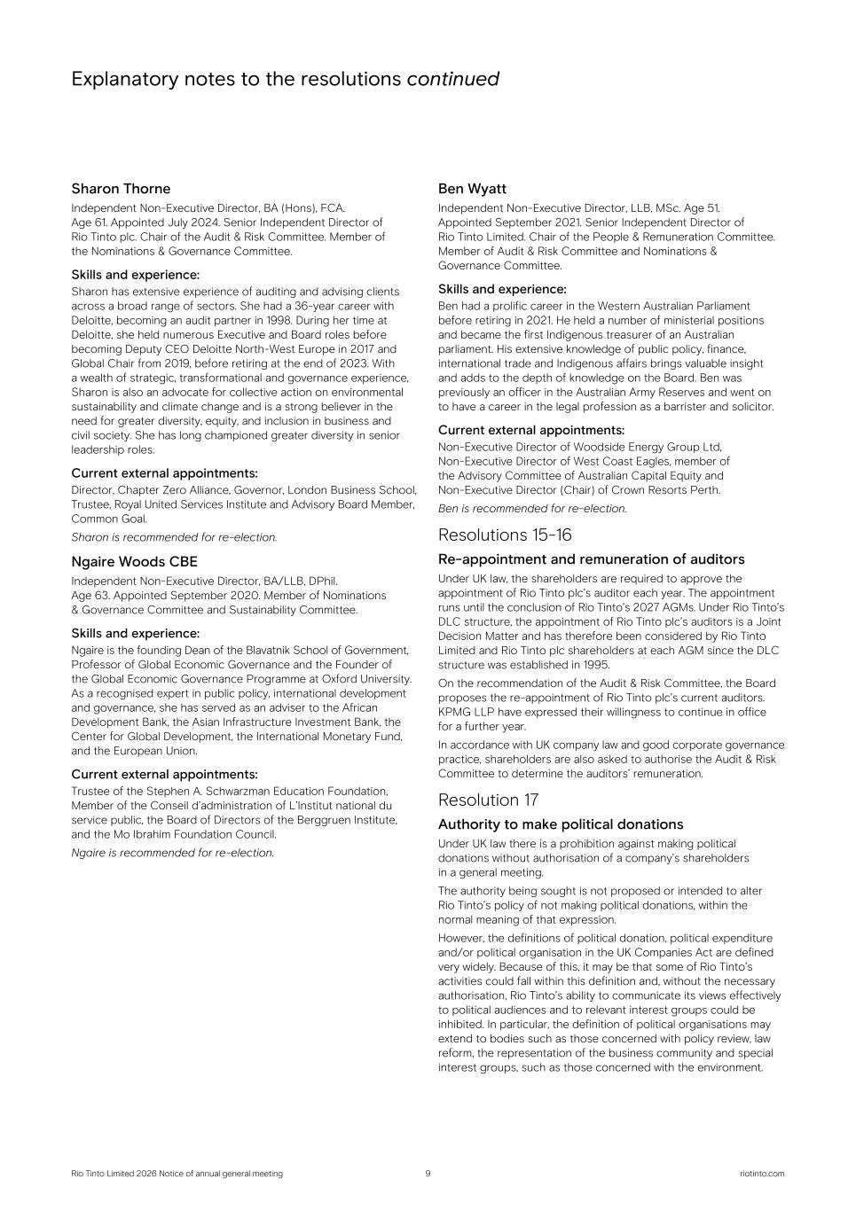Explanatory notes to the resolutions continued Sharon Thorne Independent Non-Executive Director, BA (Hons), FCA. Age 61. Appointed July 2024. Senior Independent Director of Rio Tinto plc. Chair of the Audit & Risk Committee. Member of the Nominations & Governance Committee. Skills and experience: Sharon has extensive experience of auditing and advising clients across a broad range of sectors. She had a 36-year career with Deloitte, becoming an audit partner in 1998. During her time at Deloitte, she held numerous Executive and Board roles before becoming Deputy CEO Deloitte North-West Europe in 2017 and Global Chair from 2019, before retiring at the end of 2023. With a wealth of strategic, transformational and governance experience, Sharon is also an advocate for collective action on environmental sustainability and climate change and is a strong believer in the need for greater diversity, equity, and inclusion in business and civil society. She has long championed greater diversity in senior leadership roles. Current external appointments: Director, Chapter Zero Alliance, Governor, London Business School, Trustee, Royal United Services Institute and Advisory Board Member, Common Goal. Sharon is recommended for re-election. Ngaire Woods CBE Independent Non-Executive Director, BA/LLB, DPhil. Age 63. Appointed September 2020. Member of Nominations & Governance Committee and Sustainability Committee. Skills and experience: Ngaire is the founding Dean of the Blavatnik School of Government, Professor of Global Economic Governance and the Founder of the Global Economic Governance Programme at Oxford University. As a recognised expert in public policy, international development and governance, she has served as an adviser to the African Development Bank, the Asian Infrastructure Investment Bank, the Center for Global Development, the International Monetary Fund, and the European Union. Current external appointments: Trustee of the Stephen A. Schwarzman Education Foundation, Member of the Conseil d’administration of L’Institut national du service public, the Board of Directors of the Berggruen Institute, and the Mo Ibrahim Foundation Council. Ngaire is recommended for re-election. Ben Wyatt Independent Non-Executive Director, LLB, MSc. Age 51. Appointed September 2021. Senior Independent Director of Rio Tinto Limited. Chair of the People & Remuneration Committee. Member of Audit & Risk Committee and Nominations & Governance Committee. Skills and experience: Ben had a prolific career in the Western Australian Parliament before retiring in 2021. He held a number of ministerial positions and became the first Indigenous treasurer of an Australian parliament. His extensive knowledge of public policy, finance, international trade and Indigenous affairs brings valuable insight and adds to the depth of knowledge on the Board. Ben was previously an officer in the Australian Army Reserves and went on to have a career in the legal profession as a barrister and solicitor. Current external appointments: Non-Executive Director of Woodside Energy Group Ltd, Non-Executive Director of West Coast Eagles, member of the Advisory Committee of Australian Capital Equity and Non-Executive Director (Chair) of Crown Resorts Perth. Ben is recommended for re-election. Resolutions 15-16 Re-appointment and remuneration of auditors Under UK law, the shareholders are required to approve the appointment of Rio Tinto plc’s auditor each year. The appointment runs until the conclusion of Rio Tinto’s 2027 AGMs. Under Rio Tinto’s DLC structure, the appointment of Rio Tinto plc’s auditors is a Joint Decision Matter and has therefore been considered by Rio Tinto Limited and Rio Tinto plc shareholders at each AGM since the DLC structure was established in 1995. On the recommendation of the Audit & Risk Committee, the Board proposes the re-appointment of Rio Tinto plc’s current auditors. KPMG LLP have expressed their willingness to continue in office for a further year. In accordance with UK company law and good corporate governance practice, shareholders are also asked to authorise the Audit & Risk Committee to determine the auditors’ remuneration. Resolution 17 Authority to make political donations Under UK law there is a prohibition against making political donations without authorisation of a company’s shareholders in a general meeting. The authority being sought is not proposed or intended to alter Rio Tinto’s policy of not making political donations, within the normal meaning of that expression. However, the definitions of political donation, political expenditure and/or political organisation in the UK Companies Act are defined very widely. Because of this, it may be that some of Rio Tinto’s activities could fall within this definition and, without the necessary authorisation, Rio Tinto’s ability to communicate its views effectively to political audiences and to relevant interest groups could be inhibited. In particular, the definition of political organisations may extend to bodies such as those concerned with policy review, law reform, the representation of the business community and special interest groups, such as those concerned with the environment. 9Rio Tinto Limited 2026 Notice of annual general meeting riotinto.com