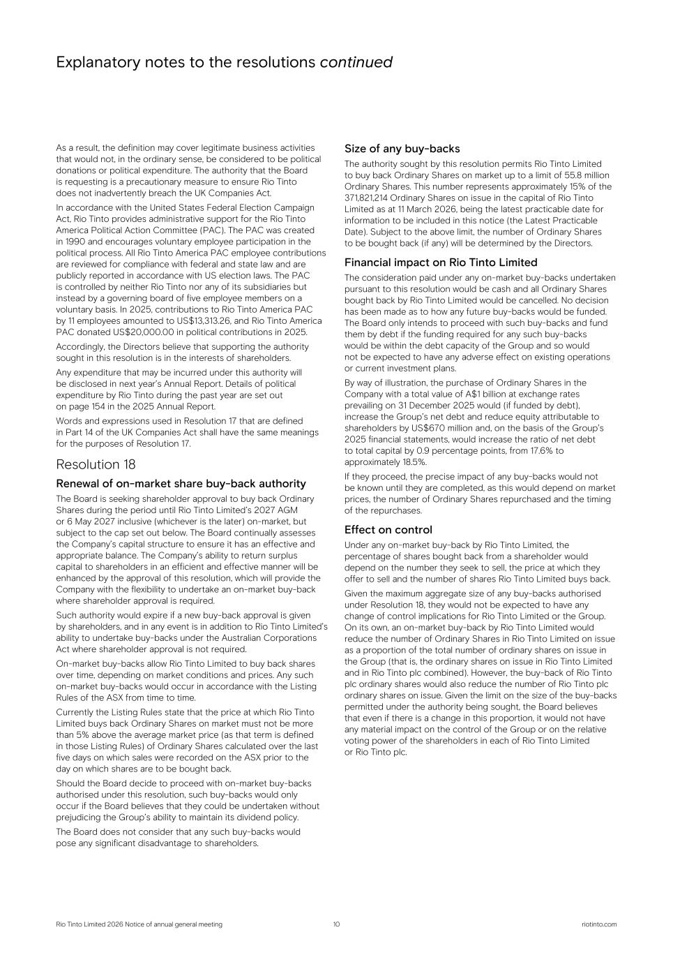 Explanatory notes to the resolutions continued As a result, the definition may cover legitimate business activities that would not, in the ordinary sense, be considered to be political donations or political expenditure. The authority that the Board is requesting is a precautionary measure to ensure Rio Tinto does not inadvertently breach the UK Companies Act. In accordance with the United States Federal Election Campaign Act, Rio Tinto provides administrative support for the Rio Tinto America Political Action Committee (PAC). The PAC was created in 1990 and encourages voluntary employee participation in the political process. All Rio Tinto America PAC employee contributions are reviewed for compliance with federal and state law and are publicly reported in accordance with US election laws. The PAC is controlled by neither Rio Tinto nor any of its subsidiaries but instead by a governing board of five employee members on a voluntary basis. In 2025, contributions to Rio Tinto America PAC by 11 employees amounted to US$13,313.26, and Rio Tinto America PAC donated US$20,000.00 in political contributions in 2025. Accordingly, the Directors believe that supporting the authority sought in this resolution is in the interests of shareholders. Any expenditure that may be incurred under this authority will be disclosed in next year’s Annual Report. Details of political expenditure by Rio Tinto during the past year are set out on page 154 in the 2025 Annual Report. Words and expressions used in Resolution 17 that are defined in Part 14 of the UK Companies Act shall have the same meanings for the purposes of Resolution 17. Resolution 18 Renewal of on-market share buy-back authority The Board is seeking shareholder approval to buy back Ordinary Shares during the period until Rio Tinto Limited’s 2027 AGM or 6 May 2027 inclusive (whichever is the later) on-market, but subject to the cap set out below. The Board continually assesses the Company’s capital structure to ensure it has an effective and appropriate balance. The Company’s ability to return surplus capital to shareholders in an efficient and effective manner will be enhanced by the approval of this resolution, which will provide the Company with the flexibility to undertake an on-market buy-back where shareholder approval is required. Such authority would expire if a new buy-back approval is given by shareholders, and in any event is in addition to Rio Tinto Limited’s ability to undertake buy-backs under the Australian Corporations Act where shareholder approval is not required. On-market buy-backs allow Rio Tinto Limited to buy back shares over time, depending on market conditions and prices. Any such on-market buy-backs would occur in accordance with the Listing Rules of the ASX from time to time. Currently the Listing Rules state that the price at which Rio Tinto Limited buys back Ordinary Shares on market must not be more than 5% above the average market price (as that term is defined in those Listing Rules) of Ordinary Shares calculated over the last five days on which sales were recorded on the ASX prior to the day on which shares are to be bought back. Should the Board decide to proceed with on-market buy-backs authorised under this resolution, such buy-backs would only occur if the Board believes that they could be undertaken without prejudicing the Group’s ability to maintain its dividend policy. The Board does not consider that any such buy-backs would pose any significant disadvantage to shareholders. Size of any buy-backs The authority sought by this resolution permits Rio Tinto Limited to buy back Ordinary Shares on market up to a limit of 55.8 million Ordinary Shares. This number represents approximately 15% of the 371,821,214 Ordinary Shares on issue in the capital of Rio Tinto Limited as at 11 March 2026, being the latest practicable date for information to be included in this notice (the Latest Practicable Date). Subject to the above limit, the number of Ordinary Shares to be bought back (if any) will be determined by the Directors. Financial impact on Rio Tinto Limited The consideration paid under any on-market buy-backs undertaken pursuant to this resolution would be cash and all Ordinary Shares bought back by Rio Tinto Limited would be cancelled. No decision has been made as to how any future buy-backs would be funded. The Board only intends to proceed with such buy-backs and fund them by debt if the funding required for any such buy-backs would be within the debt capacity of the Group and so would not be expected to have any adverse effect on existing operations or current investment plans. By way of illustration, the purchase of Ordinary Shares in the Company with a total value of A$1 billion at exchange rates prevailing on 31 December 2025 would (if funded by debt), increase the Group’s net debt and reduce equity attributable to shareholders by US$670 million and, on the basis of the Group’s 2025 financial statements, would increase the ratio of net debt to total capital by 0.9 percentage points, from 17.6% to approximately 18.5%. If they proceed, the precise impact of any buy-backs would not be known until they are completed, as this would depend on market prices, the number of Ordinary Shares repurchased and the timing of the repurchases. Effect on control Under any on-market buy-back by Rio Tinto Limited, the percentage of shares bought back from a shareholder would depend on the number they seek to sell, the price at which they offer to sell and the number of shares Rio Tinto Limited buys back. Given the maximum aggregate size of any buy-backs authorised under Resolution 18, they would not be expected to have any change of control implications for Rio Tinto Limited or the Group. On its own, an on-market buy-back by Rio Tinto Limited would reduce the number of Ordinary Shares in Rio Tinto Limited on issue as a proportion of the total number of ordinary shares on issue in the Group (that is, the ordinary 