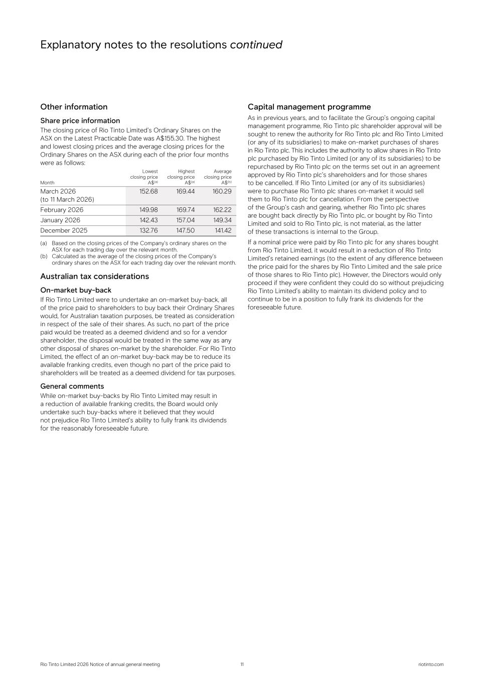 Explanatory notes to the resolutions continued Other information Share price information The closing price of Rio Tinto Limited’s Ordinary Shares on the ASX on the Latest Practicable Date was A$155.30. The highest and lowest closing prices and the average closing prices for the Ordinary Shares on the ASX during each of the prior four months were as follows: Month Lowest closing price A$(a) Highest closing price A$(a) Average closing price A$(b) March 2026 (to 11 March 2026) 152.68 169.44 160.29 February 2026 149.98 169.74 162.22 January 2026 142.43 157.04 149.34 December 2025 132.76 147.50 141.42 (a) Based on the closing prices of the Company’s ordinary shares on the ASX for each trading day over the relevant month. (b) Calculated as the average of the closing prices of the Company’s ordinary shares on the ASX for each trading day over the relevant month. Australian tax considerations On-market buy-back If Rio Tinto Limited were to undertake an on-market buy-back, all of the price paid to shareholders to buy back their Ordinary Shares would, for Australian taxation purposes, be treated as consideration in respect of the sale of their shares. As such, no part of the price paid would be treated as a deemed dividend and so for a vendor shareholder, the disposal would be treated in the same way as any other disposal of shares on-market by the shareholder. For Rio Tinto Limited, the effect of an on-market buy-back may be to reduce its available franking credits, even though no part of the price paid to shareholders will be treated as a deemed dividend for tax purposes. General comments While on-market buy-backs by Rio Tinto Limited may result in a reduction of available franking credits, the Board would only undertake such buy-backs where it believed that they would not prejudice Rio Tinto Limited’s ability to fully frank its dividends for the reasonably foreseeable future. Capital management programme As in previous years, and to facilitate the Group’s ongoing capital management programme, Rio Tinto plc shareholder approval will be sought to renew the authority for Rio Tinto plc and Rio Tinto Limited (or any of its subsidiaries) to make on-market purchases of shares in Rio Tinto plc. This includes the authority to allow shares in Rio Tinto plc purchased by Rio Tinto Limited (or any of its subsidiaries) to be repurchased by Rio Tinto plc on the terms set out in an agreement approved by Rio Tinto plc’s shareholders and for those shares to be cancelled. If Rio Tinto Limited (or any of its subsidiaries) were to purchase Rio Tinto plc shares on-market it would sell them to Rio Tinto plc for cancellation. From the perspective of the Group’s cash and gearing, whether Rio Tinto plc shares are bought back directly by Rio Tinto plc, or bought by Rio Tinto Limited and sold to Rio Tinto plc, is not material, as the latter of these transactions is internal to the Group. If a nominal price were paid by Rio Tinto plc for any shares bought from Rio Tinto Limited, it would result in a reduction of Rio Tinto Limited’s retained earnings (to the extent of any difference between the price paid for the shares by Rio Tinto Limited and the sale price of those shares to Rio Tinto plc). However, the Directors would only proceed if they were confident they could do so without prejudicing Rio Tinto Limited’s ability to maintain its dividend policy and to continue to be in a position to fully frank its dividends for the foreseeable future. 11Rio Tinto Limited 2026 Notice of annual general meeting riotinto.com