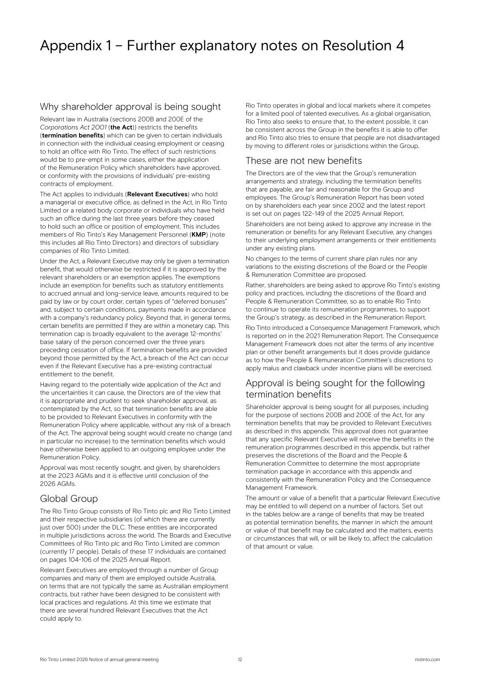 Appendix 1 – Further explanatory notes on Resolution 4 Why shareholder approval is being sought Relevant law in Australia (sections 200B and 200E of the Corporations Act 2001 (the Act)) restricts the benefits (termination benefits) which can be given to certain individuals in connection with the individual ceasing employment or ceasing to hold an office with Rio Tinto. The effect of such restrictions would be to pre-empt in some cases, either the application of the Remuneration Policy which shareholders have approved, or conformity with the provisions of individuals’ pre-existing contracts of employment. The Act applies to individuals (Relevant Executives) who hold a managerial or executive office, as defined in the Act, in Rio Tinto Limited or a related body corporate or individuals who have held such an office during the last three years before they ceased to hold such an office or position of employment. This includes members of Rio Tinto’s Key Management Personnel (KMP) (note this includes all Rio Tinto Directors) and directors of subsidiary companies of Rio Tinto Limited. Under the Act, a Relevant Executive may only be given a termination benefit, that would otherwise be restricted if it is approved by the relevant shareholders or an exemption applies. The exemptions include an exemption for benefits such as statutory entitlements to accrued annual and long-service leave, amounts required to be paid by law or by court order, certain types of “deferred bonuses” and, subject to certain conditions, payments made in accordance with a company’s redundancy policy. Beyond that, in general terms, certain benefits are permitted if they are within a monetary cap. This termination cap is broadly equivalent to the average 12-months’ base salary of the person concerned over the three years preceding cessation of office. If termination benefits are provided beyond those permitted by the Act, a breach of the Act can occur even if the Relevant Executive has a pre-existing contractual entitlement to the benefit. Having regard to the potentially wide application of the Act and the uncertainties it can cause, the Directors are of the view that it is appropriate and prudent to seek shareholder approval, as contemplated by the Act, so that termination benefits are able to be provided to Relevant Executives in conformity with the Remuneration Policy where applicable, without any risk of a breach of the Act. The approval being sought would create no change (and in particular no increase) to the termination benefits which would have otherwise been applied to an outgoing employee under the Remuneration Policy. Approval was most recently sought, and given, by shareholders at the 2023 AGMs and it is effective until conclusion of the 2026 AGMs. Global Group The Rio Tinto Group consists of Rio Tinto plc and Rio Tinto Limited and their respective subsidiaries (of which there are currently just over 500) under the DLC. These entities are incorporated in multiple jurisdictions across the world. The Boards and Executive Committees of Rio Tinto plc and Rio Tinto Limited are common (currently 17 people). Details of these 17 individuals are contained on pages 104-106 of the 2025 Annual Report. Relevant Executives are employed through a number of Group companies and many of them are employed outside Australia, on terms that are not typically the same as Australian employment contracts, but rather have been designed to be consistent with local practices and regulations. At this time we estimate that there are several hundred Relevant Executives that the Act could apply to. Rio Tinto operates in global and local markets where it competes for a limited pool of talented executives. As a global organisation, Rio Tinto also seeks to ensure that, to the extent possible, it can be consistent across the Group in the benefits it is able to offer and Rio Tinto also tries to ensure that people are not disadvantaged by moving to different roles or jurisdictions within the Group. These are not new benefits The Directors are of the view that the Group’s remuneration arrangements and strategy, including the termination benefits that are payable, are fair and reasonable for the Group and employees. The Group’s Remuneration Report has been voted on by shareholders each year since 2002 and the latest report is set out on pages 122-149 of the 2025 Annual Report. Shareholders are not being asked to approve any increase in the remuneration or benefits for any Relevant Executive, any changes to their underlying employment arrangements or their entitlements under any existing plans. No changes to the terms of current share plan rules nor any variations to the existing discretions of the Board or the People & Remuneration Committee are proposed. Rather, shareholders are being asked to approve Rio Tinto’s existing policy and practices, including the discretions of the Board and People & Remuneration Committee, so as to enable Rio Tinto to continue to operate its remuneration programmes, to support the Group’s strategy, as described in the Remuneration Report. Rio Tinto introduced a Consequence Management Framework, which is reported on in the 2021 Remuneration Report. The Consequence Management Framework does not alter the terms of any incentive plan or other benefit arrangements but it does provide guidance as to how the People & Remuneration Committee’s discretions to apply malus and clawback under incentive plans will be exercised. Approval is being sought for the following termination benefits Shareholder approval is being sought for all purposes, including for the purpose of sections 200B and 200E of the Act, for any termination benefits that may be provided to Relevant Executives as described in this appendix. This approval does not guarantee that any specific Relevant Executive will receive the benefits in the remuneration programmes described in this appendix, but rather preserves the discretions of the Board and