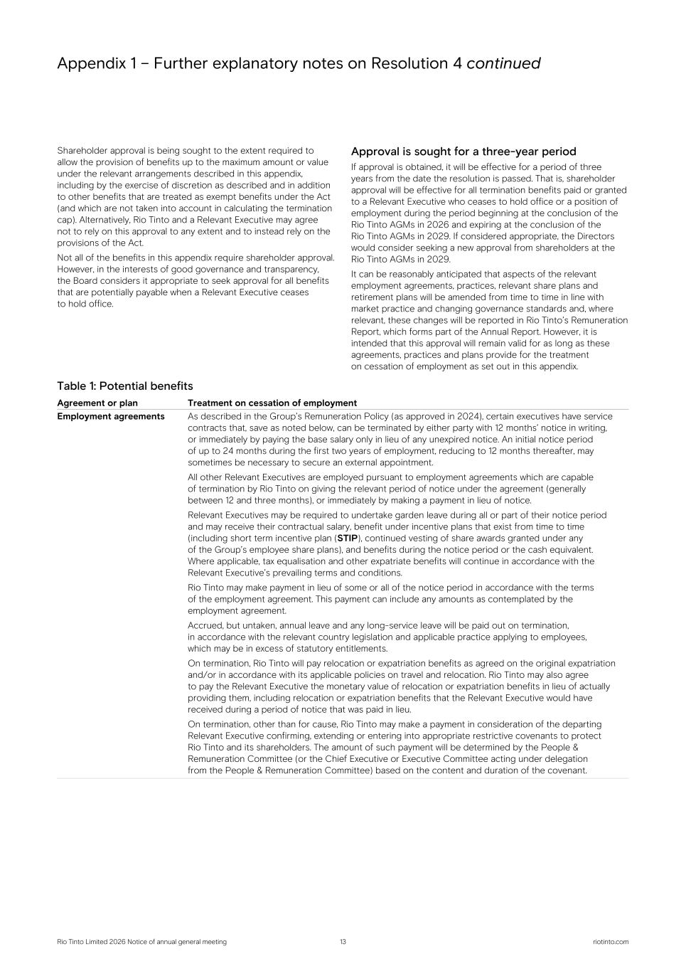 Appendix 1 – Further explanatory notes on Resolution 4 continued Shareholder approval is being sought to the extent required to allow the provision of benefits up to the maximum amount or value under the relevant arrangements described in this appendix, including by the exercise of discretion as described and in addition to other benefits that are treated as exempt benefits under the Act (and which are not taken into account in calculating the termination cap). Alternatively, Rio Tinto and a Relevant Executive may agree not to rely on this approval to any extent and to instead rely on the provisions of the Act. Not all of the benefits in this appendix require shareholder approval. However, in the interests of good governance and transparency, the Board considers it appropriate to seek approval for all benefits that are potentially payable when a Relevant Executive ceases to hold office. Approval is sought for a three-year period If approval is obtained, it will be effective for a period of three years from the date the resolution is passed. That is, shareholder approval will be effective for all termination benefits paid or granted to a Relevant Executive who ceases to hold office or a position of employment during the period beginning at the conclusion of the Rio Tinto AGMs in 2026 and expiring at the conclusion of the Rio Tinto AGMs in 2029. If considered appropriate, the Directors would consider seeking a new approval from shareholders at the Rio Tinto AGMs in 2029. It can be reasonably anticipated that aspects of the relevant employment agreements, practices, relevant share plans and retirement plans will be amended from time to time in line with market practice and changing governance standards and, where relevant, these changes will be reported in Rio Tinto’s Remuneration Report, which forms part of the Annual Report. However, it is intended that this approval will remain valid for as long as these agreements, practices and plans provide for the treatment on cessation of employment as set out in this appendix. Table 1: Potential benefits Agreement or plan Treatment on cessation of employment Employment agreements As described in the Group’s Remuneration Policy (as approved in 2024), certain executives have service contracts that, save as noted below, can be terminated by either party with 12 months’ notice in writing, or immediately by paying the base salary only in lieu of any unexpired notice. An initial notice period of up to 24 months during the first two years of employment, reducing to 12 months thereafter, may sometimes be necessary to secure an external appointment. All other Relevant Executives are employed pursuant to employment agreements which are capable of termination by Rio Tinto on giving the relevant period of notice under the agreement (generally between 12 and three months), or immediately by making a payment in lieu of notice. Relevant Executives may be required to undertake garden leave during all or part of their notice period and may receive their contractual salary, benefit under incentive plans that exist from time to time (including short term incentive plan (STIP), continued vesting of share awards granted under any of the Group’s employee share plans), and benefits during the notice period or the cash equivalent. Where applicable, tax equalisation and other expatriate benefits will continue in accordance with the Relevant Executive’s prevailing terms and conditions. Rio Tinto may make payment in lieu of some or all of the notice period in accordance with the terms of the employment agreement. This payment can include any amounts as contemplated by the employment agreement. Accrued, but untaken, annual leave and any long-service leave will be paid out on termination, in accordance with the relevant country legislation and applicable practice applying to employees, which may be in excess of statutory entitlements. On termination, Rio Tinto will pay relocation or expatriation benefits as agreed on the original expatriation and/or in accordance with its applicable policies on travel and relocation. Rio Tinto may also agree to pay the Relevant Executive the monetary value of relocation or expatriation benefits in lieu of actually providing them, including relocation or expatriation benefits that the Relevant Executive would have received during a period of notice that was paid in lieu. On termination, other than for cause, Rio Tinto may make a payment in consideration of the departing Relevant Executive confirming, extending or entering into appropriate restrictive covenants to protect Rio Tinto and its shareholders. The amount of such payment will be determined by the People & Remuneration Committee (or the Chief Executive or Executive Committee acting under delegation from the People & Remuneration Committee) based on the content and duration of the covenant. 13Rio Tinto Limited 2026 Notice of annual general meeting riotinto.com