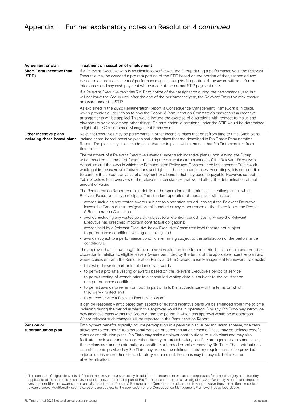 Appendix 1 – Further explanatory notes on Resolution 4 continued Agreement or plan Treatment on cessation of employment Short Term Incentive Plan (STIP) If a Relevant Executive who is an eligible leaver1 leaves the Group during a performance year, the Relevant Executive may be awarded a pro rata portion of the STIP based on the portion of the year served and based on actual assessment of performance against targets. No portion of the award will be deferred into shares and any cash payment will be made at the normal STIP payment date. If a Relevant Executive provides Rio Tinto notice of their resignation during the performance year, but will not leave the Group until after the end of the performance year, the Relevant Executive may receive an award under the STIP. As explained in the 2025 Remuneration Report, a Consequence Management Framework is in place, which provides guidelines as to how the People & Remuneration Committee’s discretions in incentive arrangements will be applied. This would include the exercise of discretions with respect to malus and clawback provisions, among other things. On termination, discretions under the STIP would be determined in light of the Consequence Management Framework. Other incentive plans, including share-based plans Relevant Executives may be participants in other incentive plans that exist from time to time. Such plans include share-based incentive plans and other plans that are described in Rio Tinto’s Remuneration Report. The plans may also include plans that are in place within entities that Rio Tinto acquires from time to time. The treatment of a Relevant Executive’s awards under such incentive plans upon leaving the Group will depend on a number of factors, including the particular circumstances of the Relevant Executive’s departure and the ways in which the Remuneration Policy and Consequence Management Framework would guide the exercise of discretions and rights in those circumstances. Accordingly, it is not possible to confirm the amount or value of a payment or a benefit that may become payable. However, set out in Table 2 below, is an overview of the relevant circumstances that would affect the determination of that amount or value. The Remuneration Report contains details of the operation of the principal incentive plans in which Relevant Executives may participate. The standard operation of those plans will include: • awards, including any vested awards subject to a retention period, lapsing if the Relevant Executive leaves the Group due to resignation, misconduct or any other reason at the discretion of the People & Remuneration Committee; • awards, including any vested awards subject to a retention period, lapsing where the Relevant Executive has breached important contractual obligations; • awards held by a Relevant Executive below Executive Committee level that are not subject to performance conditions vesting on leaving; and • awards subject to a performance condition remaining subject to the satisfaction of the performance condition/s. The approval that is now sought to be renewed would continue to permit Rio Tinto to retain and exercise discretion in relation to eligible leavers (where permitted by the terms of the applicable incentive plan and where consistent with the Remuneration Policy and the Consequence Management Framework) to decide: • to vest or lapse (in part or in full) incentive awards; • to permit a pro-rata vesting of awards based on the Relevant Executive’s period of service; • to permit vesting of awards prior to a scheduled vesting date but subject to the satisfaction of a performance condition; • to permit awards to remain on foot (in part or in full) in accordance with the terms on which they were granted; and • to otherwise vary a Relevant Executive’s awards. It can be reasonably anticipated that aspects of existing incentive plans will be amended from time to time, including during the period in which this approval would be in operation. Similarly, Rio Tinto may introduce new incentive plans within the Group during the period in which this approval would be in operation. Where relevant such changes will be reported in the Remuneration Report. Pension or superannuation plan Employment benefits typically include participation in a pension plan, superannuation scheme, or a cash allowance to contribute to a personal pension or superannuation scheme. These may be defined benefit plans or contribution plans. Rio Tinto may make employer contributions to such plans and may also facilitate employee contributions either directly or through salary sacrifice arrangements. In some cases, these plans are funded externally or constitute unfunded promises made by Rio Tinto. The contributions or entitlements provided by Rio Tinto may exceed the minimum statutory requirement or be provided in jurisdictions where there is no statutory requirement. Pensions may be payable before, at or after termination. 1. The concept of eligible leaver is defined in the relevant plans or policy. In addition to circumstances such as departures for ill health, injury and disability, applicable plans and policies can also include a discretion on the part of Rio Tinto to treat a person as an eligible leaver. Generally, where plans impose vesting conditions on awards, the plans also grant to the People & Remuneration Committee the discretion to vary or waive those conditions in certain circumstances. Additionally, such discretions are subject to the application of the Consequence Management Framework described above. 14Rio Tinto Limited 2026 Notice of annual general meeting riotinto.com