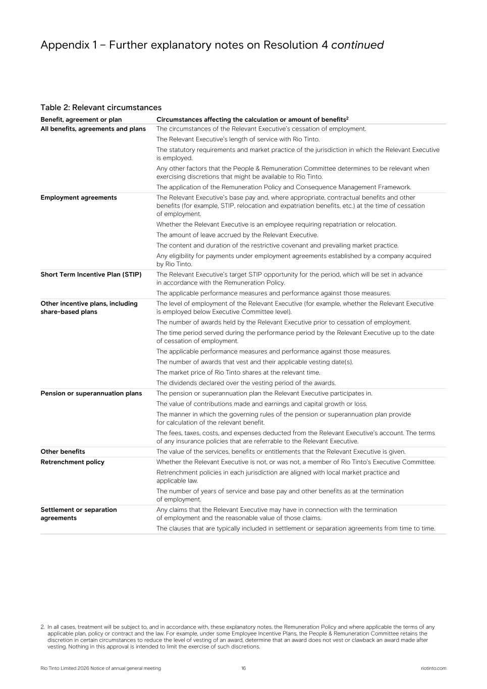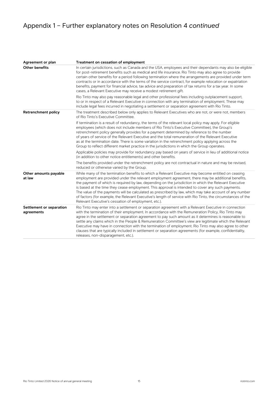 Appendix 1 – Further explanatory notes on Resolution 4 continued Agreement or plan Treatment on cessation of employment Other benefits In certain jurisdictions, such as Canada and the USA, employees and their dependants may also be eligible for post-retirement benefits such as medical and life insurance. Rio Tinto may also agree to provide certain other benefits for a period following termination where the arrangements are provided under term contracts or in accordance with the terms of the service contract, for example relocation or expatriation benefits, payment for financial advice, tax advice and preparation of tax returns for a tax year. In some cases, a Relevant Executive may receive a modest retirement gift. Rio Tinto may also pay reasonable legal and other professional fees including outplacement support, to or in respect of a Relevant Executive in connection with any termination of employment. These may include legal fees incurred in negotiating a settlement or separation agreement with Rio Tinto. Retrenchment policy The treatment described below only applies to Relevant Executives who are not, or were not, members of Rio Tinto’s Executive Committee. If termination is a result of redundancy, the terms of the relevant local policy may apply. For eligible employees (which does not include members of Rio Tinto’s Executive Committee), the Group’s retrenchment policy generally provides for a payment determined by reference to the number of years of service of the Relevant Executive and the total remuneration of the Relevant Executive as at the termination date. There is some variation in the retrenchment policy applying across the Group to reflect different market practice in the jurisdictions in which the Group operates. Applicable policies may provide for redundancy pay based on years of service in lieu of additional notice (in addition to other notice entitlements) and other benefits. The benefits provided under the retrenchment policy are not contractual in nature and may be revised, reduced or otherwise varied by the Group. Other amounts payable at law While many of the termination benefits to which a Relevant Executive may become entitled on ceasing employment are provided under the relevant employment agreement, there may be additional benefits, the payment of which is required by law, depending on the jurisdiction in which the Relevant Executive is based at the time they cease employment. This approval is intended to cover any such payments. The value of the payments will be calculated as prescribed by law, which may take account of any number of factors (for example, the Relevant Executive’s length of service with Rio Tinto, the circumstances of the Relevant Executive’s cessation of employment, etc.). Settlement or separation agreements Rio Tinto may enter into a settlement or separation agreement with a Relevant Executive in connection with the termination of their employment. In accordance with the Remuneration Policy, Rio Tinto may agree in the settlement or separation agreement to pay such amount as it determines is reasonable to settle any claims which in the People & Remuneration Committee’s view are legitimate which the Relevant Executive may have in connection with the termination of employment. Rio Tinto may also agree to other clauses that are typically included in settlement or separation agreements (for example, confidentiality, releases, non-disparagement, etc.). 15Rio Tinto Limited 2026 Notice of annual general meeting riotinto.com