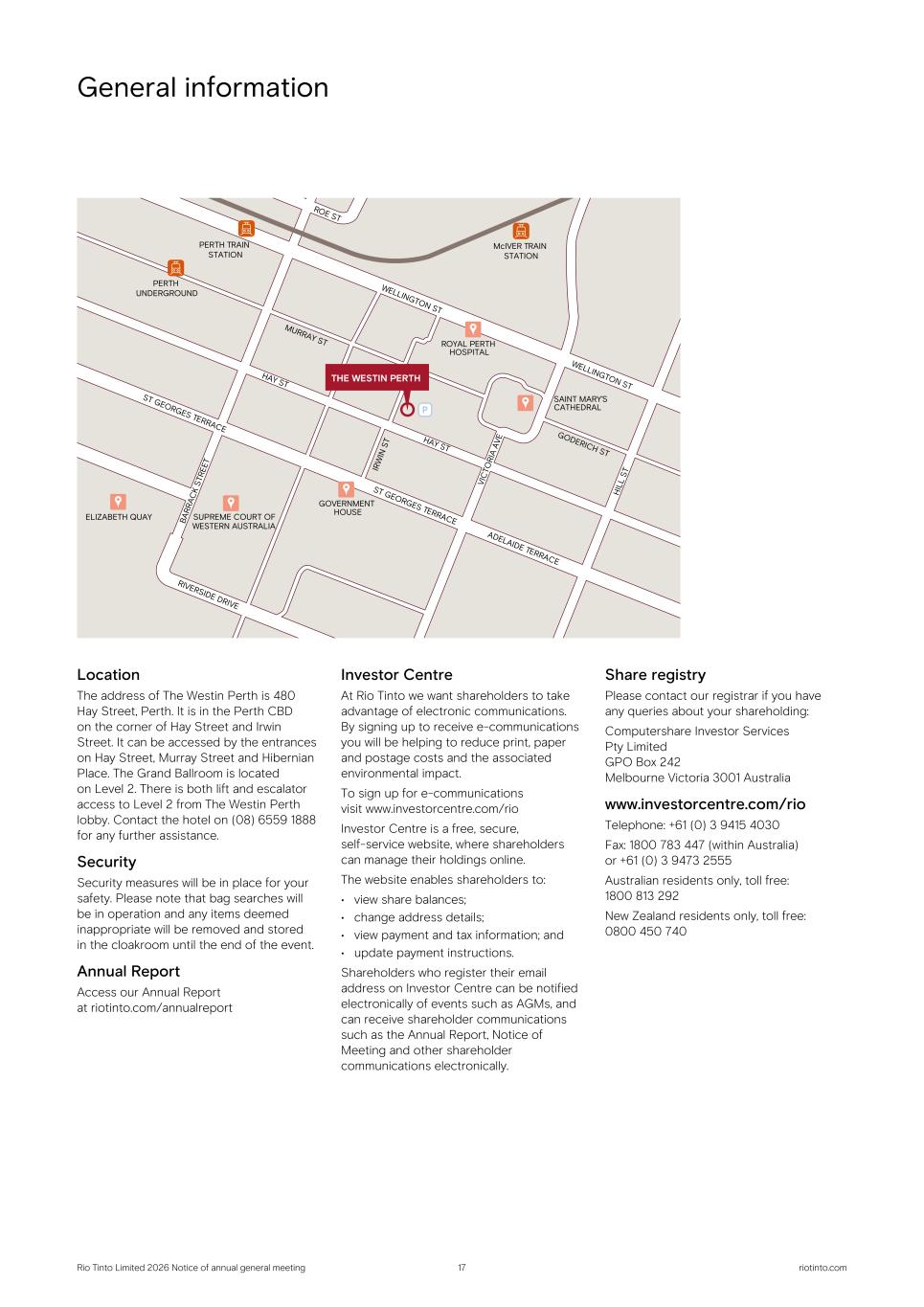 General information Location The address of The Westin Perth is 480 Hay Street, Perth. It is in the Perth CBD on the corner of Hay Street and Irwin Street. It can be accessed by the entrances on Hay Street, Murray Street and Hibernian Place. The Grand Ballroom is located on Level 2. There is both lift and escalator access to Level 2 from The Westin Perth lobby. Contact the hotel on (08) 6559 1888 for any further assistance. Security Security measures will be in place for your safety. Please note that bag searches will be in operation and any items deemed inappropriate will be removed and stored in the cloakroom until the end of the event. Annual Report Access our Annual Report at riotinto.com/annualreport Investor Centre At Rio Tinto we want shareholders to take advantage of electronic communications. By signing up to receive e-communications you will be helping to reduce print, paper and postage costs and the associated environmental impact. To sign up for e-communications visit www.investorcentre.com/rio Investor Centre is a free, secure, self-service website, where shareholders can manage their holdings online. The website enables shareholders to: • view share balances; • change address details; • view payment and tax information; and • update payment instructions. Shareholders who register their email address on Investor Centre can be notified electronically of events such as AGMs, and can receive shareholder communications such as the Annual Report, Notice of Meeting and other shareholder communications electronically. Share registry Please contact our registrar if you have any queries about your shareholding: Computershare Investor Services Pty Limited GPO Box 242 Melbourne Victoria 3001 Australia www.investorcentre.com/rio Telephone: +61 (0) 3 9415 4030 Fax: 1800 783 447 (within Australia) or +61 (0) 3 9473 2555 Australian residents only, toll free: 1800 813 292 New Zealand residents only, toll free: 0800 450 740 ROYAL PERTH HOSPITAL SAINT MARY’S CATHEDRAL ST GEORGES TERRACE ADELAIDE TERRACE WELLINGTON ST WELLINGTON ST HAY ST MURRAY ST GODERICH ST H IL L ST VI C TO RI A A VE IR W IN S T GOVERNMENT HOUSE RIVERSIDE DRIVE BA RR A C K ST RE ET HAY ST ELIZABETH QUAY ROE ST McIVER TRAIN STATION PERTH TRAIN STATION PERTH UNDERGROUND ST GEORGES TERRACE SUPREME COURT OF WESTERN AUSTRALIA THE WESTIN PERTH 17Rio Tinto Limited 2026 Notice of annual general meeting riotinto.com