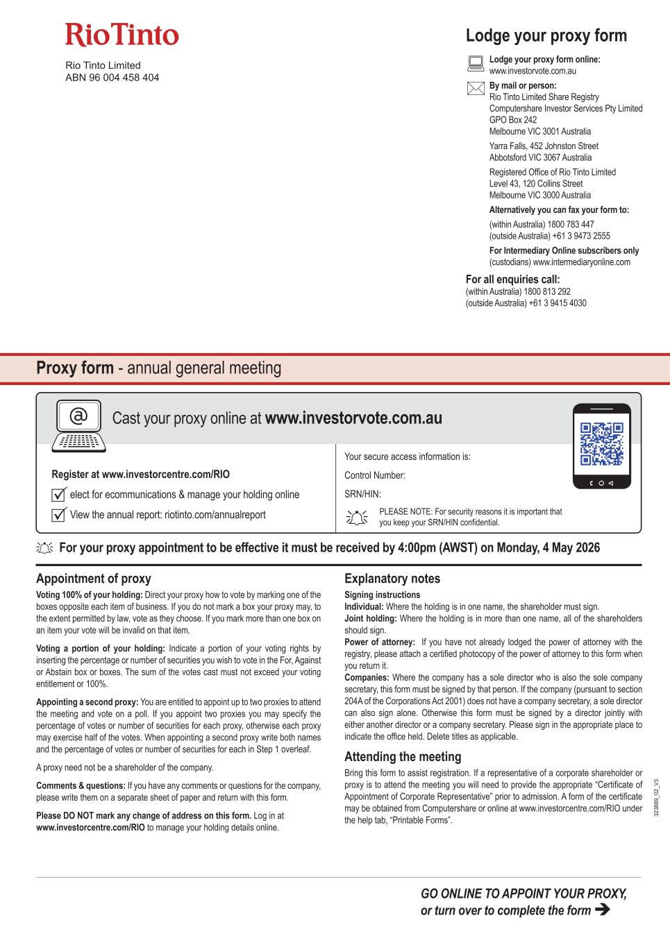 32 36 89 _0 2_ V3 : Lodge your proxy form online: www.investorvote.com.au * By mail or person:  Rio Tinto Limited Share Registry Computershare Investor Services Pty Limited GPO Box 242 Melbourne VIC 3001 Australia  Yarra Falls, 452 Johnston Street Abbotsford VIC 3067 Australia Registered Office of Rio Tinto Limited Level 43, 120 Collins Street Melbourne VIC 3000 Australia Alternatively you can fax your form to: (within Australia) 1800 783 447 (outside Australia) +61 3 9473 2555 For Intermediary Online subscribers only (custodians) www.intermediaryonline.com For all enquiries call: (within Australia) 1800 813 292 (outside Australia) +61 3 9415 4030 Your secure access information is: Control Number: SRN/HIN:  PLEASE NOTE: For security reasons it is important that you keep your SRN/HIN confidential. Cast your proxy online at www.investorvote.com.au Appointment of proxy Voting 100% of your holding: Direct your proxy how to vote by marking one of the boxes opposite each item of business. If you do not mark a box your proxy may, to the extent permitted by law, vote as they choose. If you mark more than one box on an item your vote will be invalid on that item. Voting a portion of your holding: Indicate a portion of your voting rights by inserting the percentage or number of securities you wish to vote in the For, Against or Abstain box or boxes. The sum of the votes cast must not exceed your voting entitlement or 100%. Appointing a second proxy: You are entitled to appoint up to two proxies to attend the meeting and vote on a poll. If you appoint two proxies you may specify the percentage of votes or number of securities for each proxy, otherwise each proxy may exercise half of the votes. When appointing a second proxy write both names and the percentage of votes or number of securities for each in Step 1 overleaf. A proxy need not be a shareholder of the company. Comments & questions: If you have any comments or questions for the company, please write them on a separate sheet of paper and return with this form. Please DO NOT mark any change of address on this form. Log in at www.investorcentre.com/RIO to manage your holding details online. Explanatory notes Signing instructions Individual: Where the holding is in one name, the shareholder must sign. Joint holding: Where the holding is in more than one name, all of the shareholders should sign. Power of attorney: If you have not already lodged the power of attorney with the registry, please attach a certified photocopy of the power of attorney to this form when you return it. Companies: Where the company has a sole director who is also the sole company secretary, this form must be signed by that person. If the company (pursuant to section 204A of the Corporations Act 2001) does not have a company secretary, a sole director can also sign alone. Otherwise this form must be signed by a director jointly with either another director or a company secretary. Please sign in the appropriate place to indicate the office held. Delete titles as applicable. Attending the meeting Bring this form to assist registration. If a representative of a corporate shareholder or proxy is to attend the meeting you will need to provide the appropriate “Certificate of Appointment of Corporate Representative” prior to admission. A form of the certificate may be obtained from Computershare or online at www.investorcentre.com/RIO under the help tab, “Printable Forms”. For your proxy appointment to be effective it must be received by 4:00pm (AWST) on Monday, 4 May 2026 Lodge your proxy form GO ONLINE TO APPOINT YOUR PROXY, or turn over to complete the form è Register at www.investorcentre.com/RIO elect for ecommunications & manage your holding online View the annual report: riotinto.com/annualreport Proxy form - annual general meeting