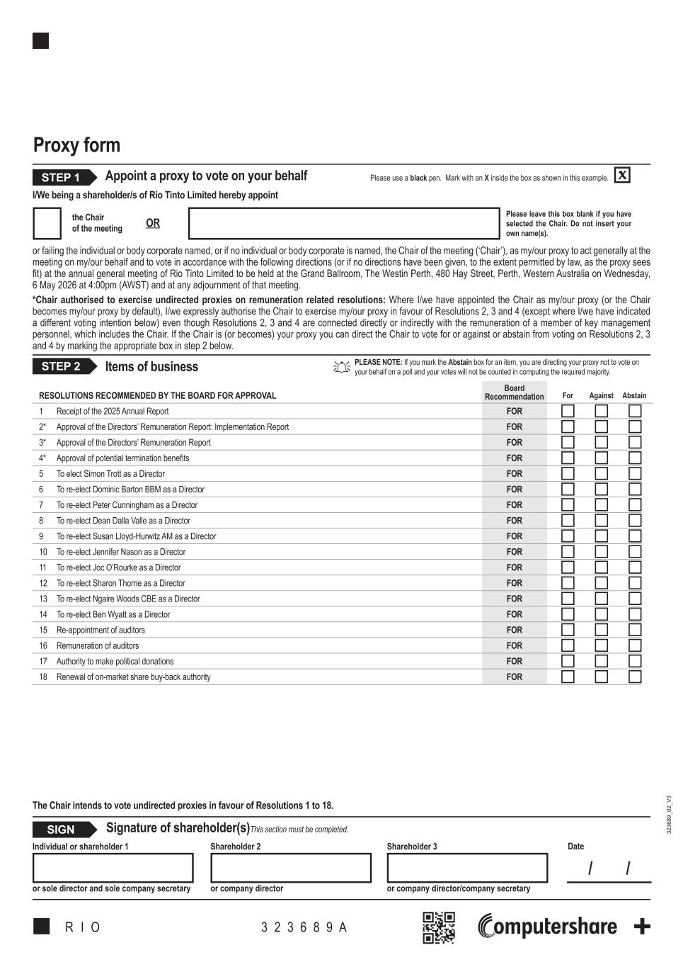 32 36 89 _0 2_ V3 Items of businessSTEP 2 Appoint a proxy to vote on your behalf Signature of shareholder(s)This section must be completed.SIGN STEP 1 PLEASE NOTE: If you mark the Abstain box for an item, you are directing your proxy not to vote on your behalf on a poll and your votes will not be counted in computing the required majority. Date / / Individual or shareholder 1 or sole director and sole company secretary Shareholder 2 or company director Shareholder 3 or company director/company secretary Please use a black pen. Mark with an X inside the box as shown in this example. X the Chair of the meeting Please leave this box blank if you have selected the Chair. Do not insert your own name(s). OR R I O 3 2 3 6 8 9 A Proxy form I/We being a shareholder/s of Rio Tinto Limited hereby appoint or failing the individual or body corporate named, or if no individual or body corporate is named, the Chair of the meeting (‘Chair’), as my/our proxy to act generally at the meeting on my/our behalf and to vote in accordance with the following directions (or if no directions have been given, to the extent permitted by law, as the proxy sees fit) at the annual general meeting of Rio Tinto Limited to be held at the Grand Ballroom, The Westin Perth, 480 Hay Street, Perth, Western Australia on Wednesday, 6 May 2026 at 4:00pm (AWST) and at any adjournment of that meeting. *Chair authorised to exercise undirected proxies on remuneration related resolutions: Where I/we have appointed the Chair as my/our proxy (or the Chair becomes my/our proxy by default), I/we expressly authorise the Chair to exercise my/our proxy in favour of Resolutions 2, 3 and 4 (except where I/we have indicated a different voting intention below) even though Resolutions 2, 3 and 4 are connected directly or indirectly with the remuneration of a member of key management personnel, which includes the Chair. If the Chair is (or becomes) your proxy you can direct the Chair to vote for or against or abstain from voting on Resolutions 2, 3 and 4 by marking the appropriate box in step 2 below. RESOLUTIONS RECOMMENDED BY THE BOARD FOR APPROVAL Board Recommendation For Against Abstain 1 Receipt of the 2025 Annual Report FOR 2* Approval of the Directors’ Remuneration Report: Implementation Report FOR 3* Approval of the Directors’ Remuneration Report FOR 4* Approval of potential termination benefits FOR 5 To elect Simon Trott as a Director FOR 6 To re-elect Dominic Barton BBM as a Director FOR 7 To re-elect Peter Cunningham as a Director FOR 8 To re-elect Dean Dalla Valle as a Director FOR 9 To re-elect Susan Lloyd-Hurwitz AM as a Director FOR 10 To re-elect Jennifer Nason as a Director FOR 11 To re-elect Joc O’Rourke as a Director FOR 12 To re-elect Sharon Thorne as a Director FOR 13 To re-elect Ngaire Woods CBE as a Director FOR 14 To re-elect Ben Wyatt as a Director FOR 15 Re-appointment of auditors FOR 16 Remuneration of auditors FOR 17 Authority to make political donations FOR 18 Renewal of on-market share buy-back authority FOR The Chair intends to vote undirected proxies in favour of Resolutions 1 to 18.