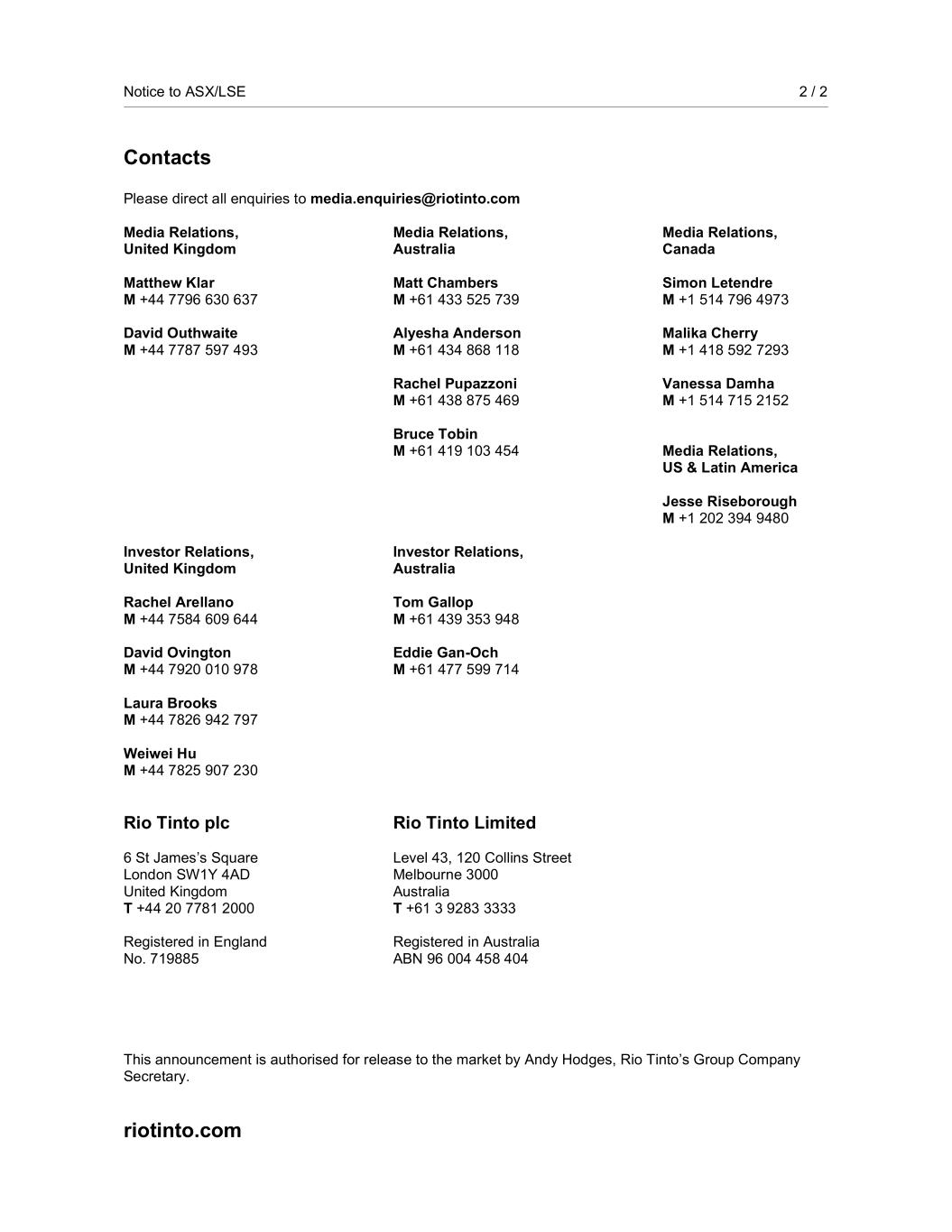 Notice to ASX/LSE 2 / 2 Contacts Please direct all enquiries to media.enquiries@riotinto.com Media Relations, United Kingdom Matthew Klar M +44 7796 630 637 David Outhwaite M +44 7787 597 493 Media Relations, Australia Matt Chambers M +61 433 525 739 Alyesha Anderson M +61 434 868 118 Rachel Pupazzoni M +61 438 875 469 Bruce Tobin  M +61 419 103 454 Media Relations, Canada Simon Letendre M +1 514 796 4973 Malika Cherry M +1 418 592 7293 Vanessa Damha M +1 514 715 2152 Media Relations, US & Latin America Jesse Riseborough M +1 202 394 9480 Investor Relations, United Kingdom Rachel Arellano M +44 7584 609 644 David Ovington M +44 7920 010 978 Laura Brooks M +44 7826 942 797 Weiwei Hu M +44 7825 907 230 Investor Relations, Australia Tom Gallop M +61 439 353 948 Eddie Gan-Och M +61 477 599 714 Rio Tinto plc 6 St James’s Square London SW1Y 4AD United Kingdom T +44 20 7781 2000 Registered in England No. 719885 Rio Tinto Limited Level 43, 120 Collins Street Melbourne 3000 Australia T +61 3 9283 3333 Registered in Australia ABN 96 004 458 404 This announcement is authorised for release to the market by Andy Hodges, Rio Tinto’s Group Company Secretary. riotinto.com