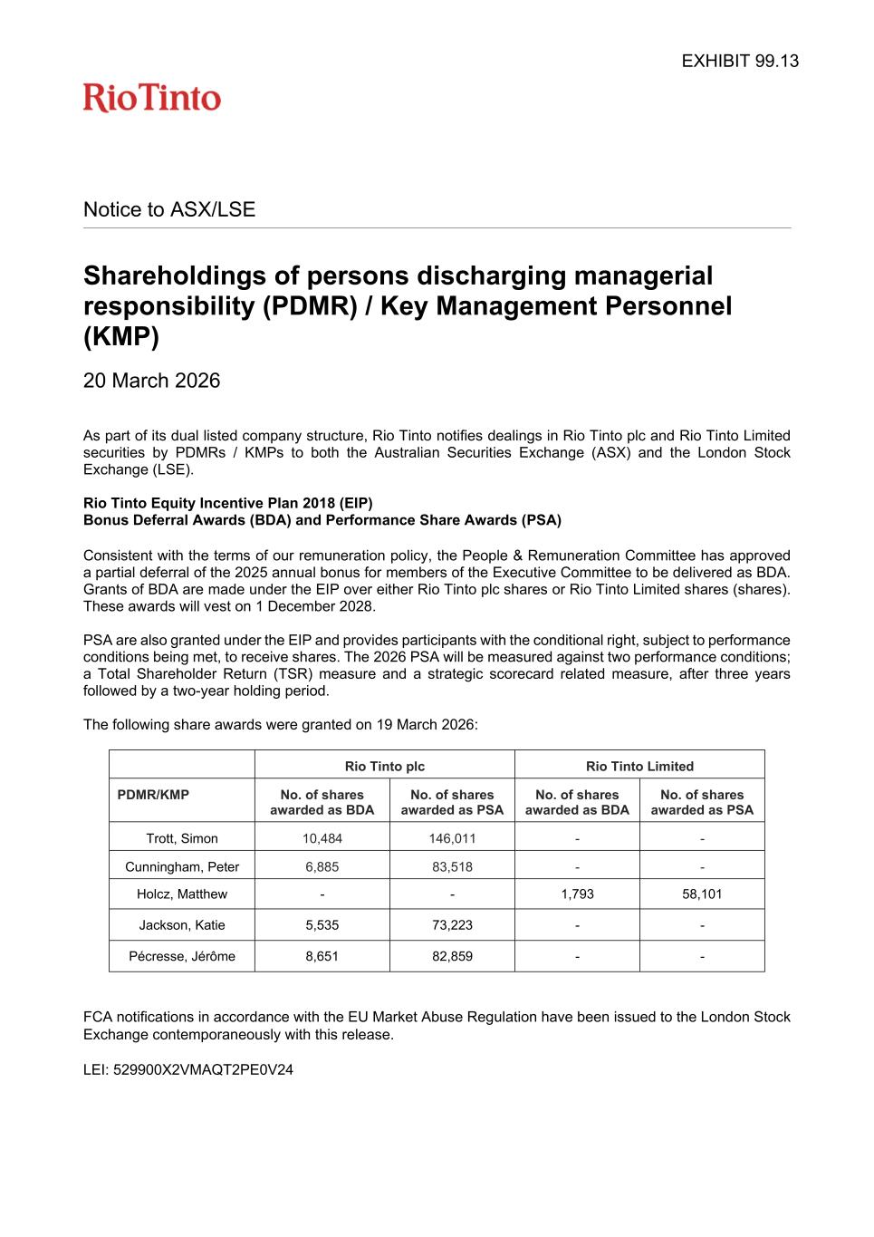 Notice to ASX/LSE Shareholdings of persons discharging managerial responsibility (PDMR) / Key Management Personnel (KMP) As part of its dual listed company structure, Rio Tinto notifies dealings in Rio Tinto plc and Rio Tinto Limited securities by PDMRs / KMPs to both the Australian Securities Exchange (ASX) and the London Stock Exchange (LSE). Rio Tinto Equity Incentive Plan 2018 (EIP) Bonus Deferral Awards (BDA) and Performance Share Awards (PSA) Consistent with the terms of our remuneration policy, the People & Remuneration Committee has approved a partial deferral of the 2025 annual bonus for members of the Executive Committee to be delivered as BDA. Grants of BDA are made under the EIP over either Rio Tinto plc shares or Rio Tinto Limited shares (shares). These awards will vest on 1 December 2028. PSA are also granted under the EIP and provides participants with the conditional right, subject to performance conditions being met, to receive shares. The 2026 PSA will be measured against two performance conditions; a Total Shareholder Return (TSR) measure and a strategic scorecard related measure, after three years followed by a two-year holding period. The following share awards were granted on 19 March 2026: Rio Tinto plc Rio Tinto Limited PDMR/KMP No. of shares awarded as BDA No. of shares awarded as PSA No. of shares awarded as BDA No. of shares awarded as PSA Trott, Simon 10,484 146,011 - - Cunningham, Peter 6,885 83,518 - - Holcz, Matthew - - 1,793 58,101 Jackson, Katie 5,535 73,223 - - Pécresse, Jérôme 8,651 82,859 - - FCA notifications in accordance with the EU Market Abuse Regulation have been issued to the London Stock Exchange contemporaneously with this release. LEI: 529900X2VMAQT2PE0V24 20 March 2026 EXHIBIT 99.13