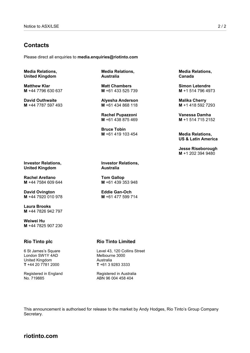 Notice to ASX/LSE 2 / 2 Contacts Please direct all enquiries to media.enquiries@riotinto.com Media Relations, United Kingdom Matthew Klar M +44 7796 630 637 David Outhwaite M +44 7787 597 493 Media Relations, Australia Matt Chambers M +61 433 525 739 Alyesha Anderson M +61 434 868 118 Rachel Pupazzoni M +61 438 875 469 Bruce Tobin  M +61 419 103 454 Media Relations, Canada Simon Letendre M +1 514 796 4973 Malika Cherry M +1 418 592 7293 Vanessa Damha M +1 514 715 2152 Media Relations, US & Latin America Jesse Riseborough M +1 202 394 9480 Investor Relations, United Kingdom Rachel Arellano M +44 7584 609 644 David Ovington M +44 7920 010 978 Laura Brooks M +44 7826 942 797 Weiwei Hu M +44 7825 907 230 Investor Relations, Australia Tom Gallop M +61 439 353 948 Eddie Gan-Och M +61 477 599 714 riotinto.com This announcement is authorised for release to the market by Andy Hodges, Rio Tinto’s Group Company Secretary. Rio Tinto plc 6 St James’s Square London SW1Y 4AD United Kingdom T +44 20 7781 2000 Registered in England No. 719885 Rio Tinto Limited Level 43, 120 Collins Street Melbourne 3000 Australia T +61 3 9283 3333 Registered in Australia ABN 96 004 458 404